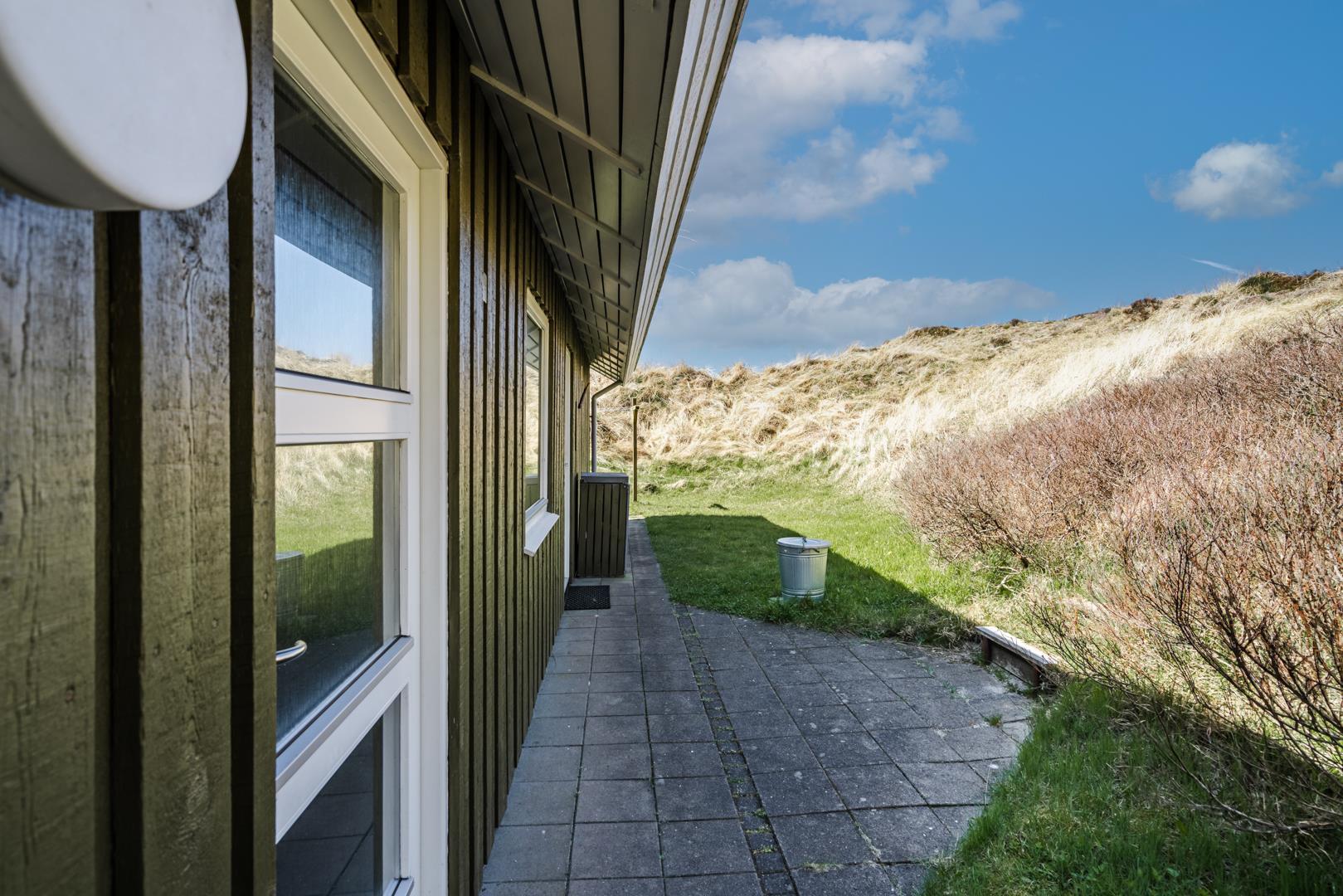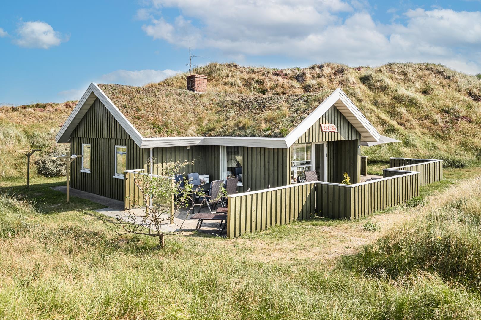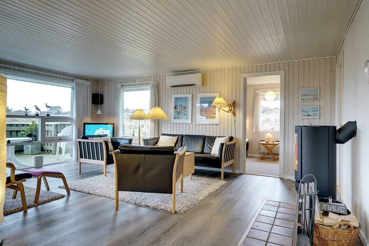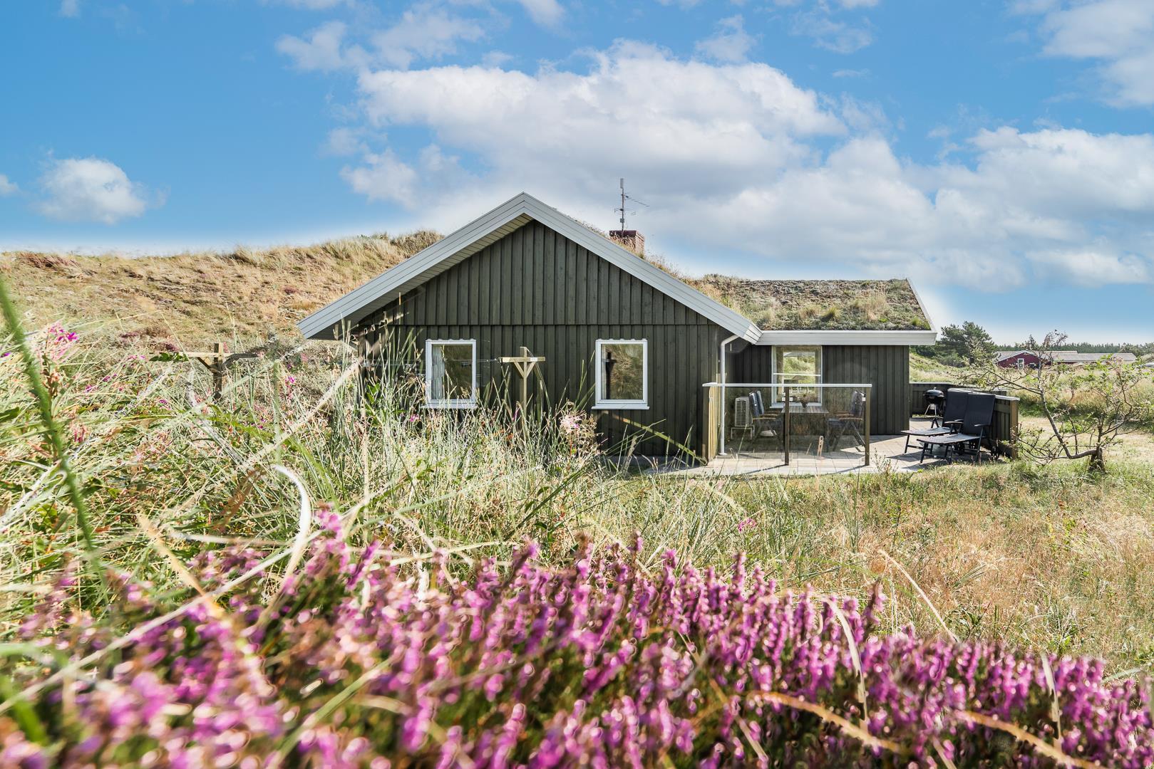 Dejligt lyst og velpasset feriehus, beliggende på en pragtfuld klitgrund i meget rolige omgivelser. Den flotte køkken ligger i åben forbindelse med den dejlige lyse stue med brændeovn og hvorfra der er udgang til pragtfuld og helt lukket terrasse. Stor badeværelse med adgang til sauna. Huset fremtræder overalt lyst og venligt og har en vaskemaskine. Et feriehus hvor rammerne er til stede for en rigtig god ferie - hele året. Alle soverum er indrettet med med gode boxmadrasser.