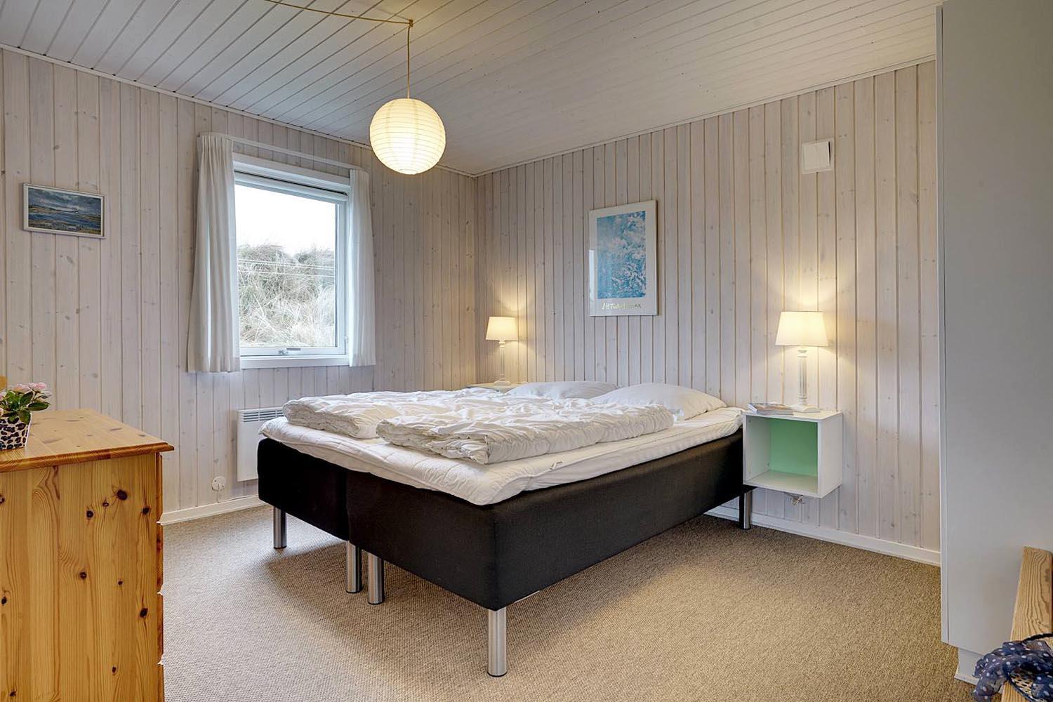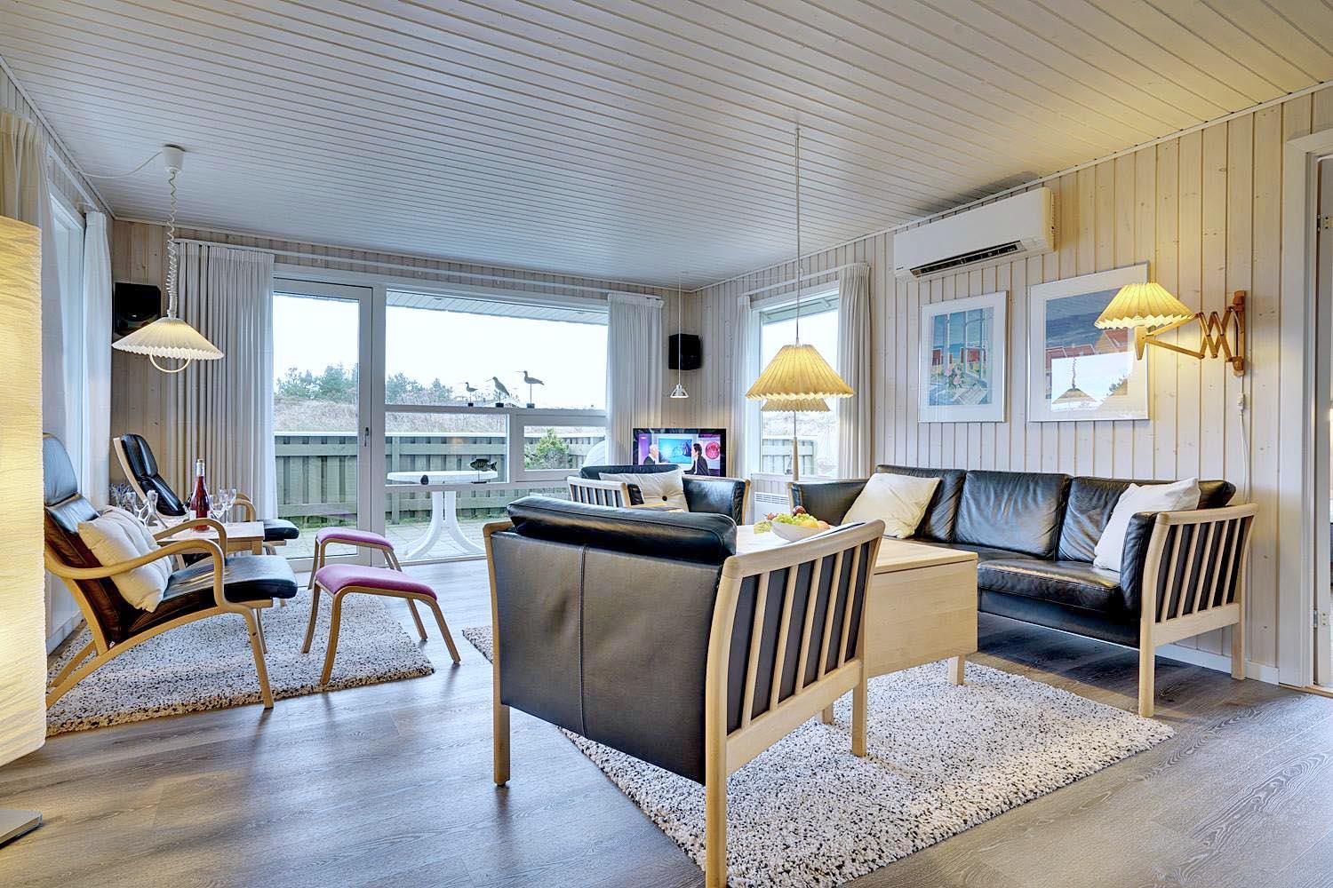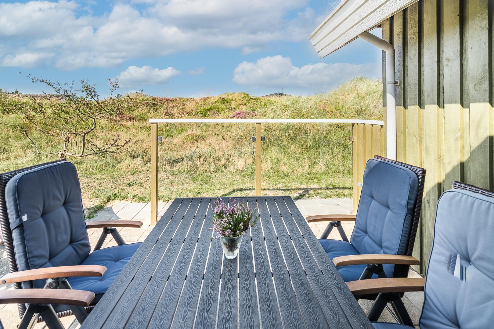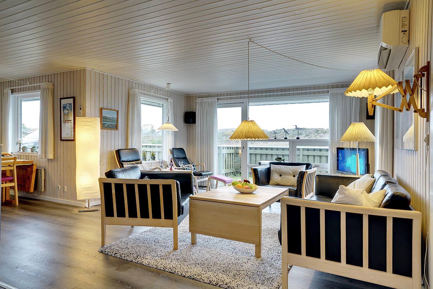 Dejligt lyst og velpasset feriehus, beliggende på en pragtfuld klitgrund i meget rolige omgivelser. Den flotte køkken ligger i åben forbindelse med den dejlige lyse stue med brændeovn og hvorfra der er udgang til pragtfuld og helt lukket terrasse. Stor badeværelse med adgang til sauna. Huset fremtræder overalt lyst og venligt og har en vaskemaskine. Et feriehus hvor rammerne er til stede for en rigtig god ferie - hele året. Alle soverum er indrettet med med gode boxmadrasser.