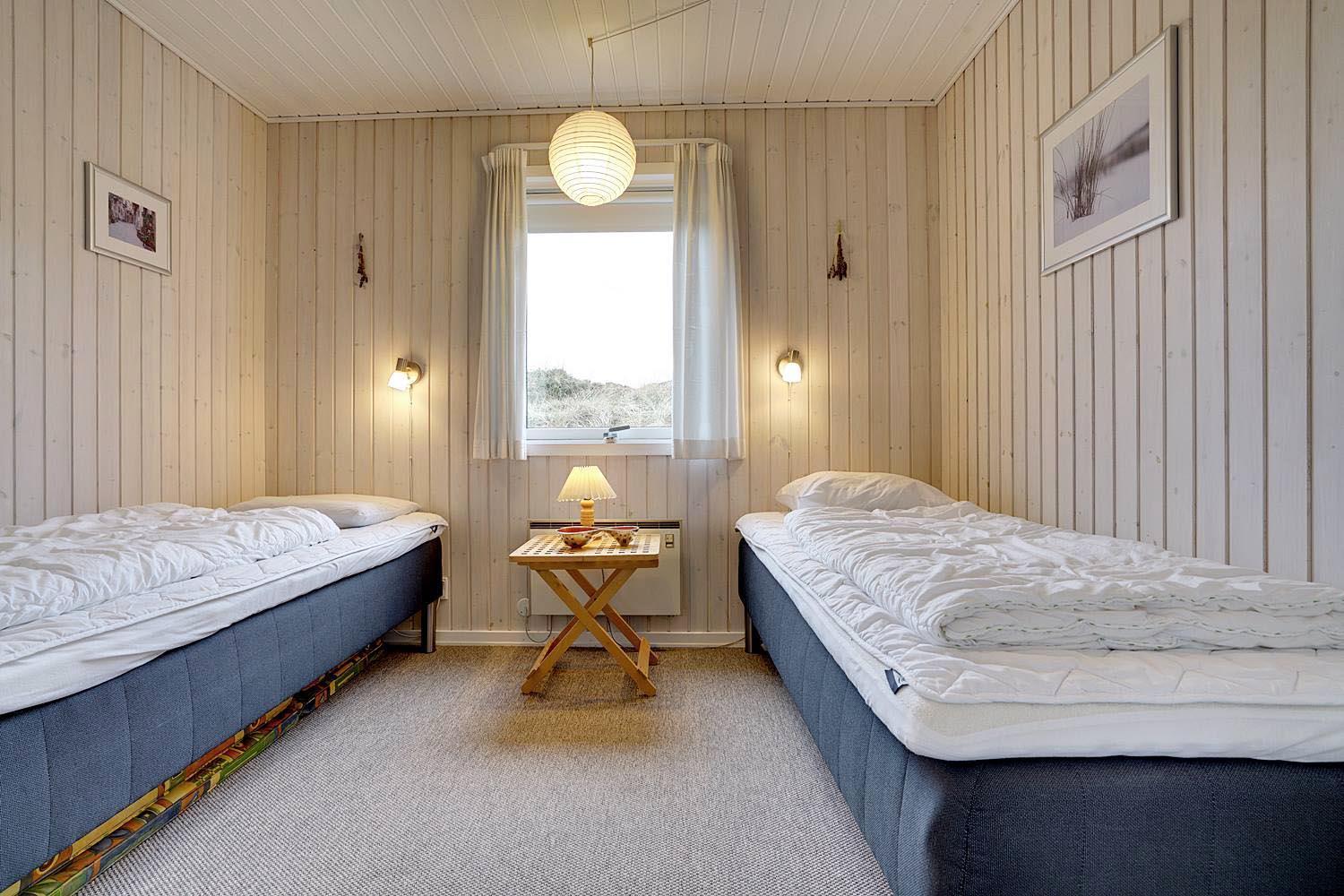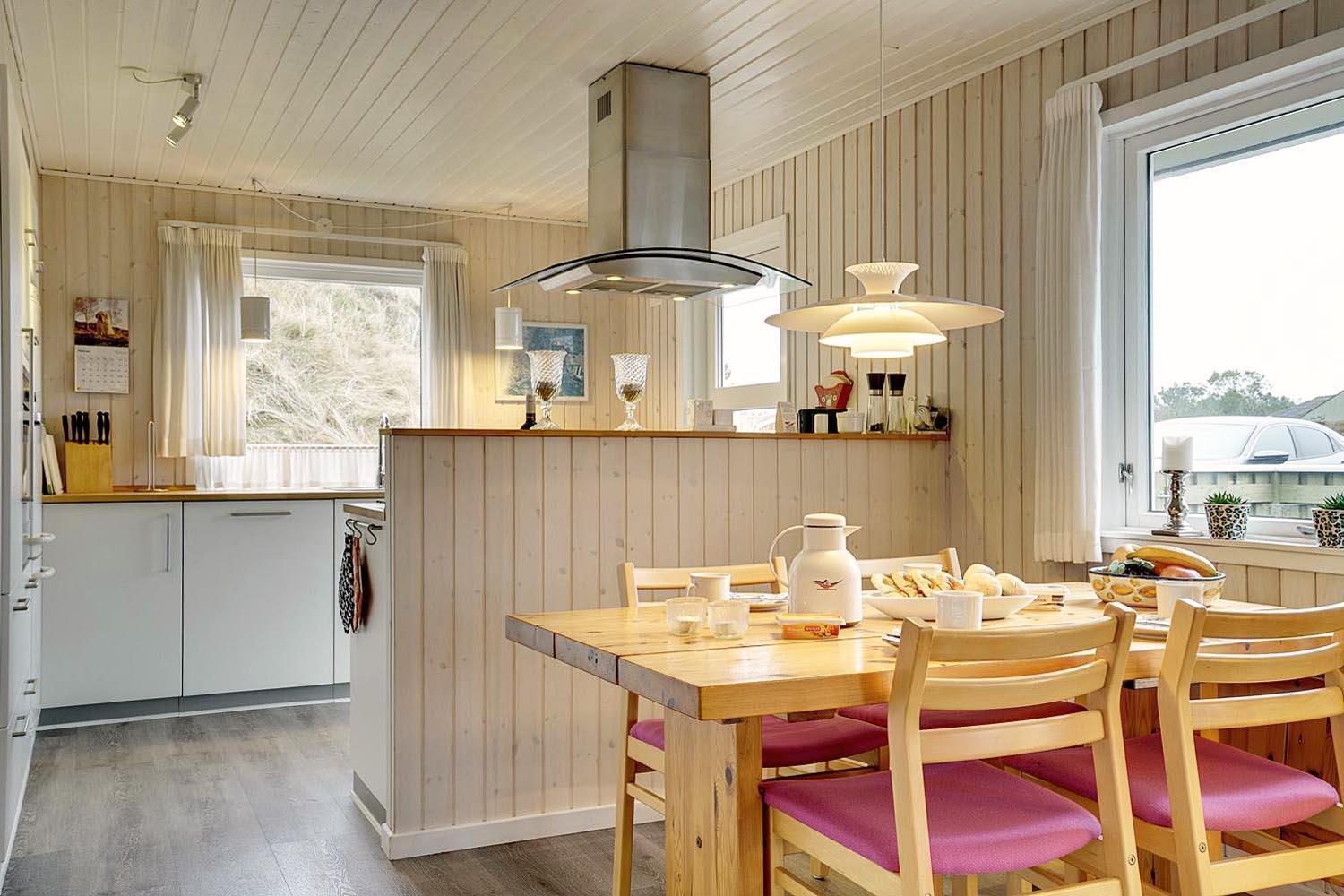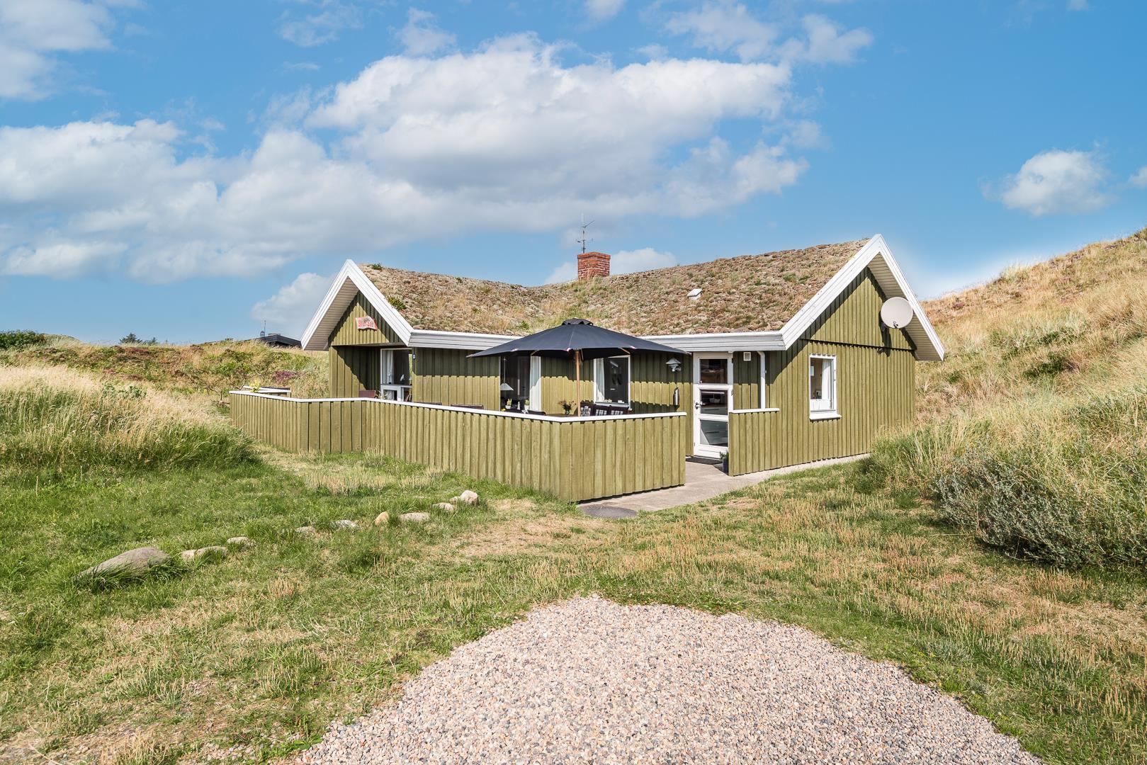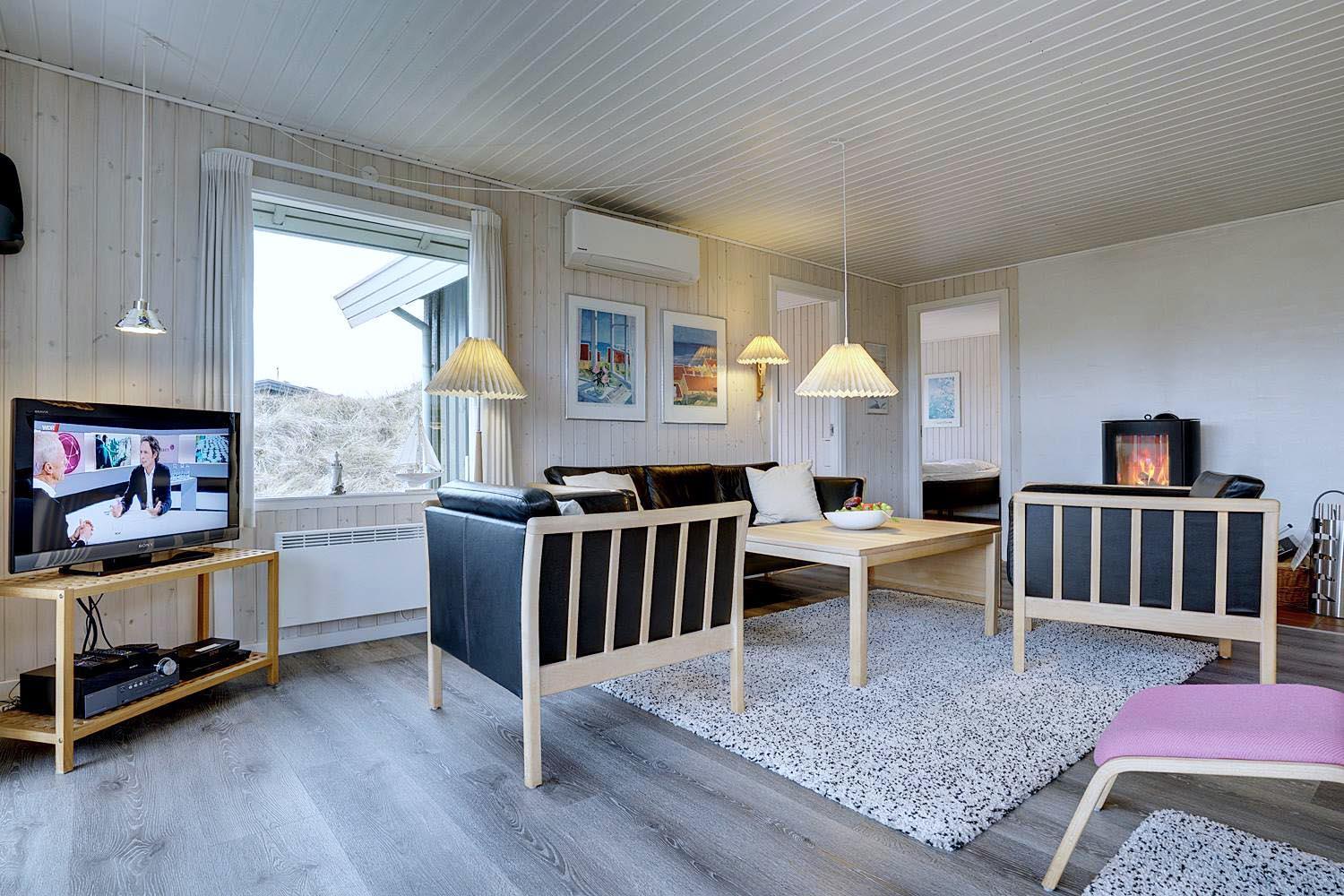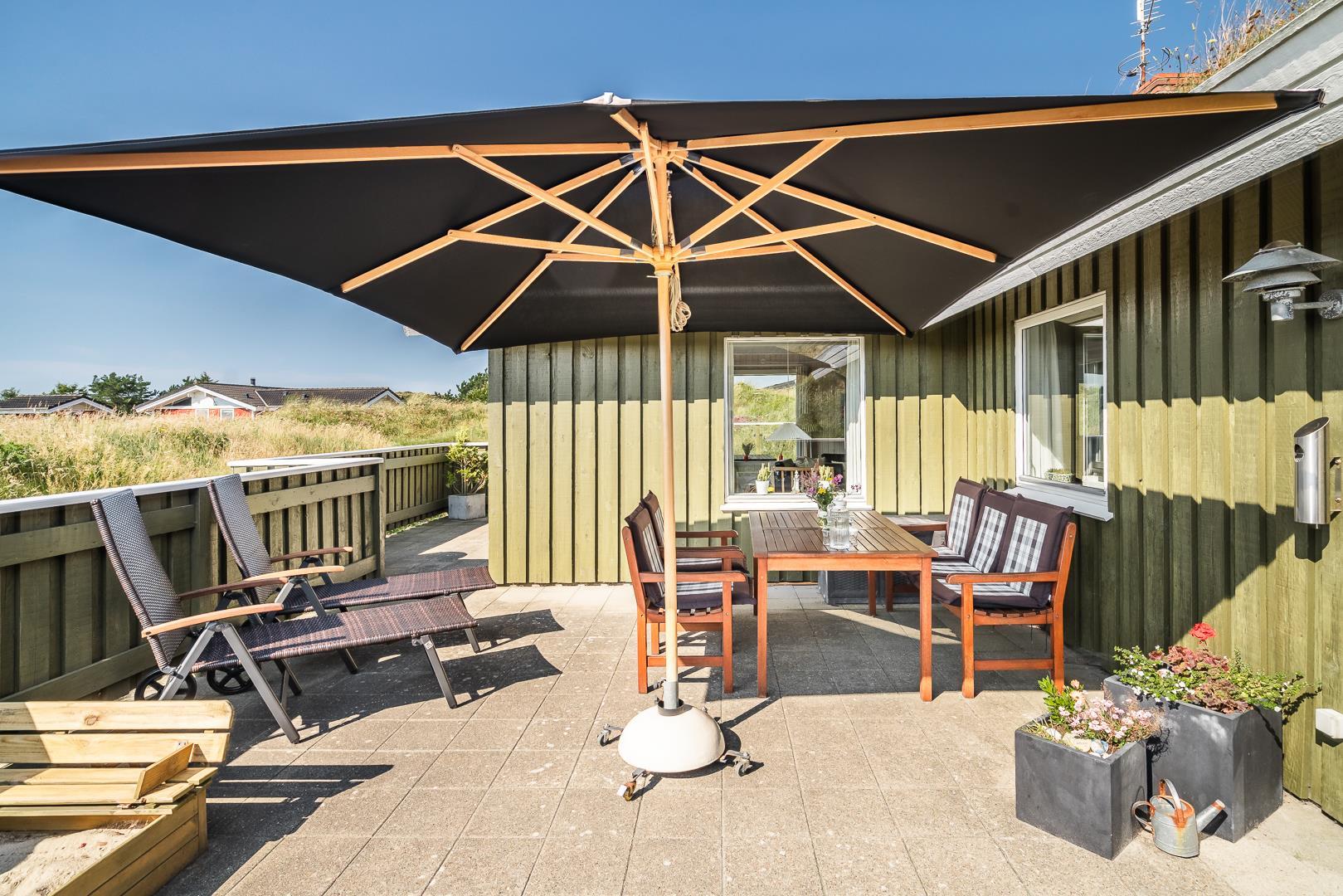 Dejligt lyst og velpasset feriehus, beliggende på en pragtfuld klitgrund i meget rolige omgivelser. Den flotte køkken ligger i åben forbindelse med den dejlige lyse stue med brændeovn og hvorfra der er udgang til pragtfuld og helt lukket terrasse. Stor badeværelse med adgang til sauna. Huset fremtræder overalt lyst og venligt og har en vaskemaskine. Et feriehus hvor rammerne er til stede for en rigtig god ferie - hele året. Alle soverum er indrettet med med gode boxmadrasser.