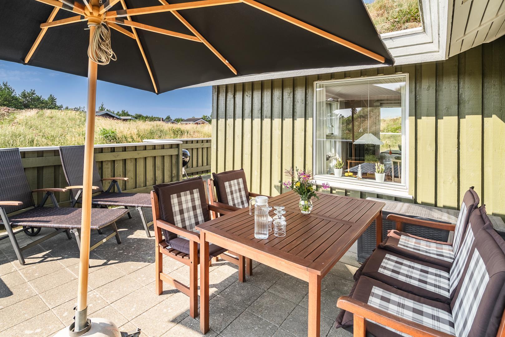 Lyst og velholdt feriehus med sauna og lukket terrasse i rolige Henne Strand omgivelser.