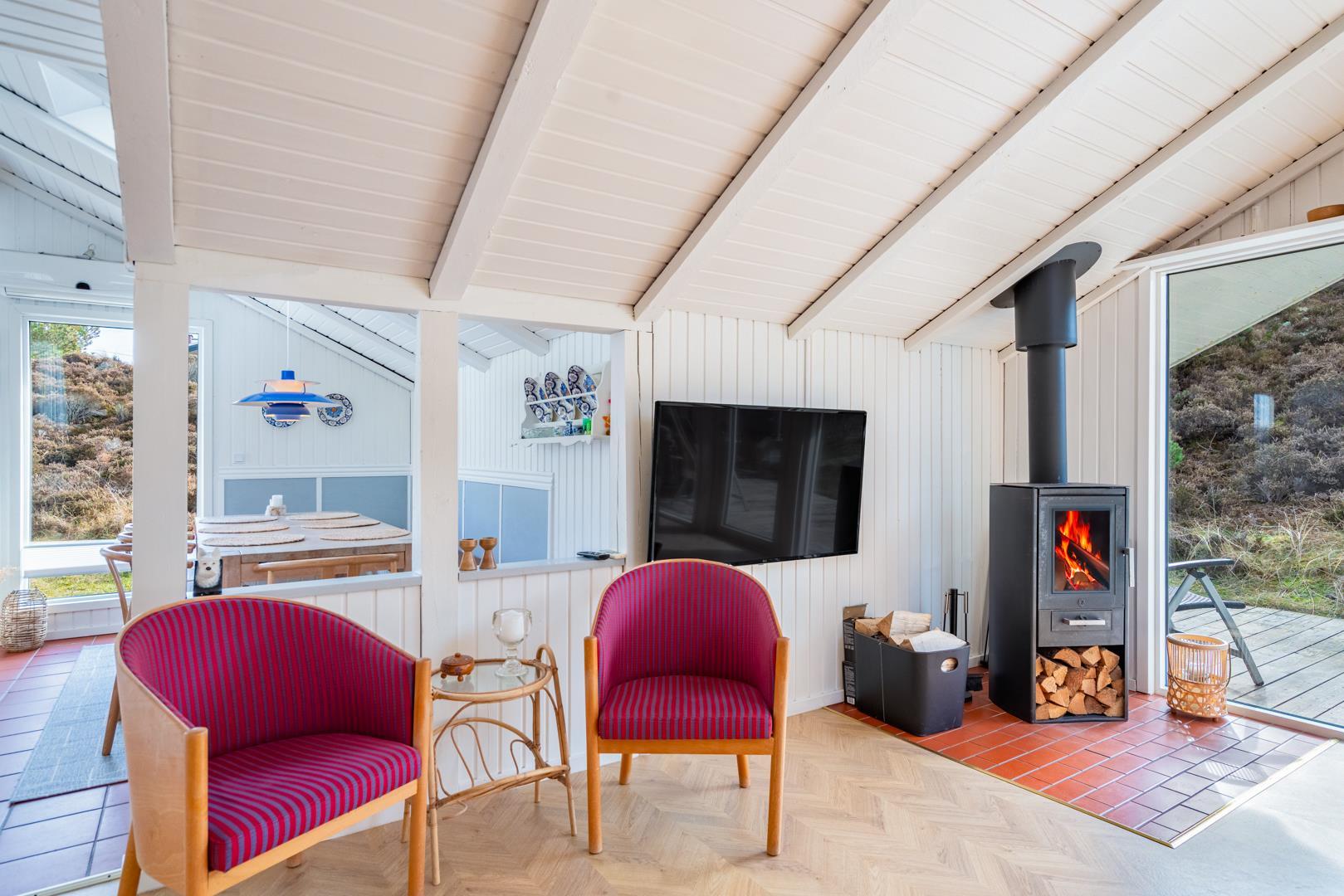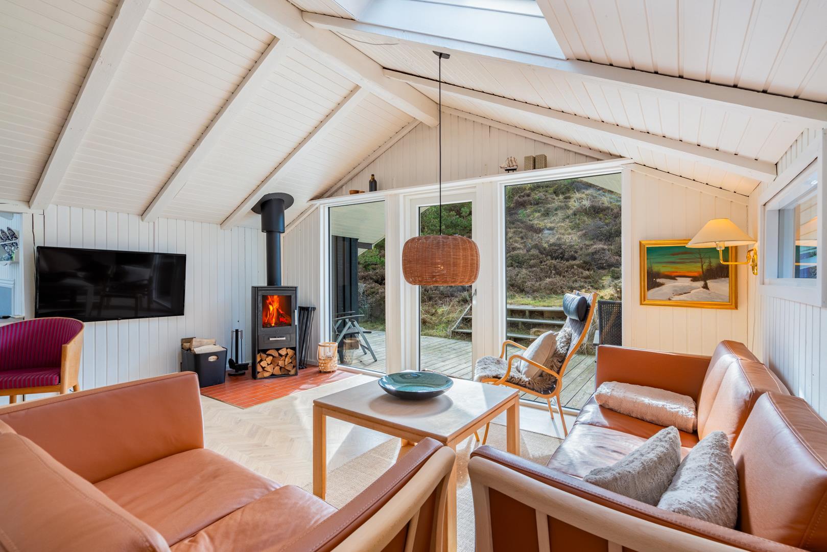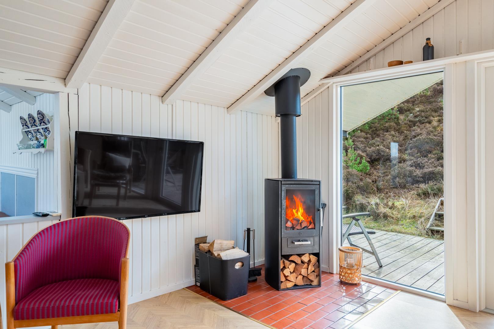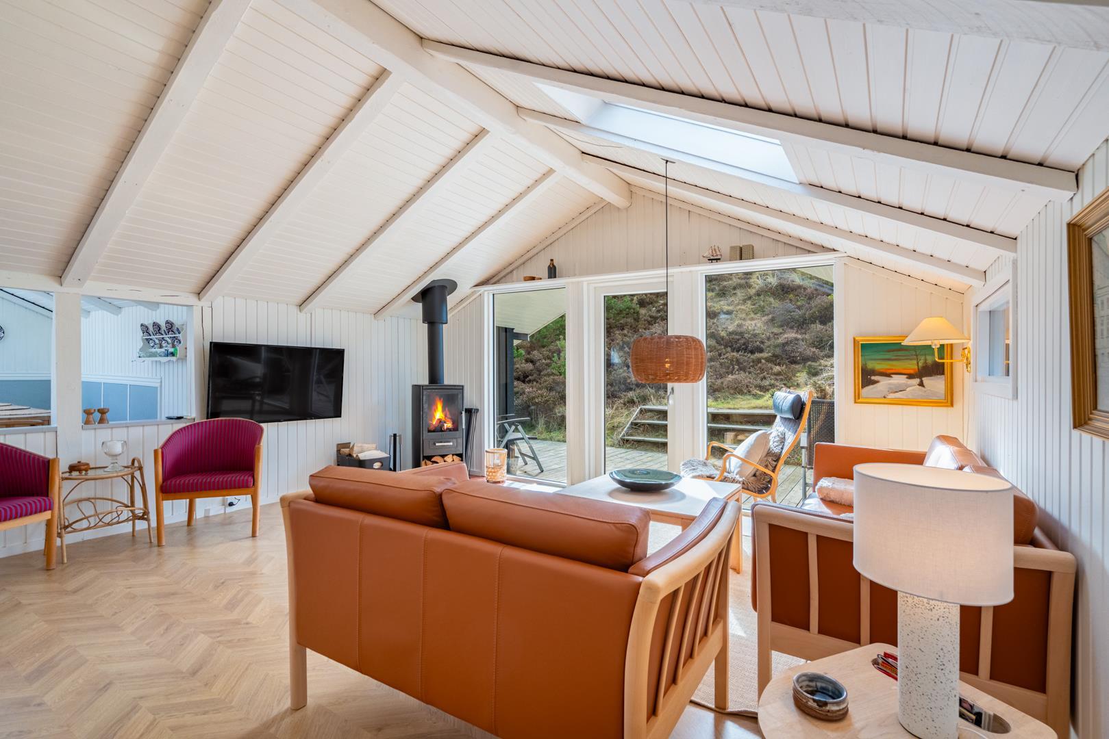 Sommerhuset er dejligt lyst, og har derfor et meget imødekommende og indbydende udtryk. Det lækre køkken åbner op til en hyggelig stue hvor du har direkte udgang til den store terrasse. I stuen kan du nyde varmen fra brændeovnen, der er centralt placeret og skaber den perfekte hyggestemning uanset hvor du befinder dig i rummet. Yderligere finder du 3 skønne soveværelser med dobbeltsenge og et fint badeværelse.