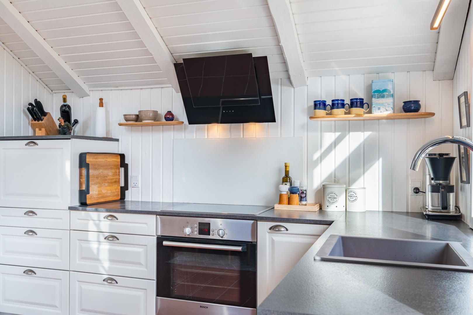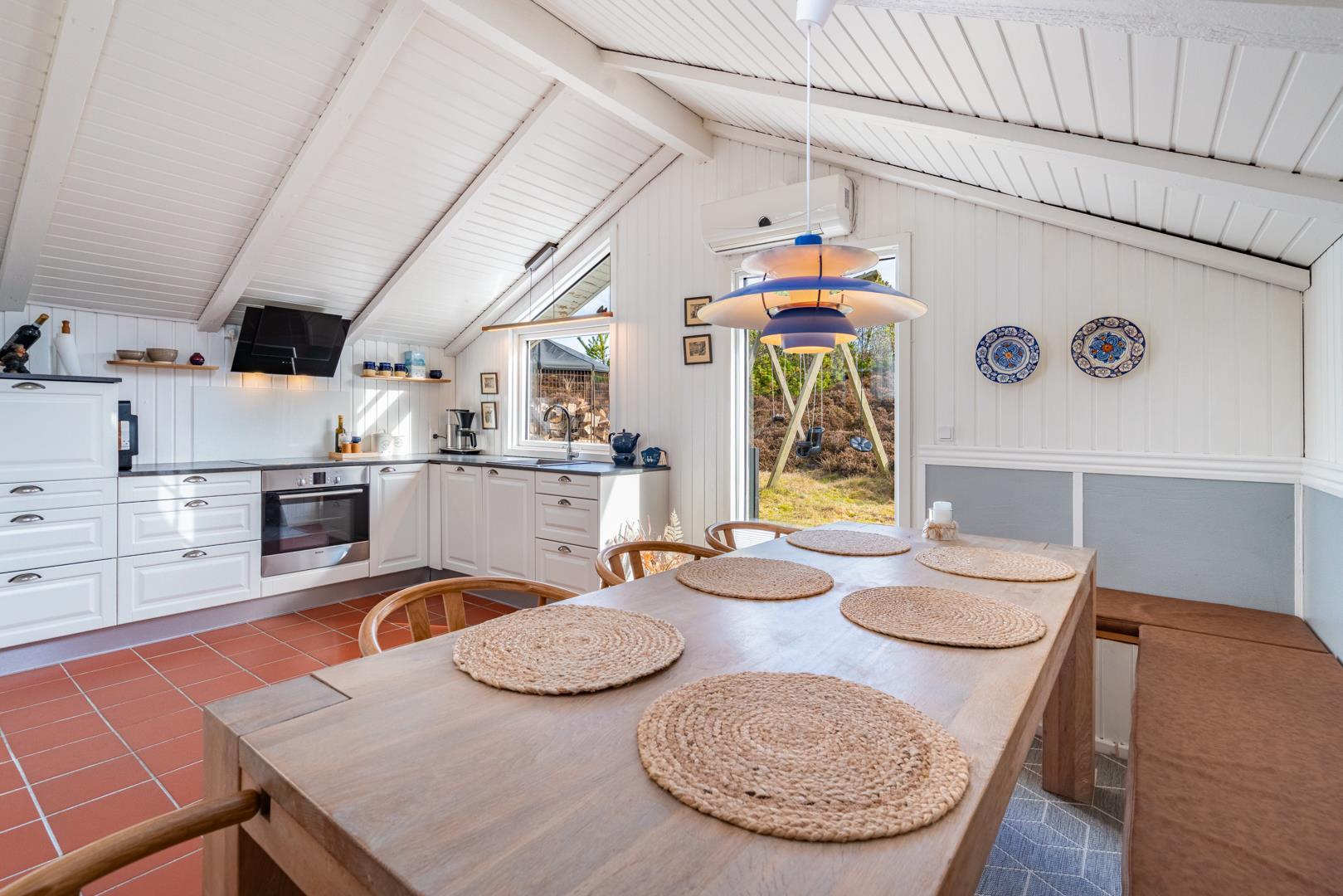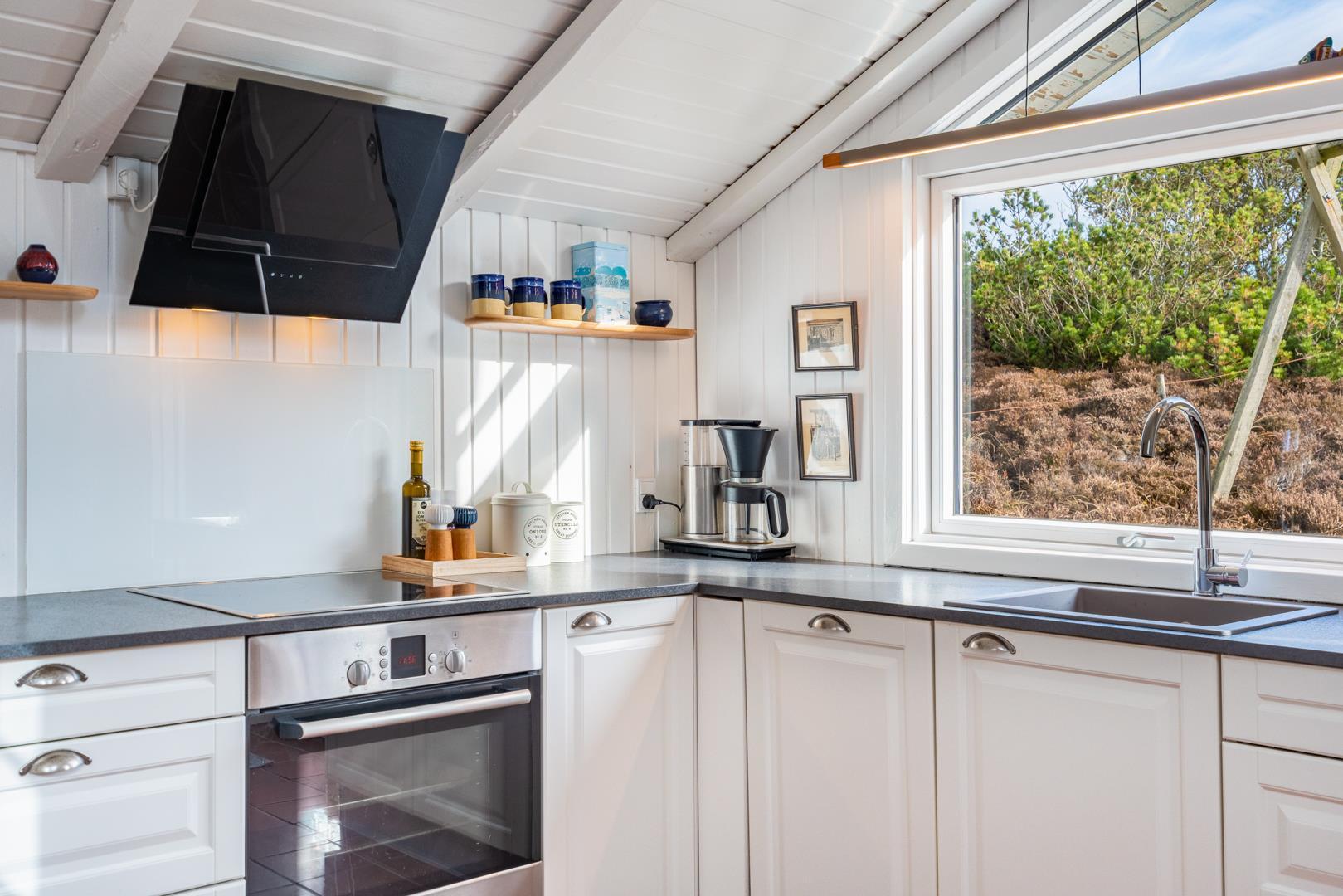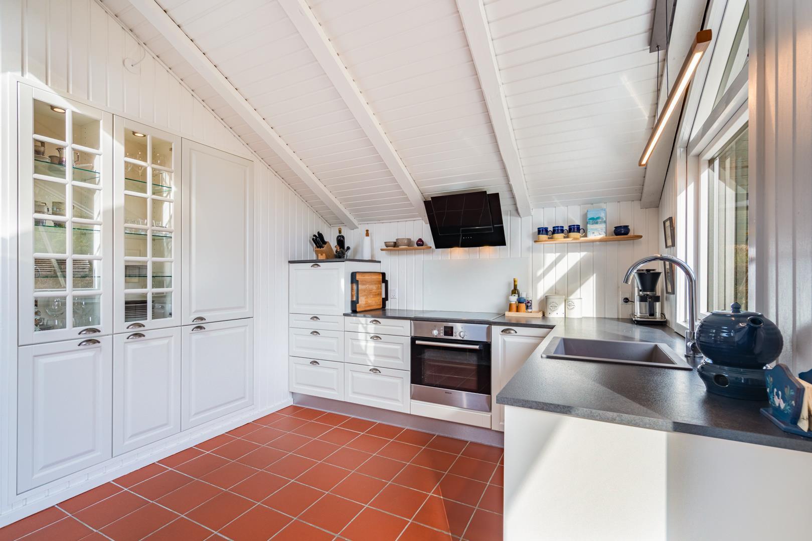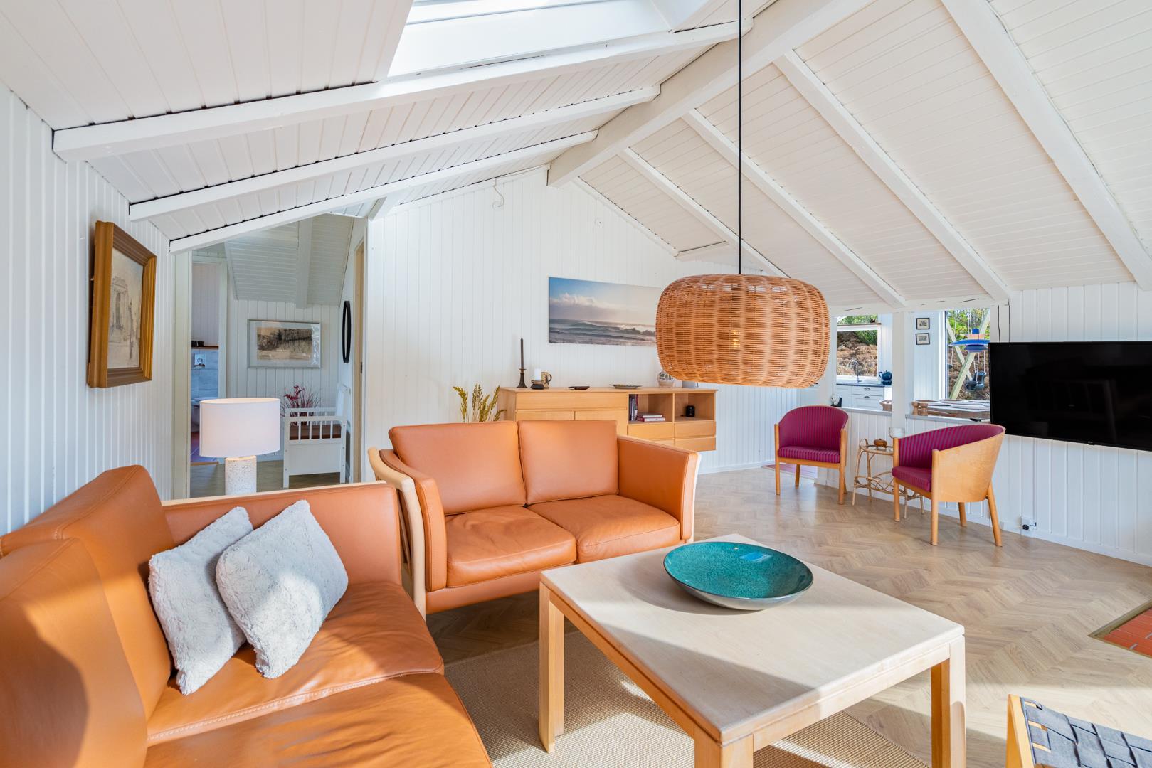 Sommerhuset er dejligt lyst, og har derfor et meget imødekommende og indbydende udtryk. Det lækre køkken åbner op til en hyggelig stue hvor du har direkte udgang til den store terrasse. I stuen kan du nyde varmen fra brændeovnen, der er centralt placeret og skaber den perfekte hyggestemning uanset hvor du befinder dig i rummet. Yderligere finder du 3 skønne soveværelser med dobbeltsenge og et fint badeværelse.