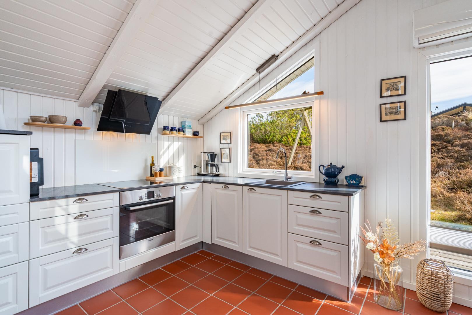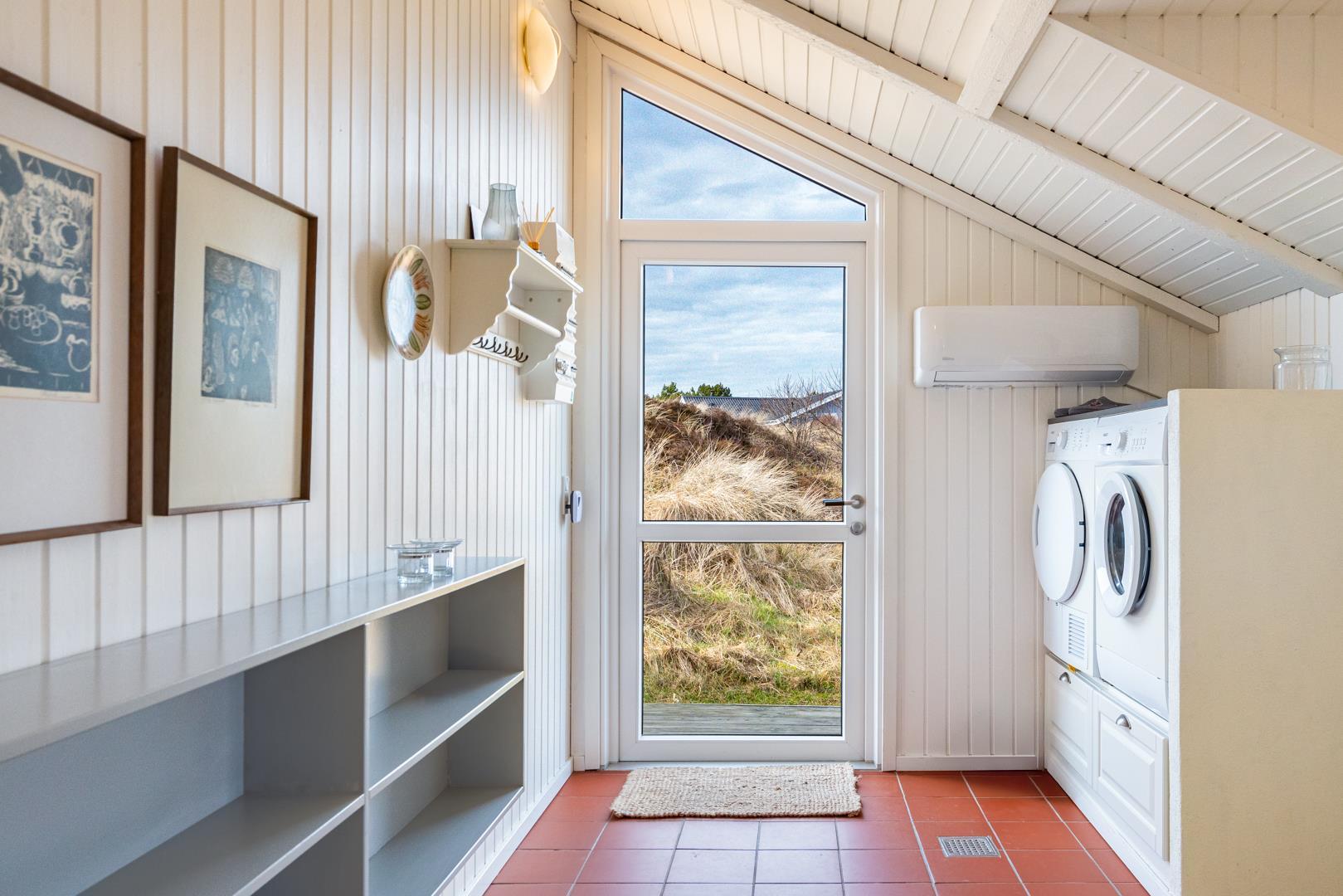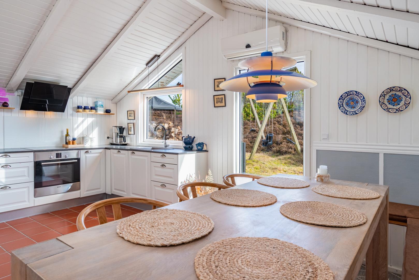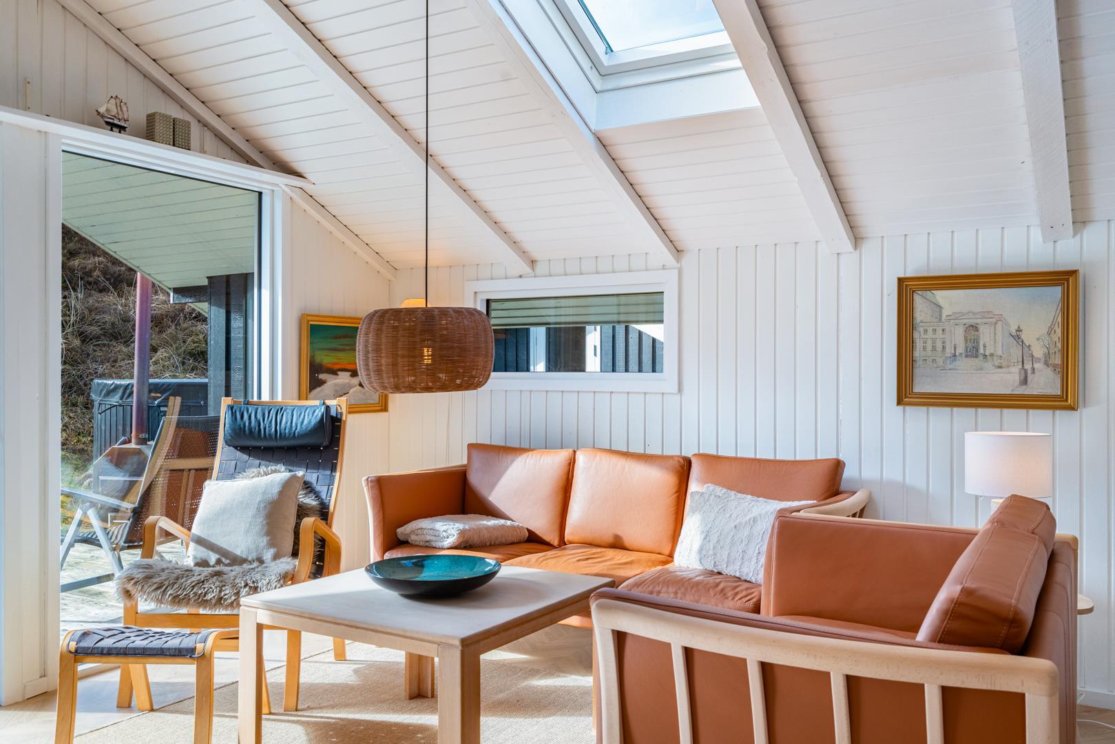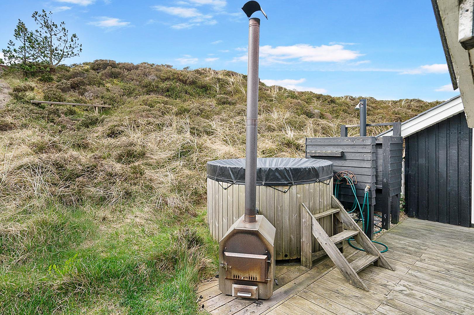 Dette dejlige sommerhus i Henne Strand er en sand perle, placeret for enden af en blind vej og omgivet af lyng, marehalm og klitter, hvilket skaber den perfekte ramme for en afslappende ferieoplevelse.