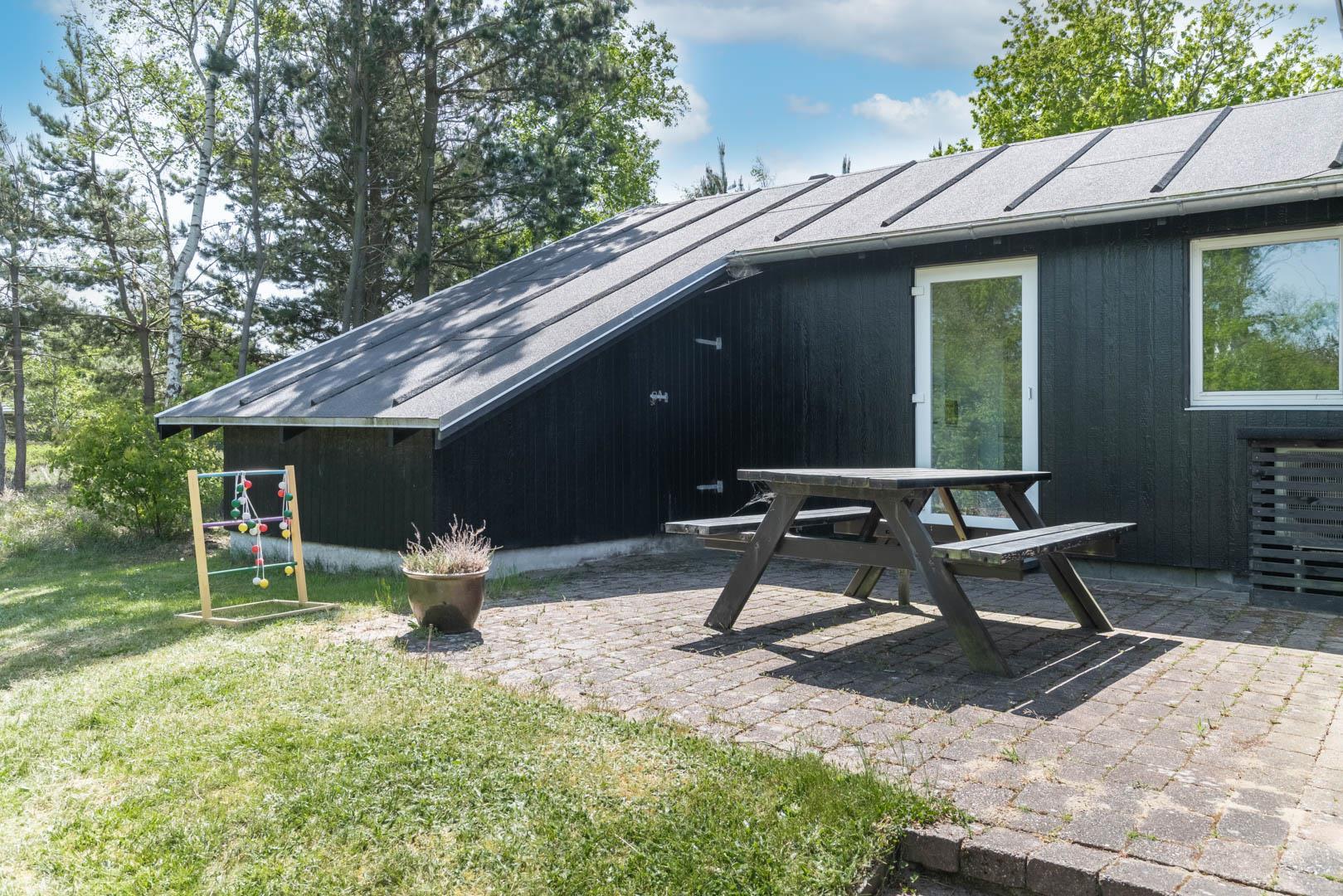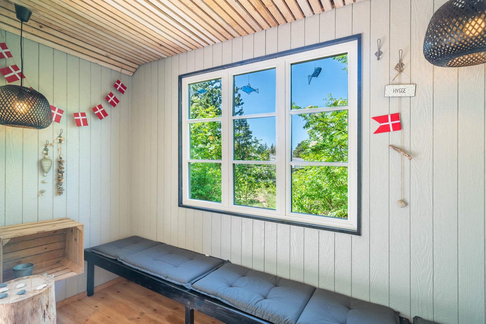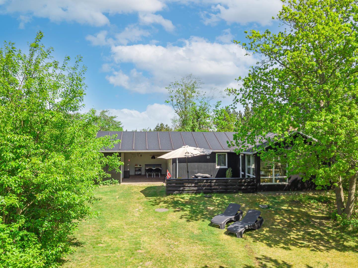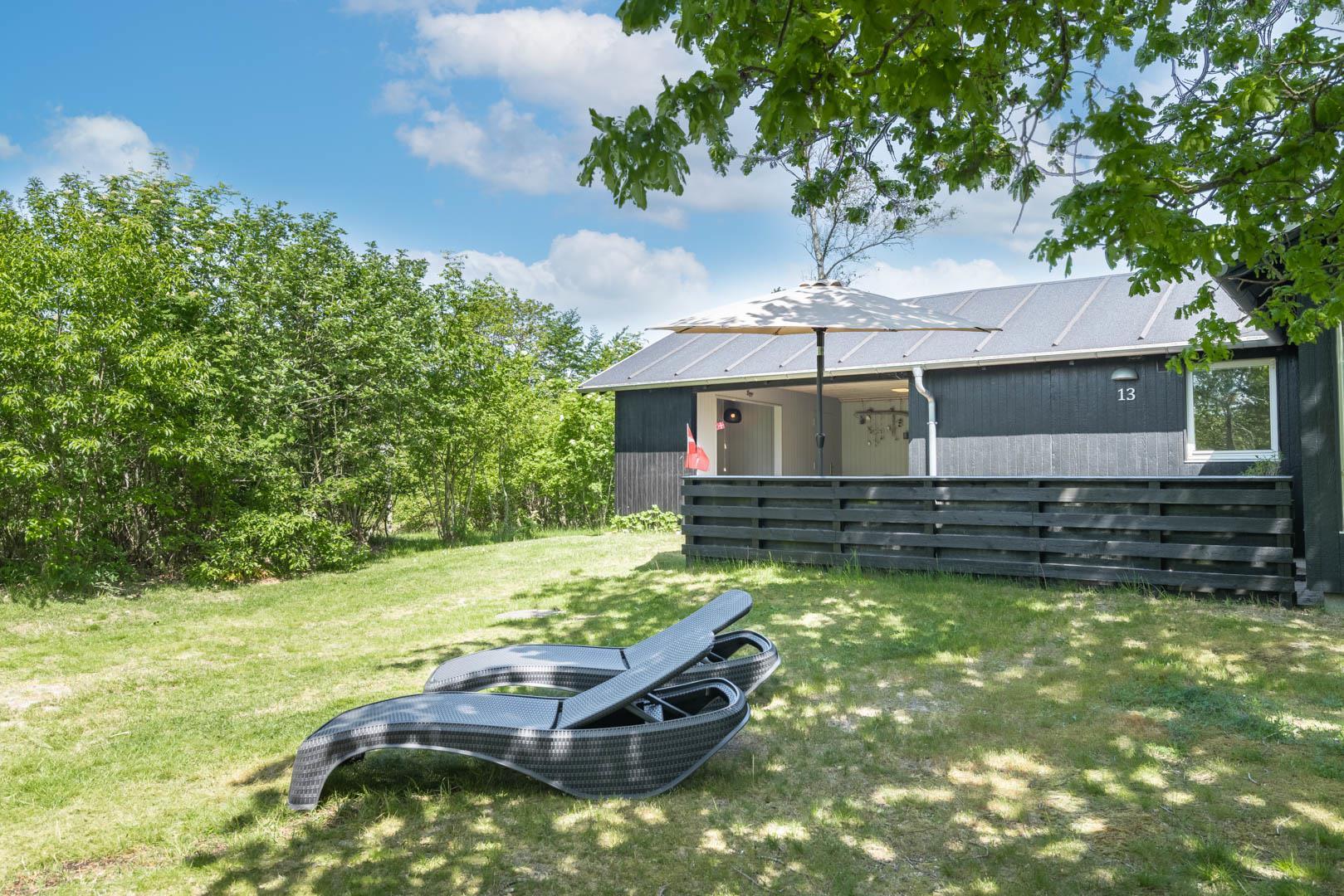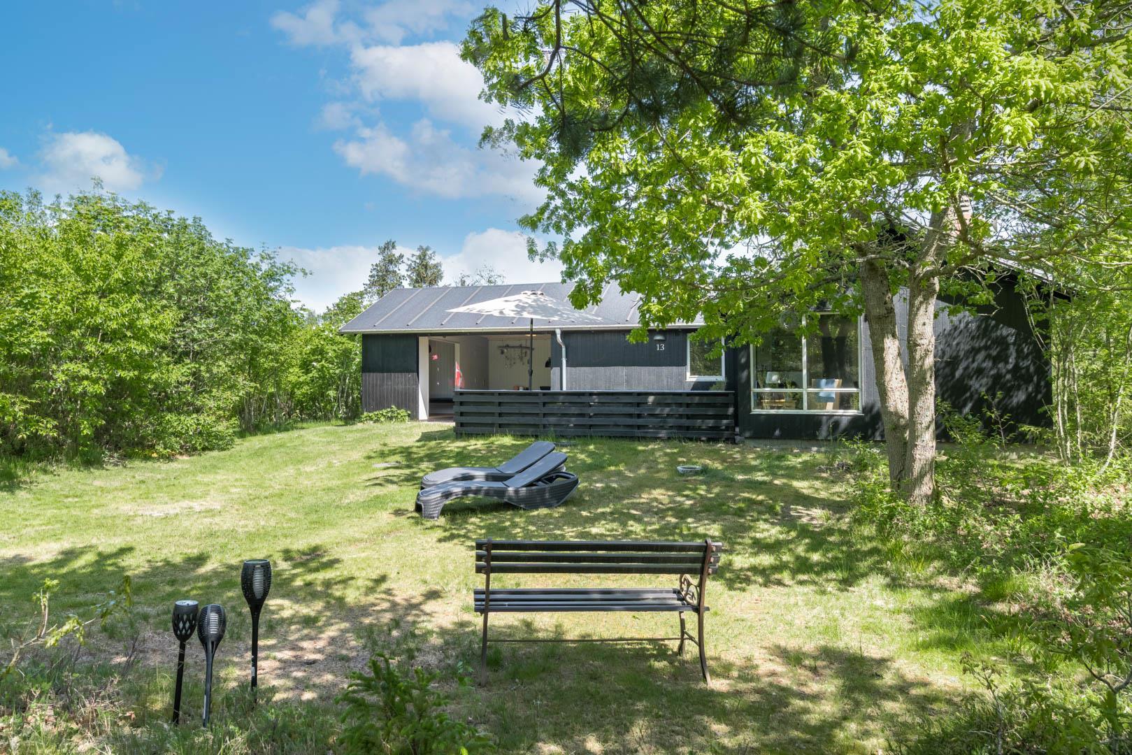 Charmerende sommerhus i Henne Strand med pejs, flere terrasser og petanquebane på stor naturgrund.