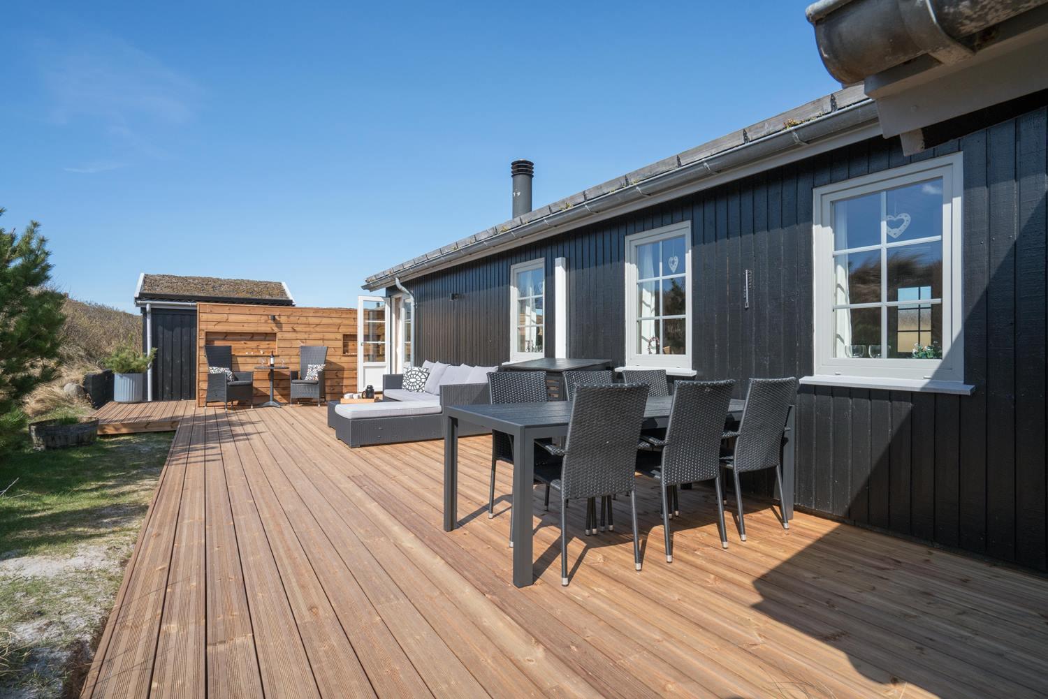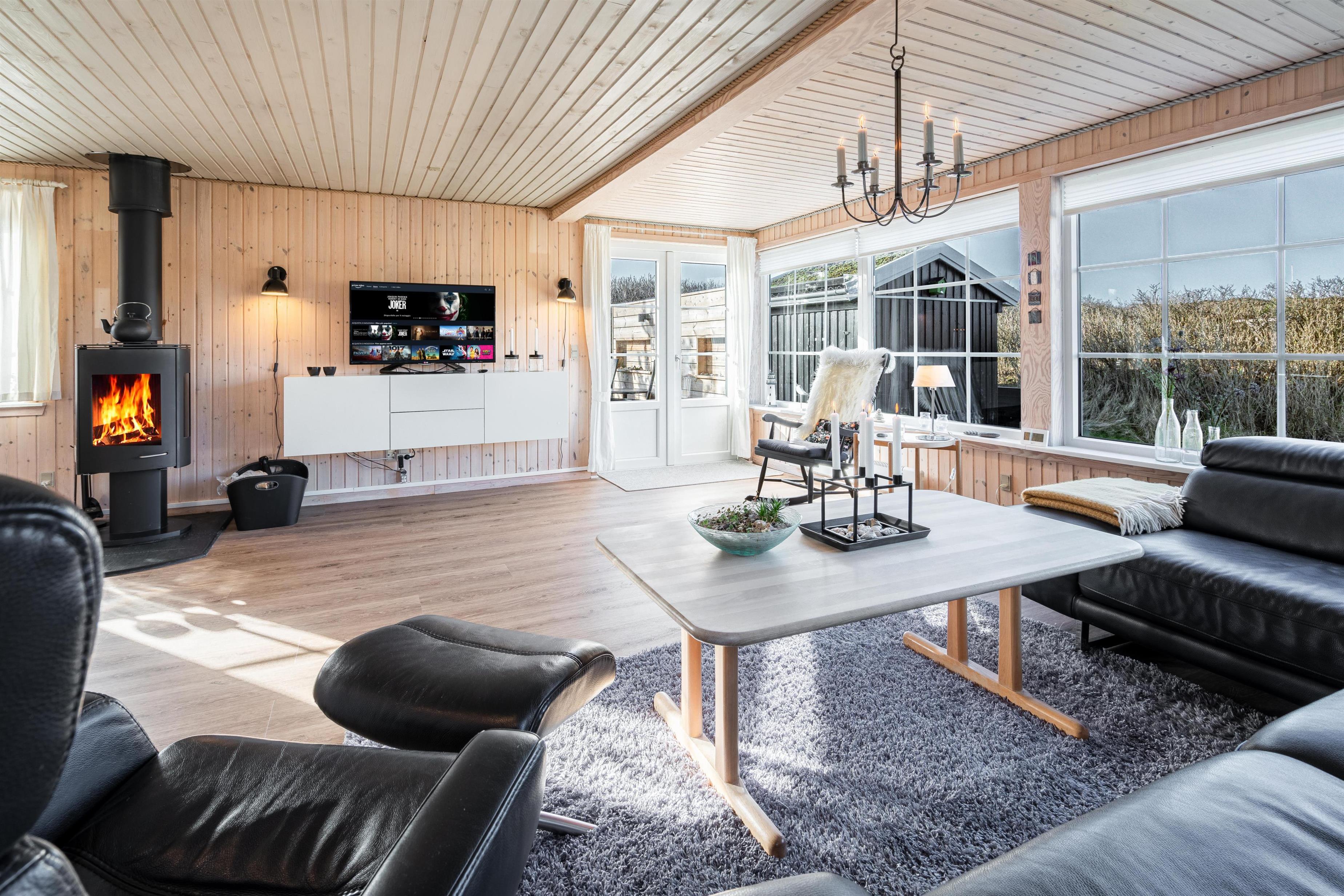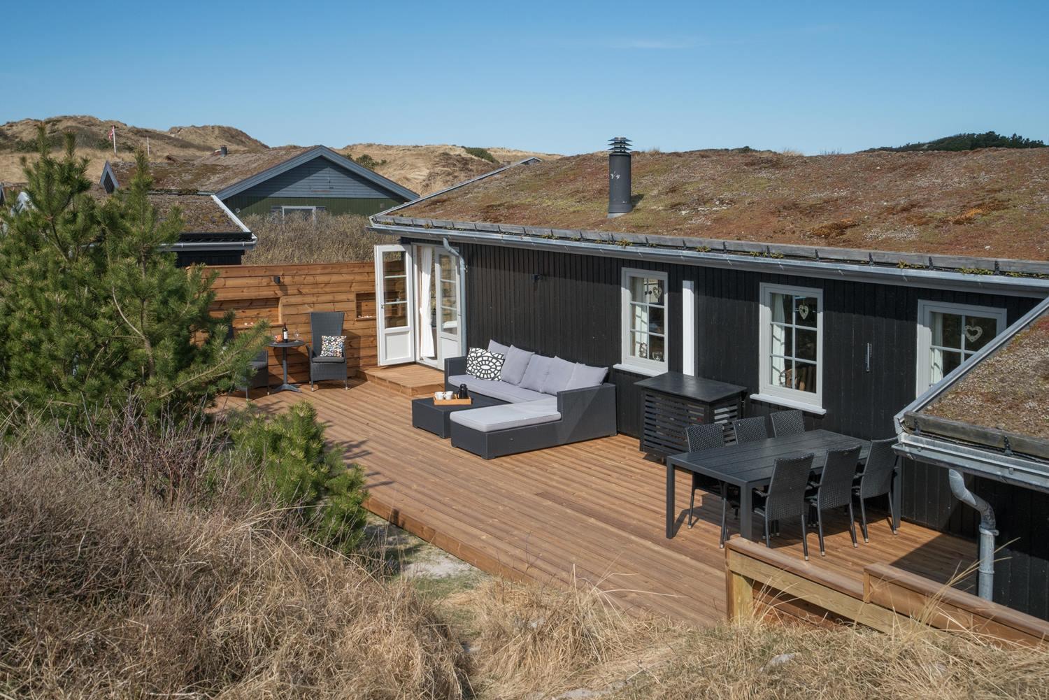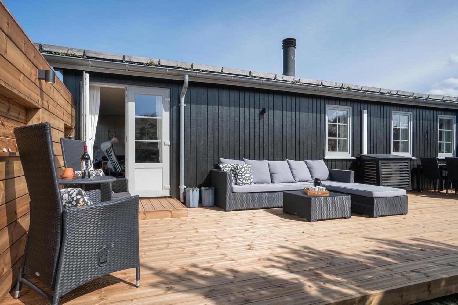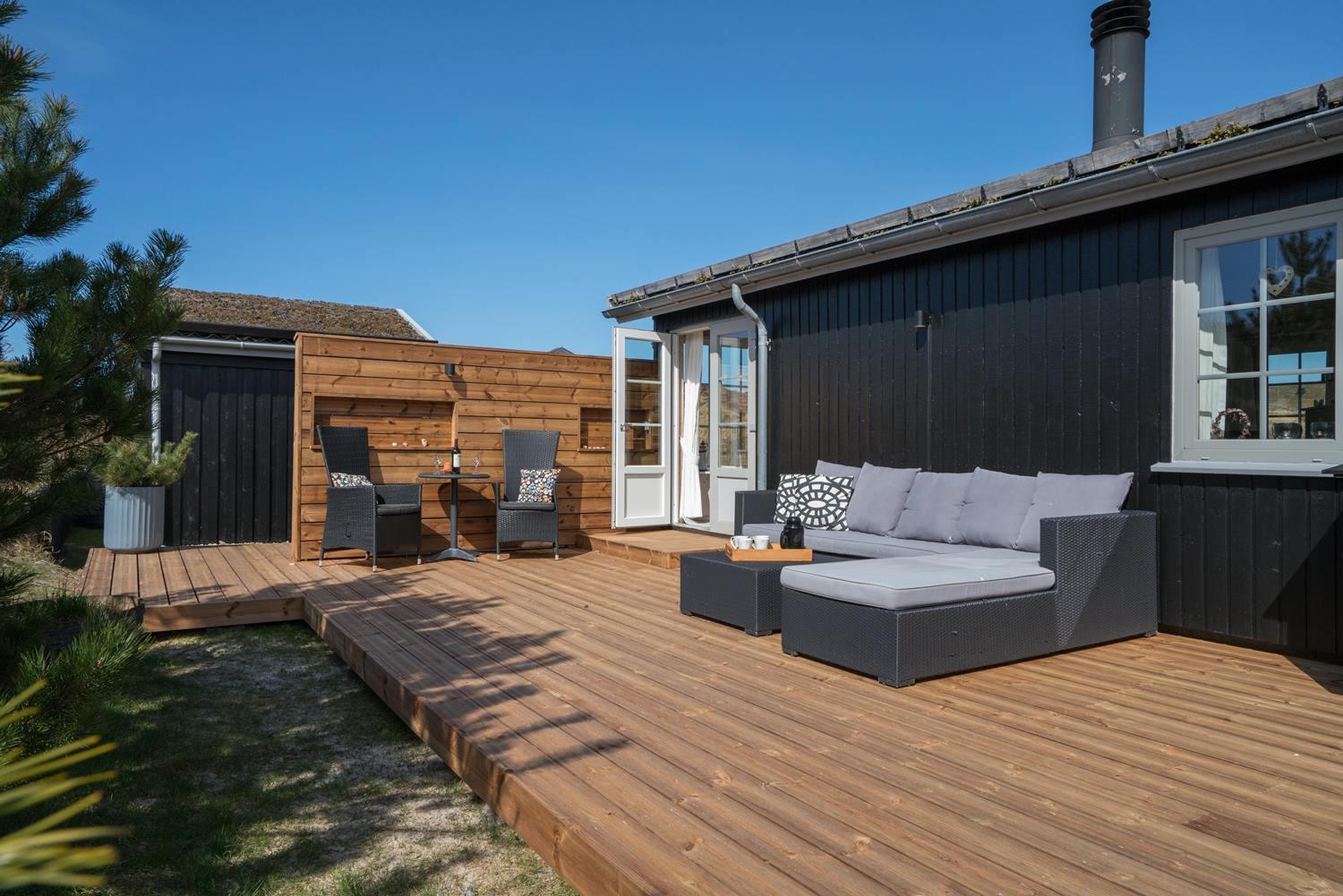 Velholdt feriehus nær Henne Strand med lys stue, brændeovn og to terrasser med udsigt over klitterne.