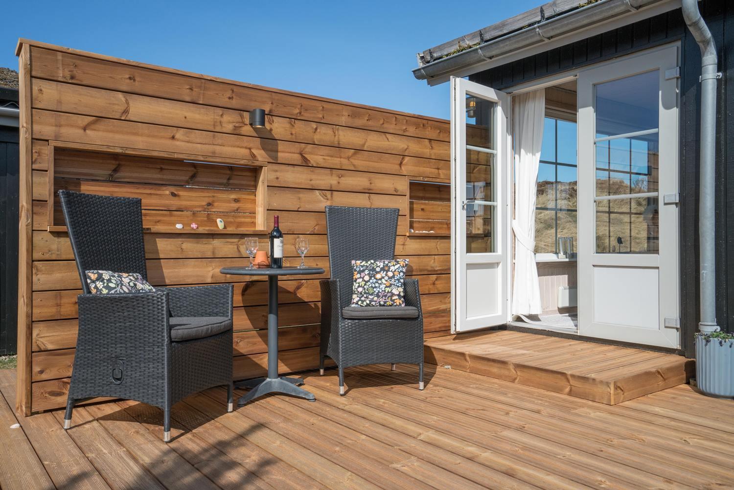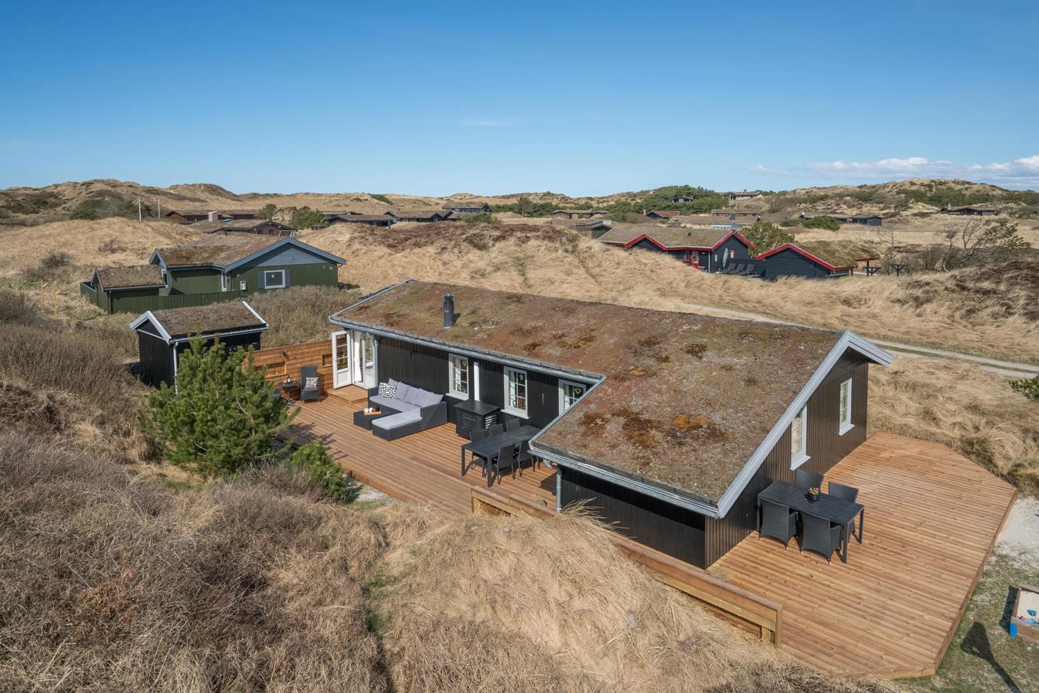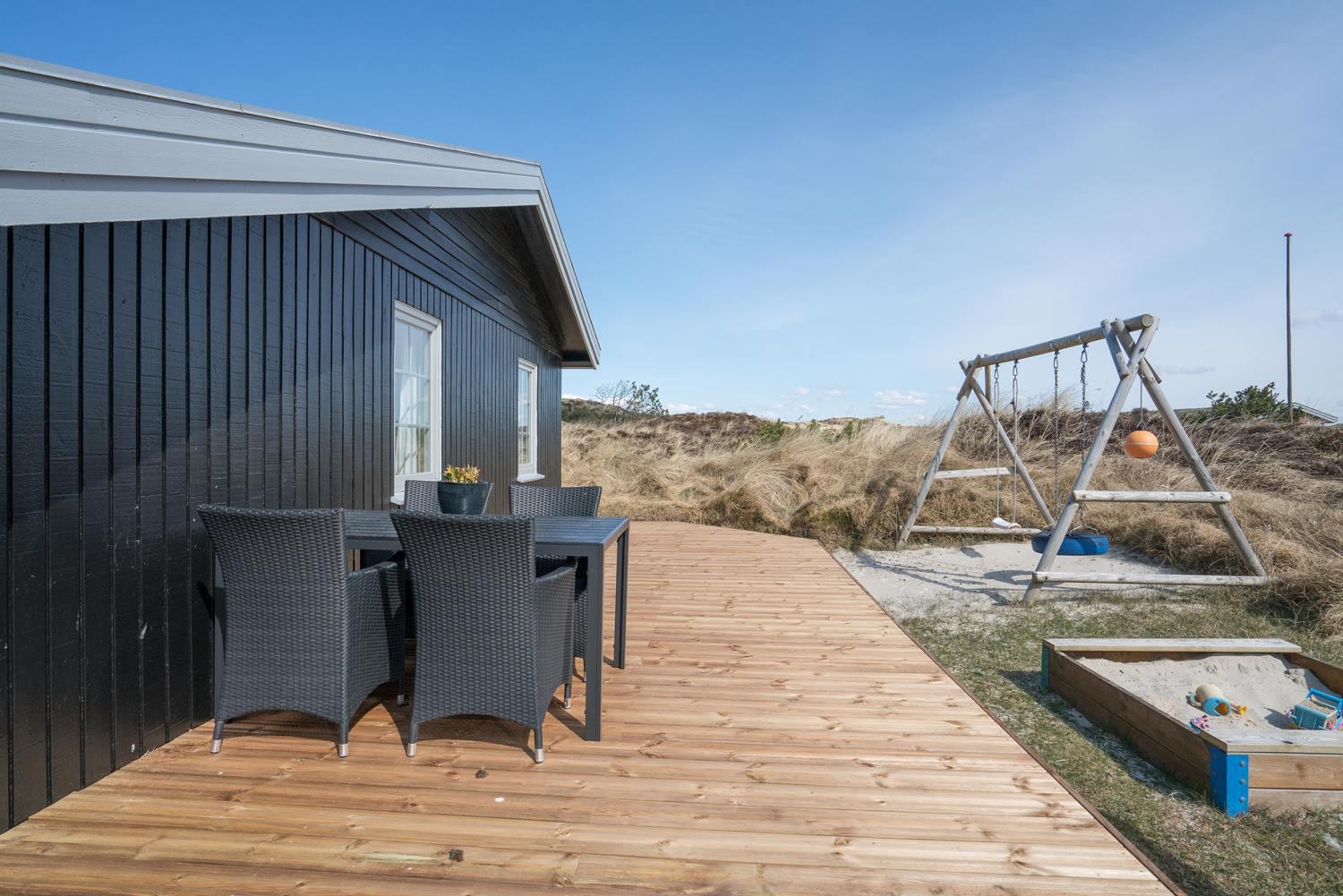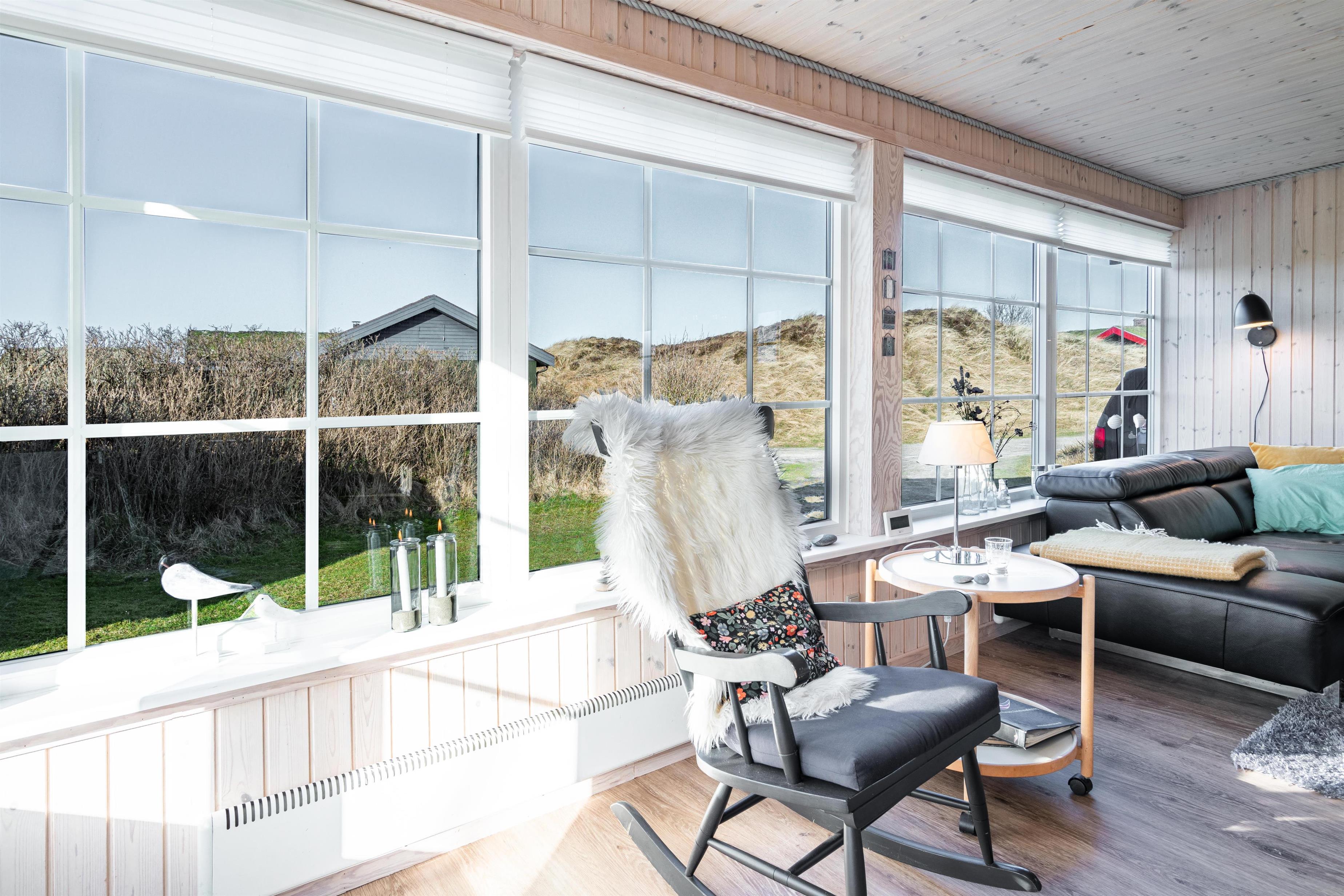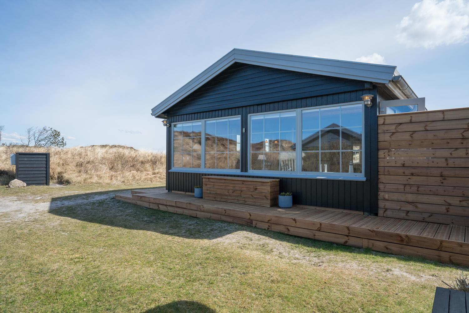 Velholdt feriehus nær Henne Strand med lys stue, brændeovn og to terrasser med udsigt over klitterne.