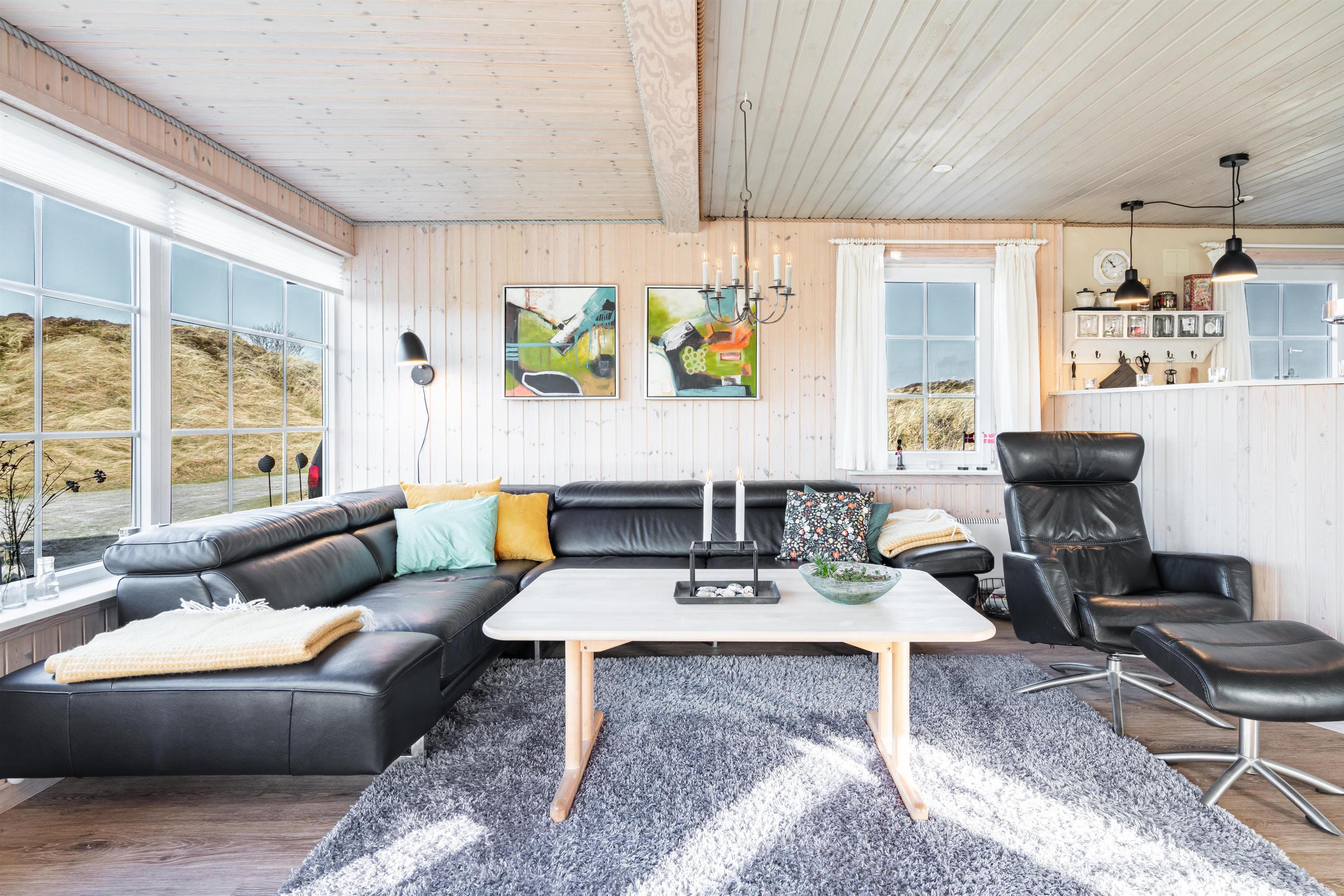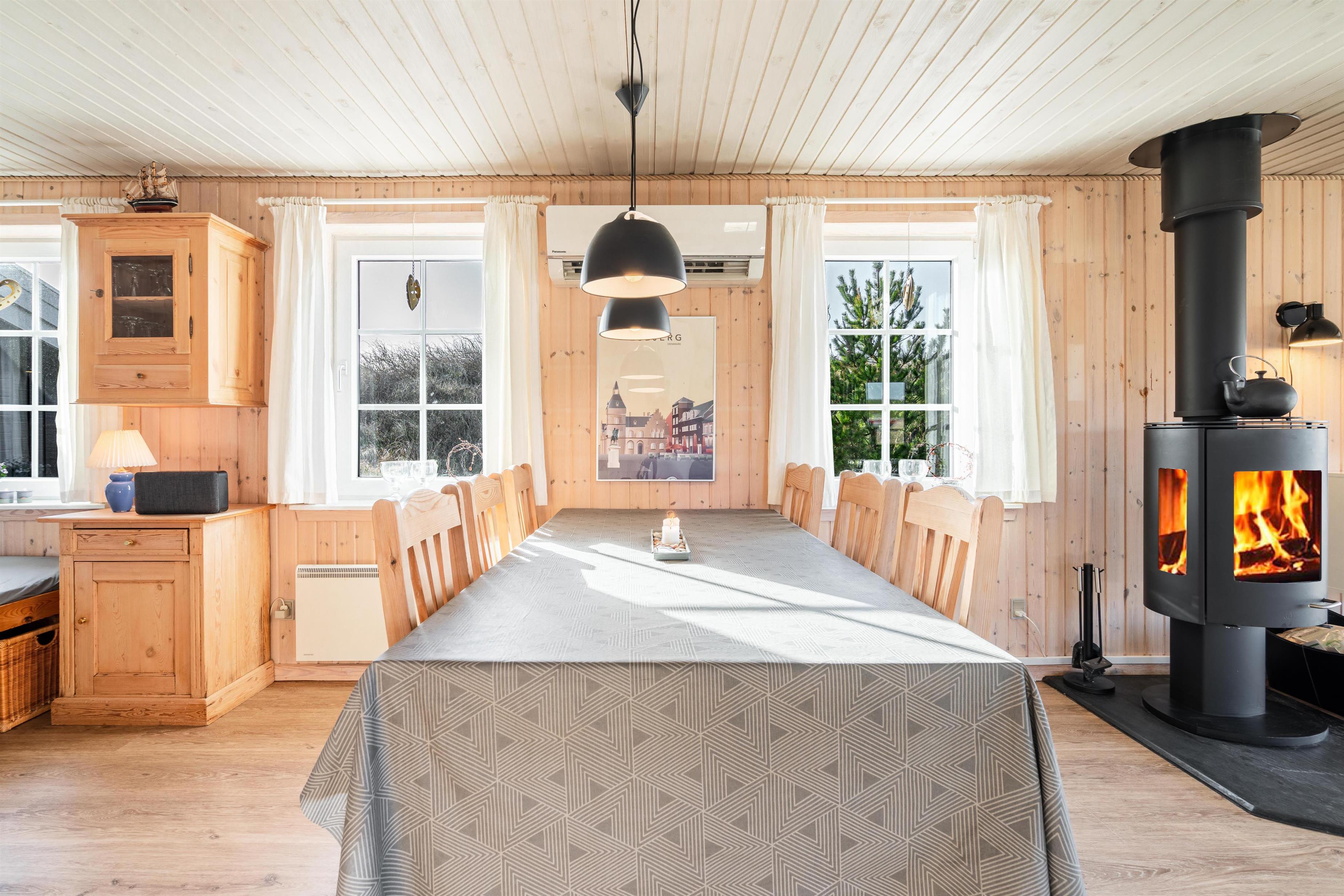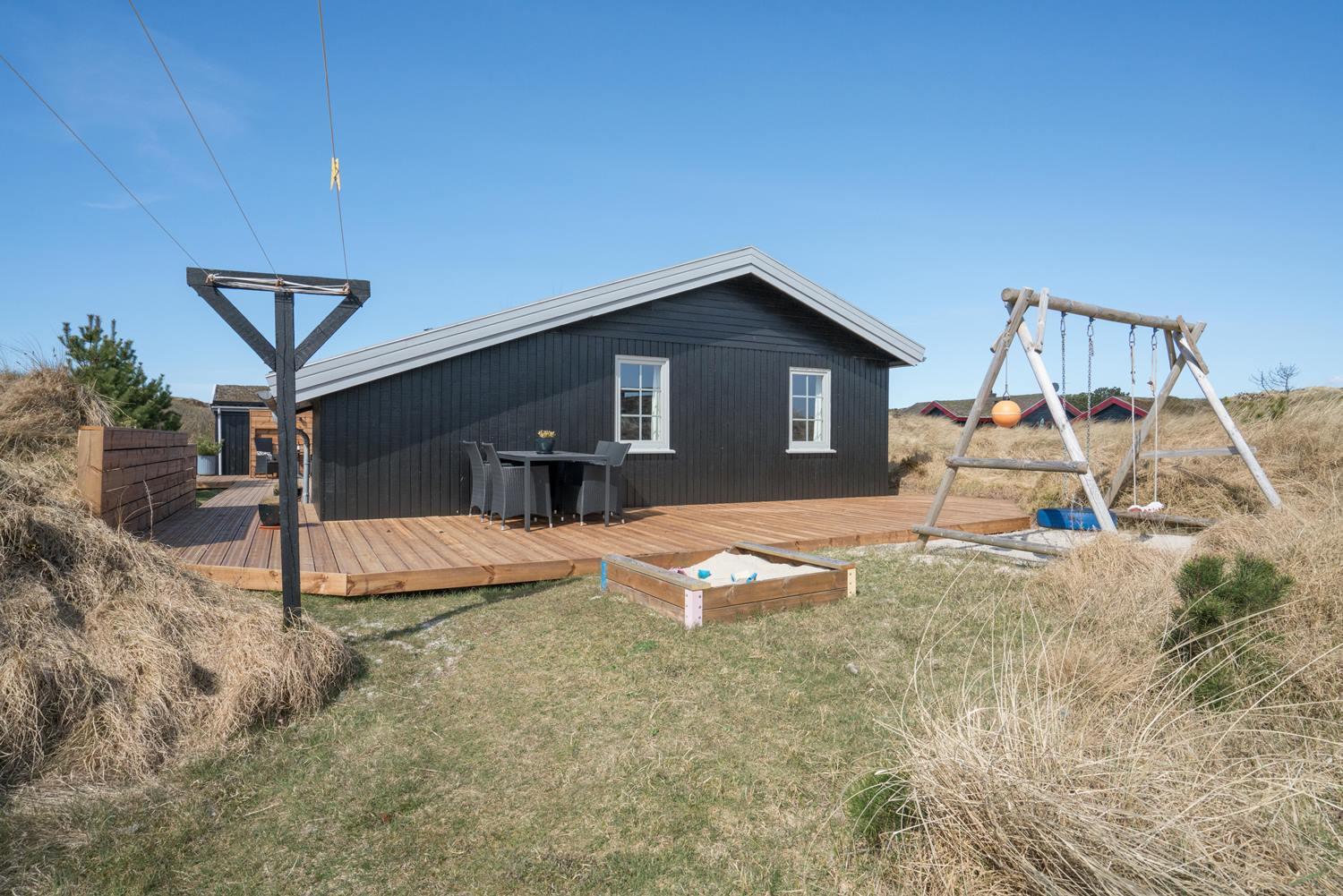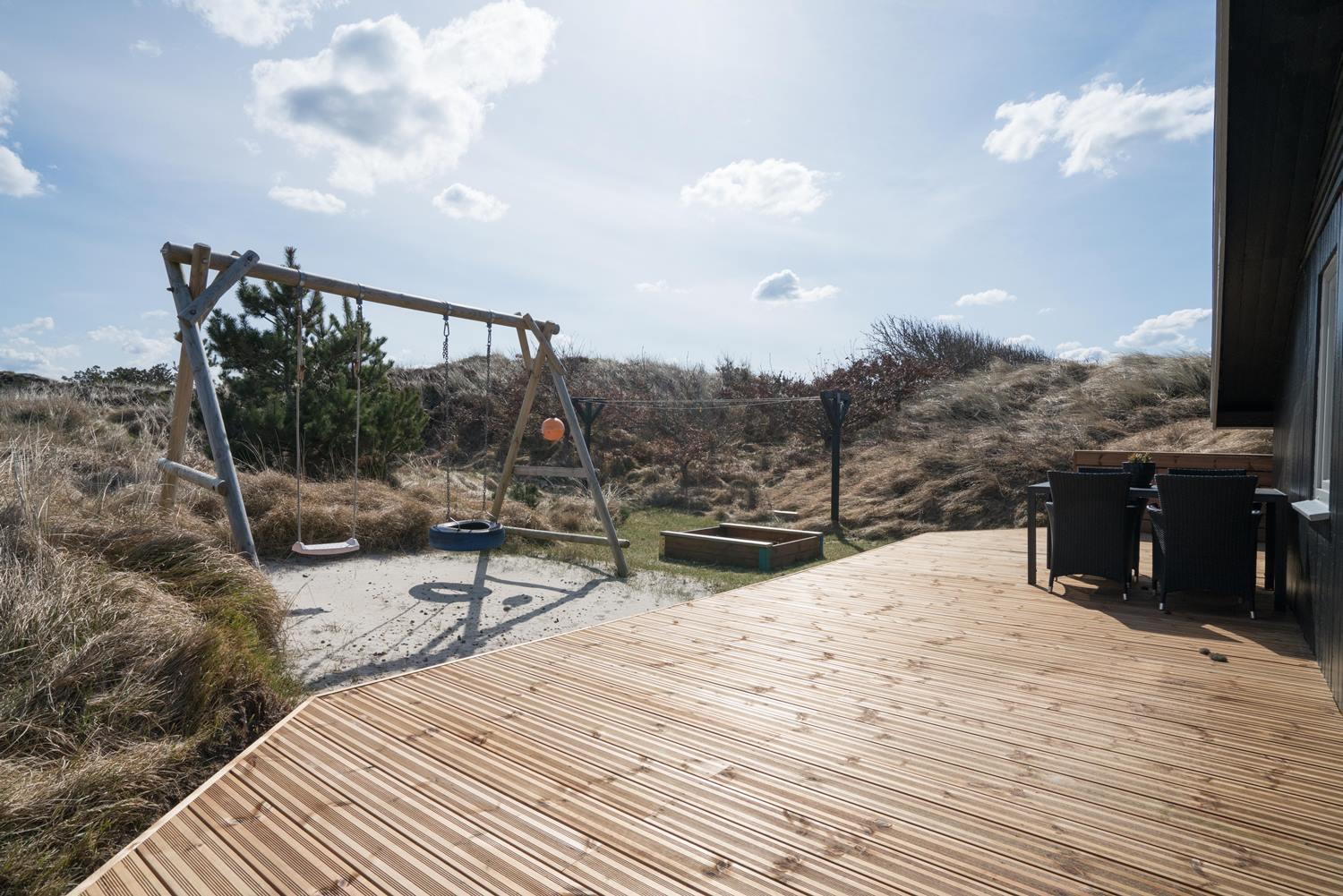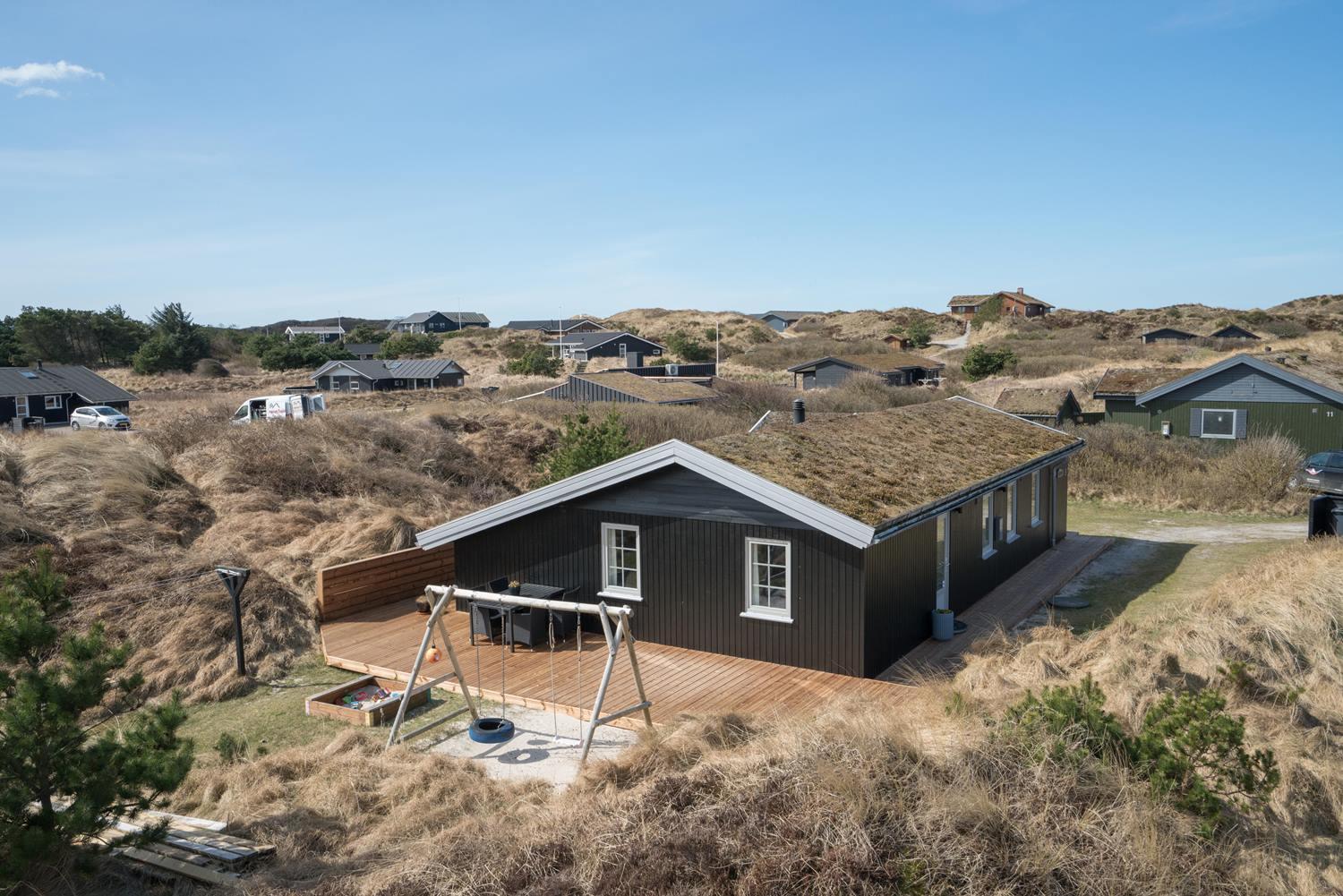 Velholdt feriehus nær Henne Strand med lys stue, brændeovn og to terrasser med udsigt over klitterne.