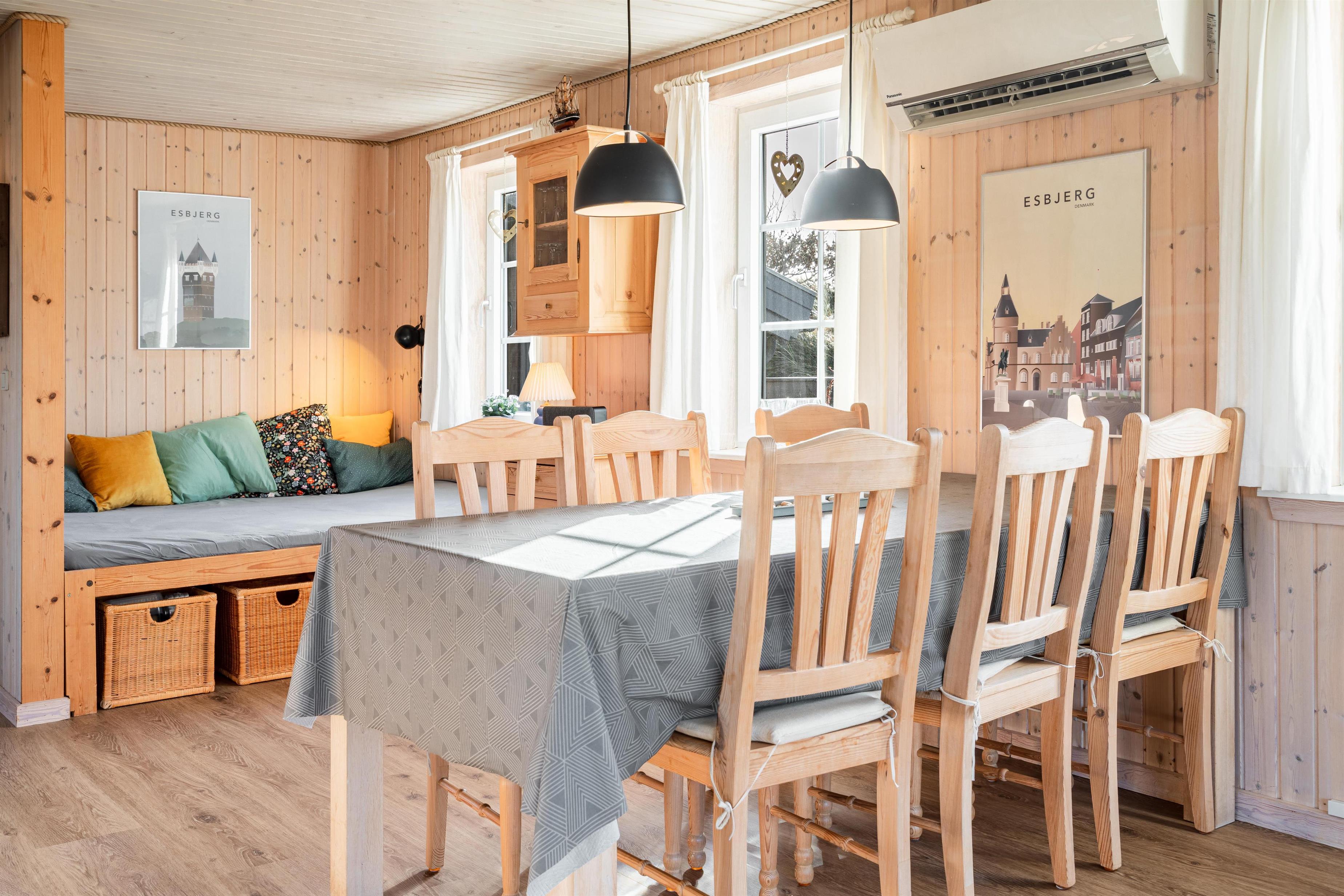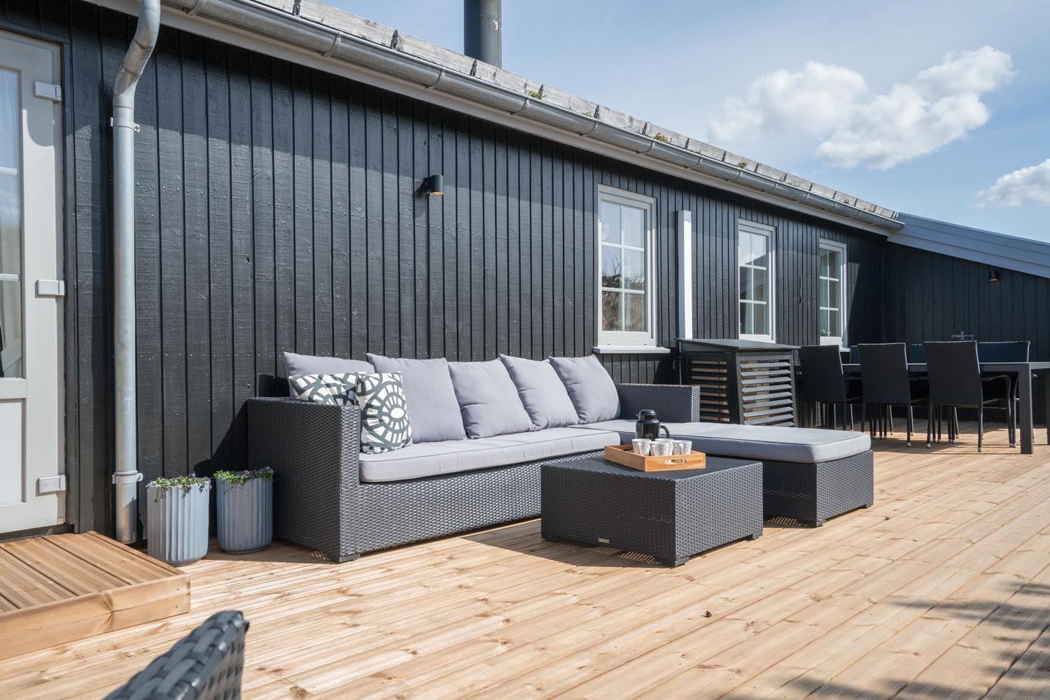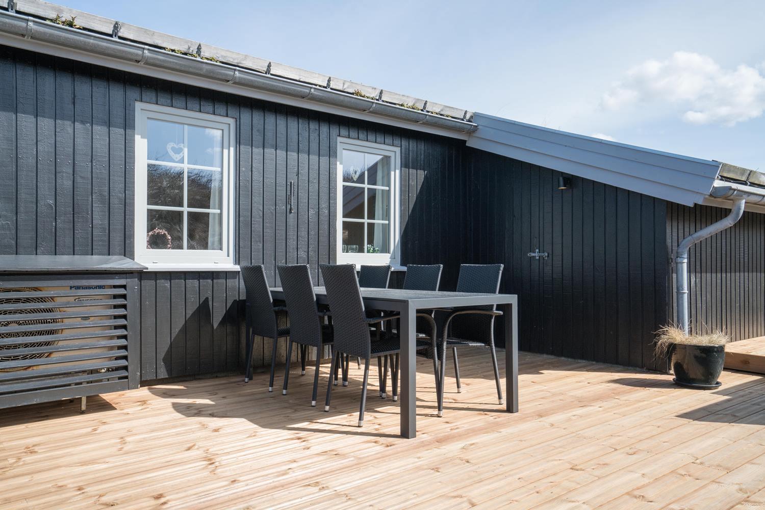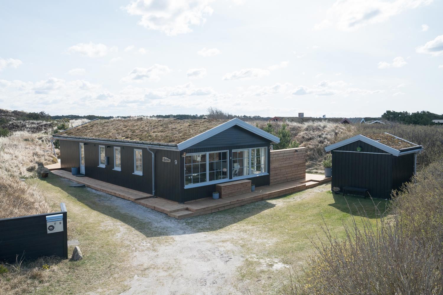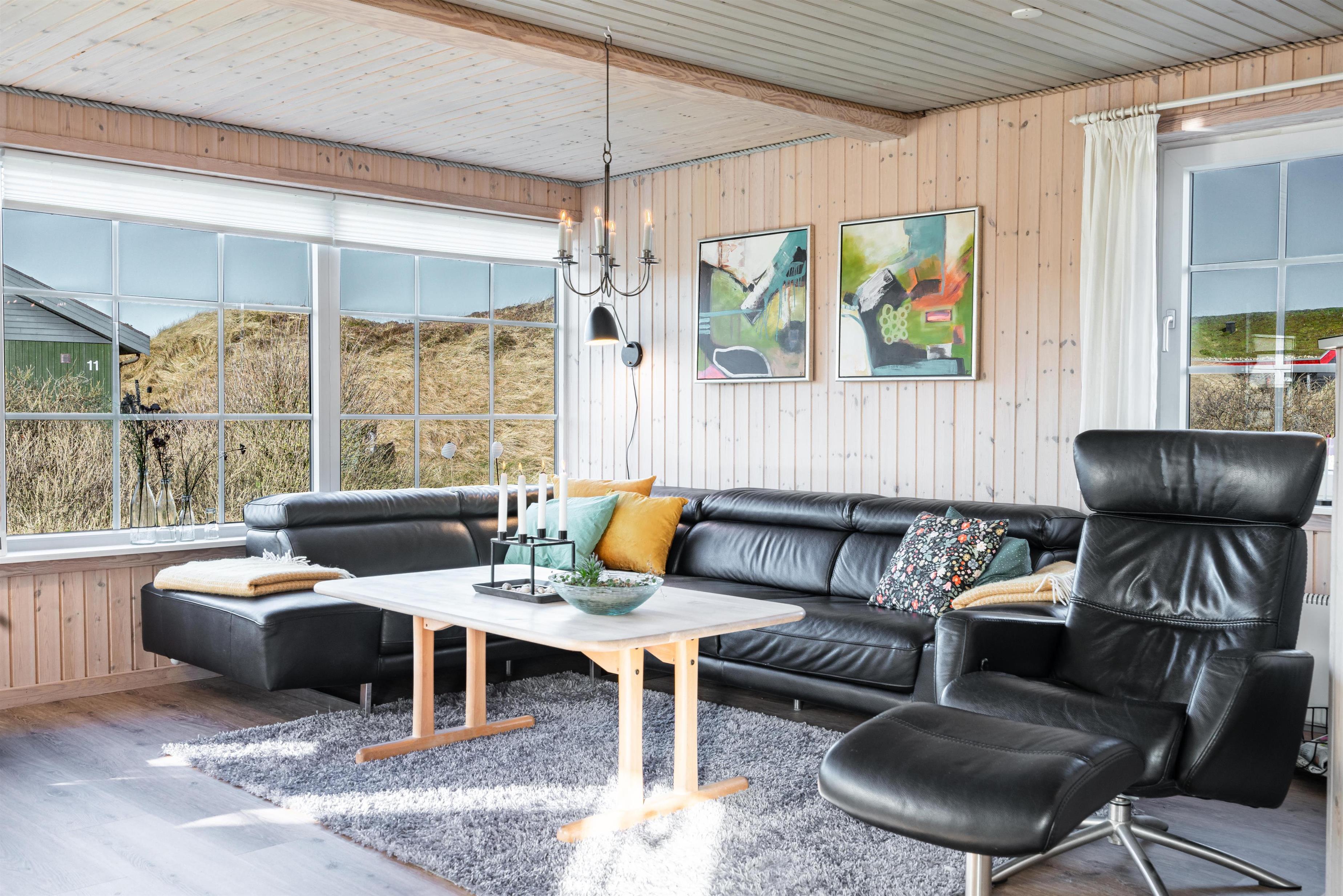 Velholdt feriehus nær Henne Strand med lys stue, brændeovn og to terrasser med udsigt over klitterne.