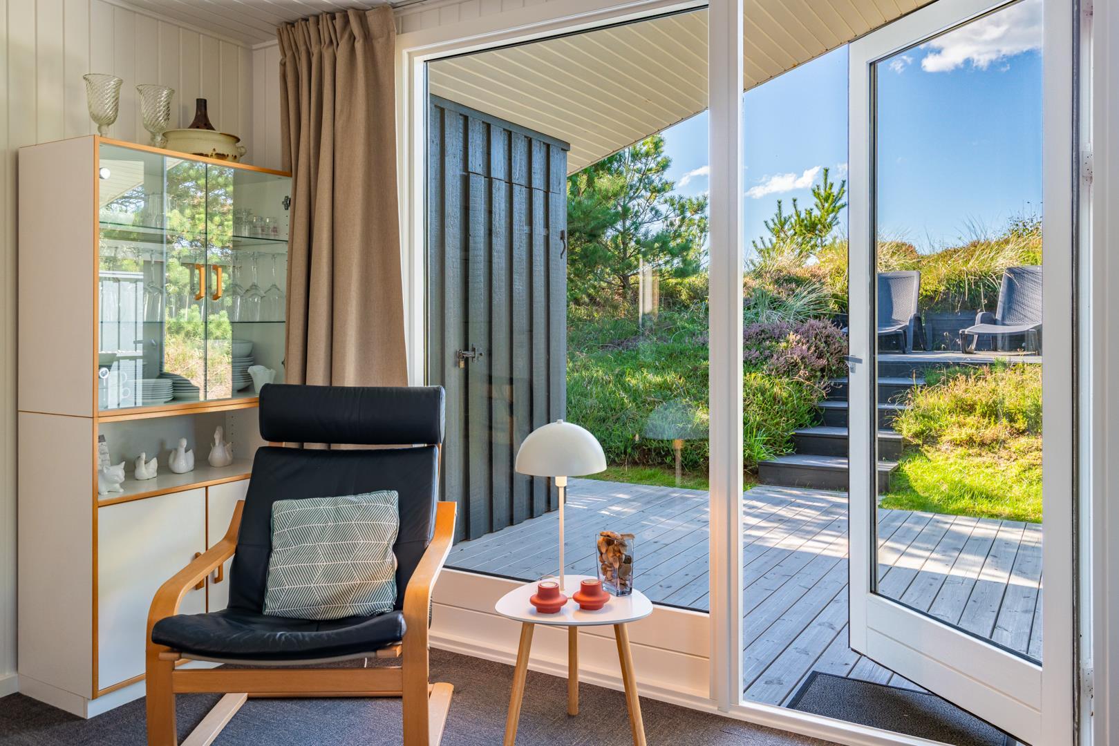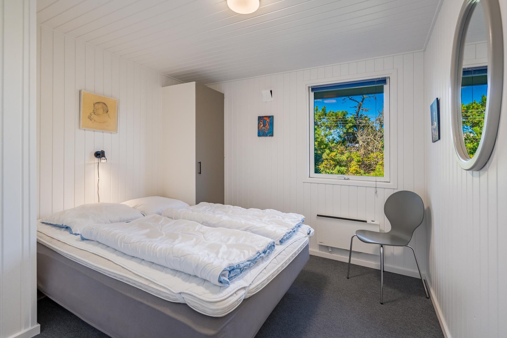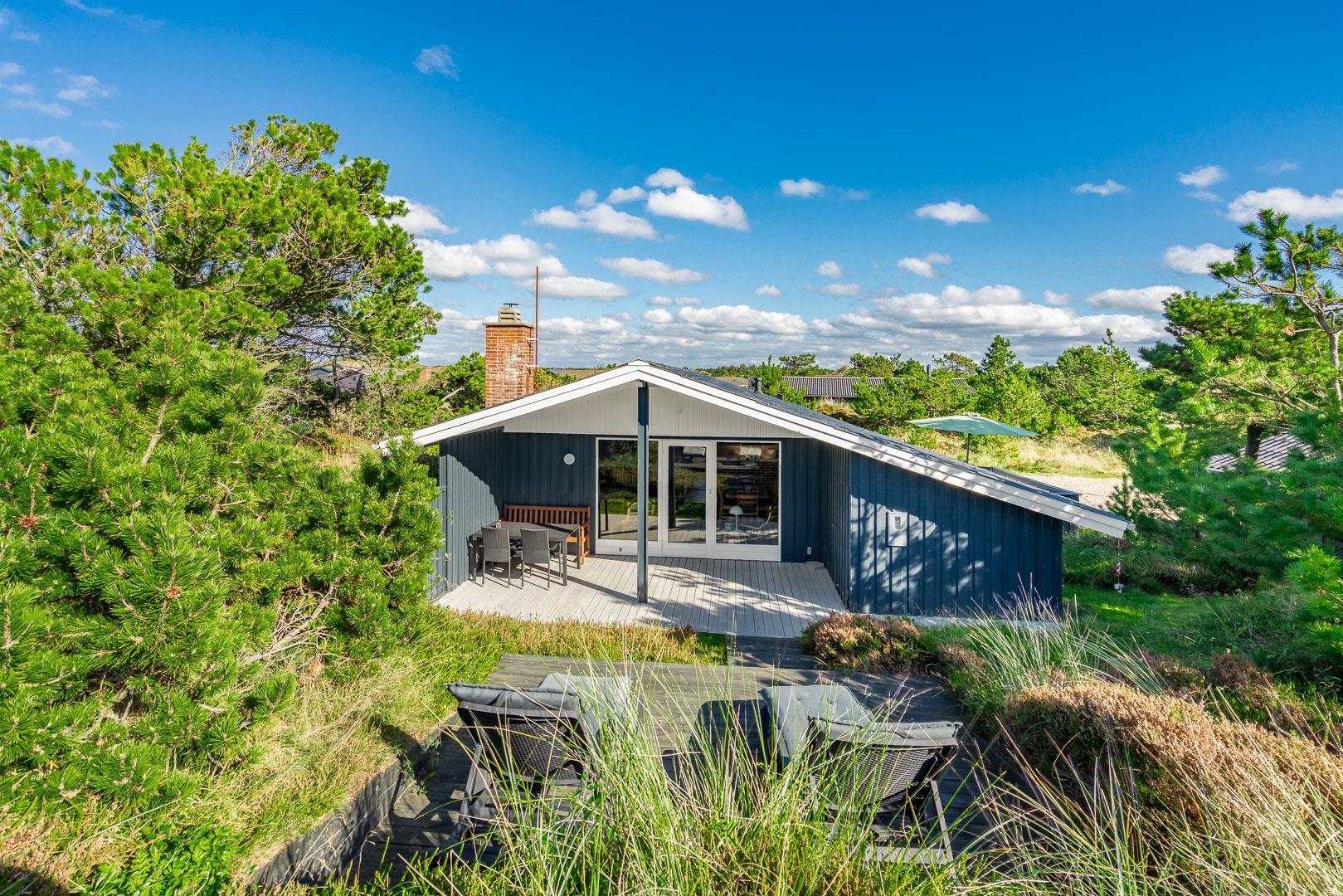 I rolige omgivelser på en flot og kuperet naturgrund ligger dette meget velholdte og løbende renoverede feriehus. Til huset hører stor, lukket samt en mindre overdækket terrasse. Flot nyere badeværelse. Det nye køkken (2025) er kombineret med stuen. Den hyggelige opholdsstue er indrettet med gode møbler. 3 værelser 2 med dobbeltseng og 1 med 2 enkeltsenge. Til børnene findes der barneseng og høj barnestol samt gynge på grunden. Skur til bl.a. cykler.
