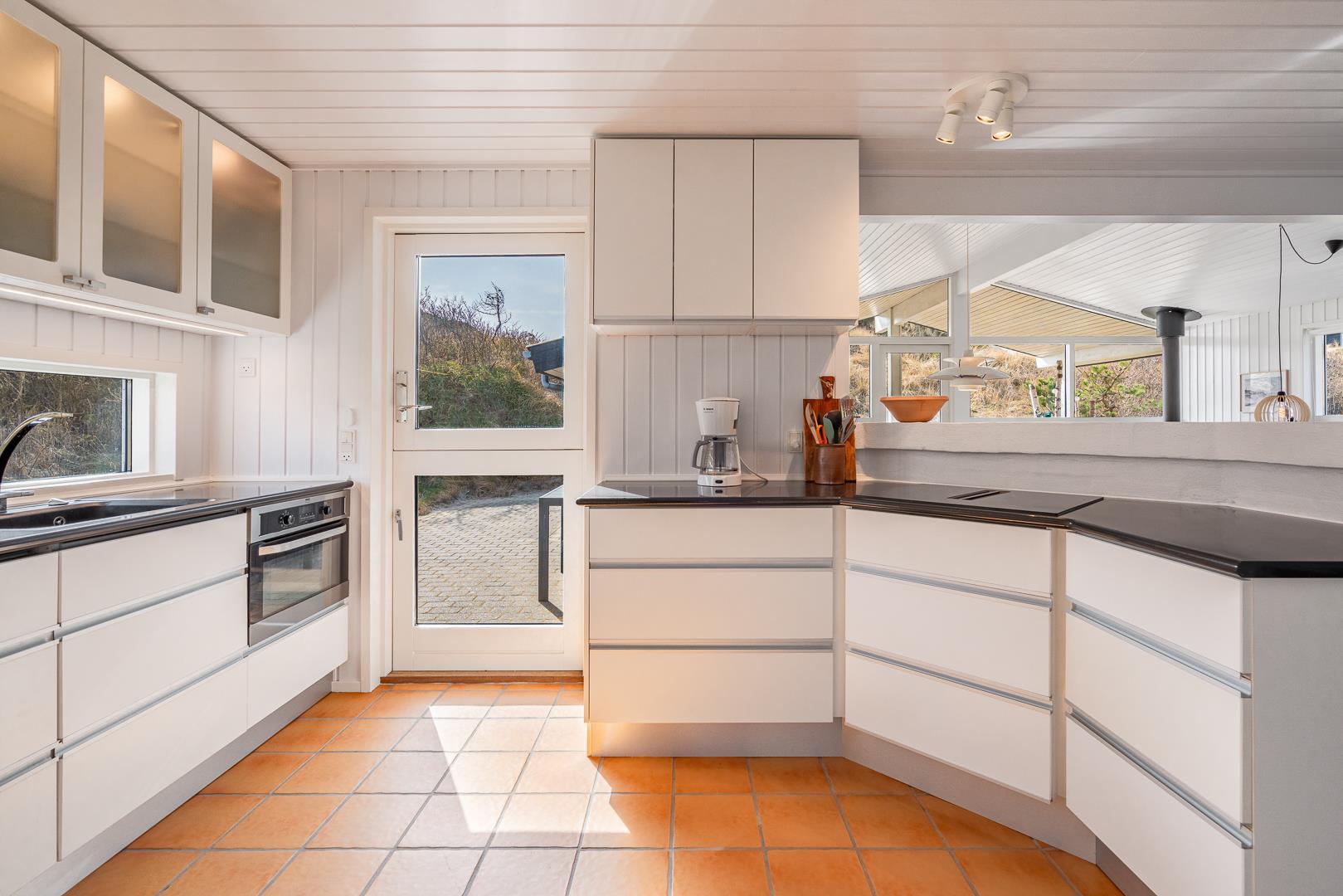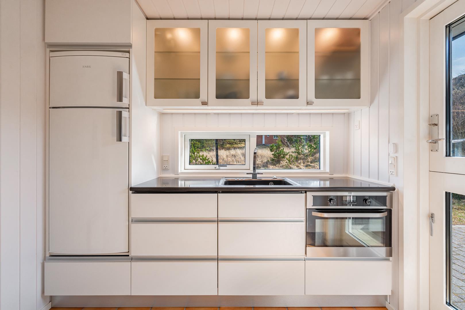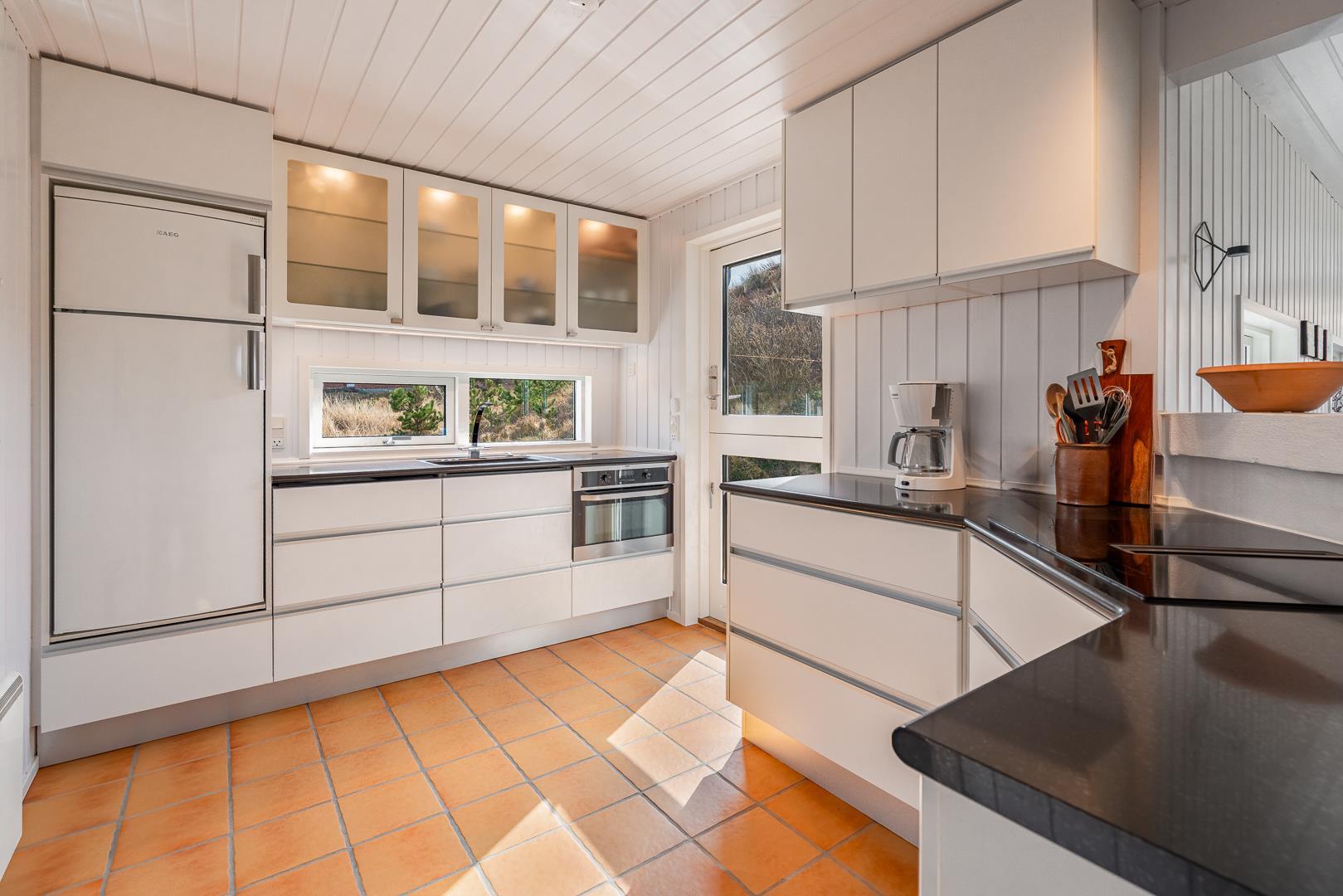 Køkkenet er funktionelt og veludstyret, perfekt til madlavning, mens du stadig kan være en del af familiens aktiviteter, takket være den åbne indretning, der gør det muligt at følge med i, hvad der foregår i stuen.