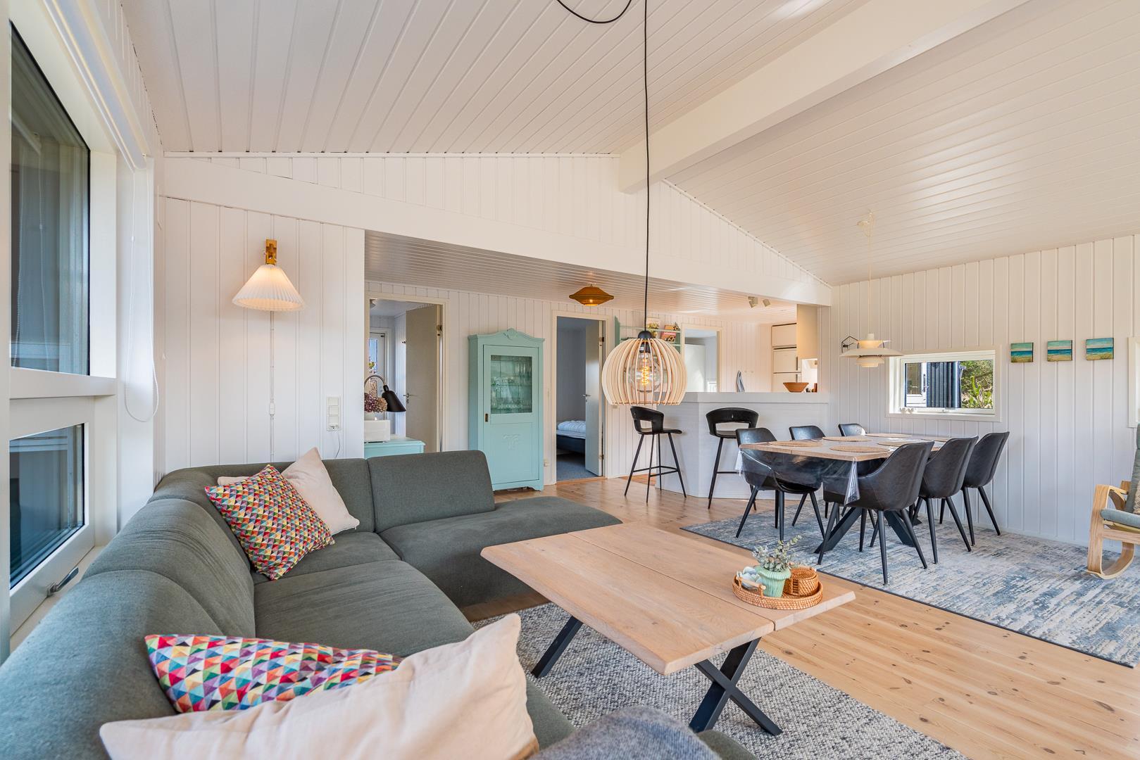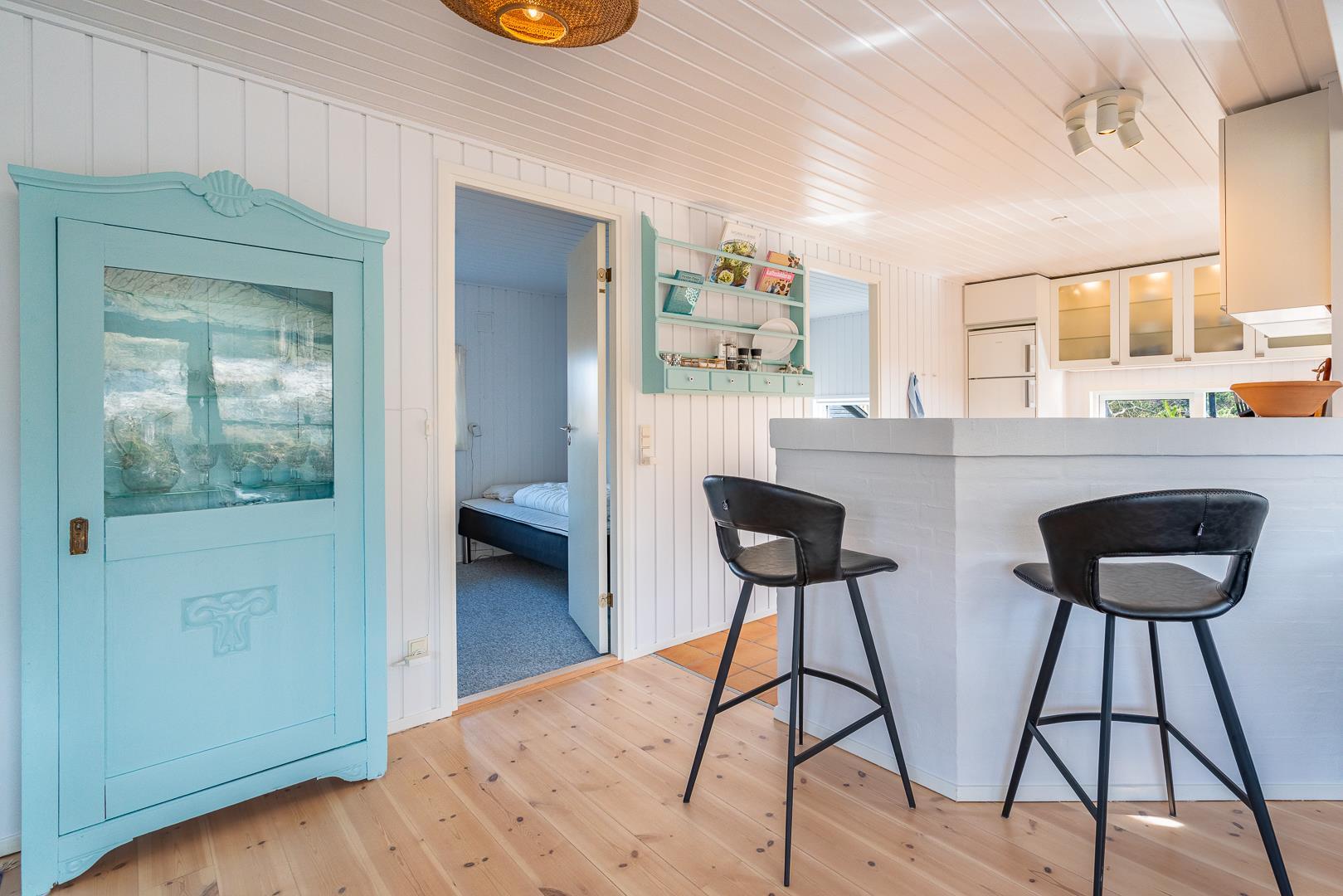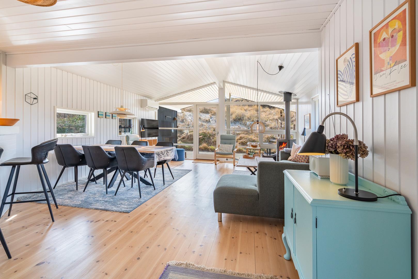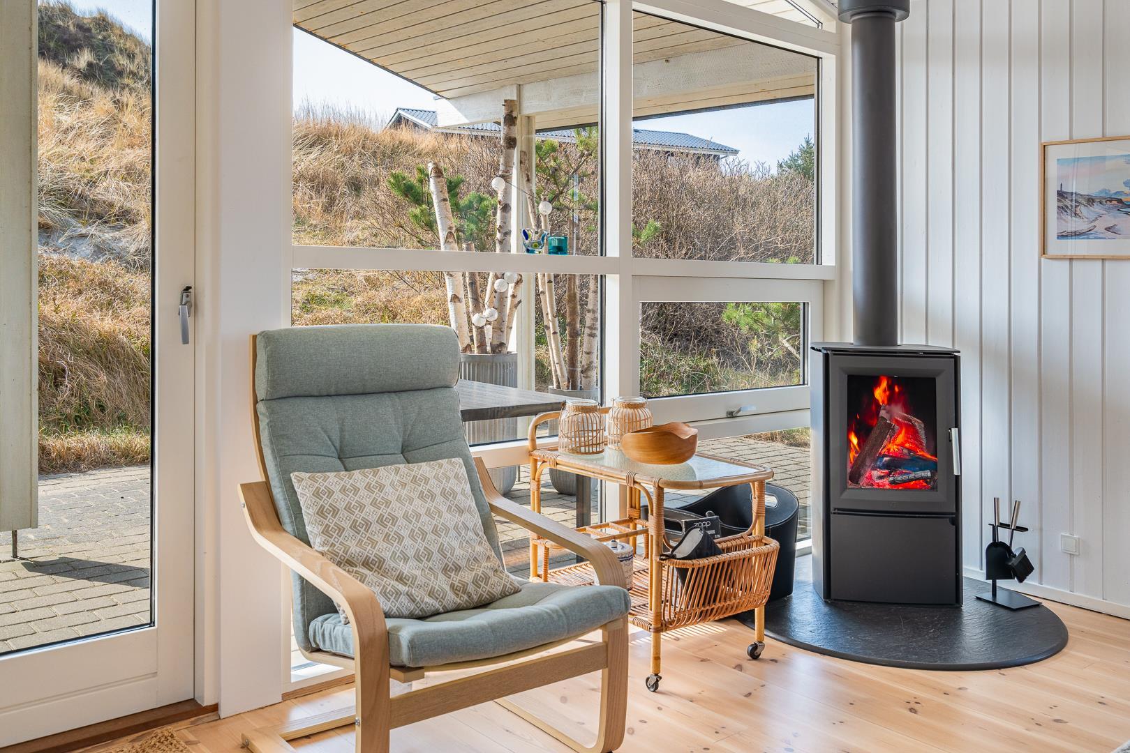 Sommerhuset er indrettet med stor omtanke og sans for gode detaljer. Det kombinerer hygge med moderne komfort på en smagfuld måde, hvilket giver en hjemlig atmosfære fra første øjeblik. Den store, lyse stue fungerer som sommerhusets hjerte, hvor der er plads til både afslapning og fællesskab. Her kan du sætte dig til rette med en god bog foran brændeovnen, som hurtigt spreder en behagelig varme i hele rummet, og skaber en hyggelig stemning, især på kølige aftener.