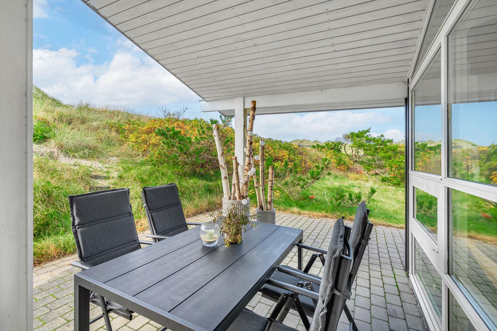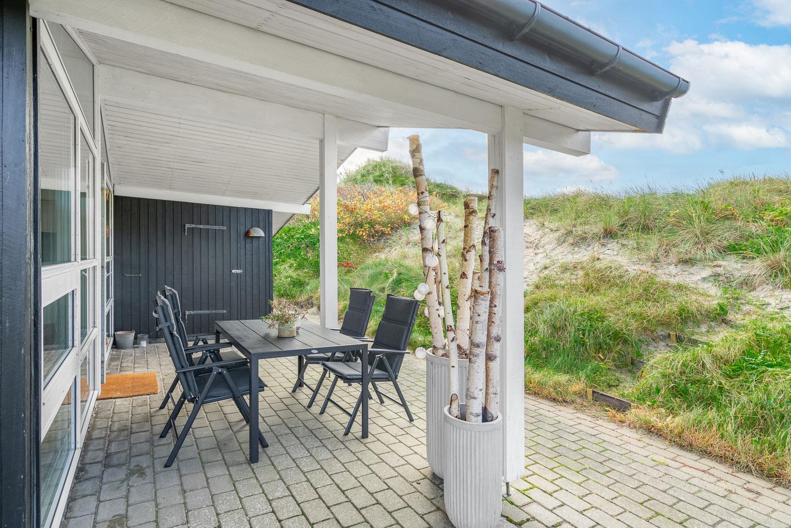 Fra stuen er der direkte adgang til en delvist overdækket og ugeneret terrasse. Her kan du nyde dine måltider under åben himmel, når vejret tillader det, og lytte til naturens lyde eller blot lade tankerne flyde frit.