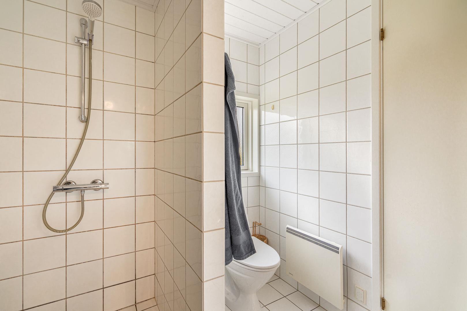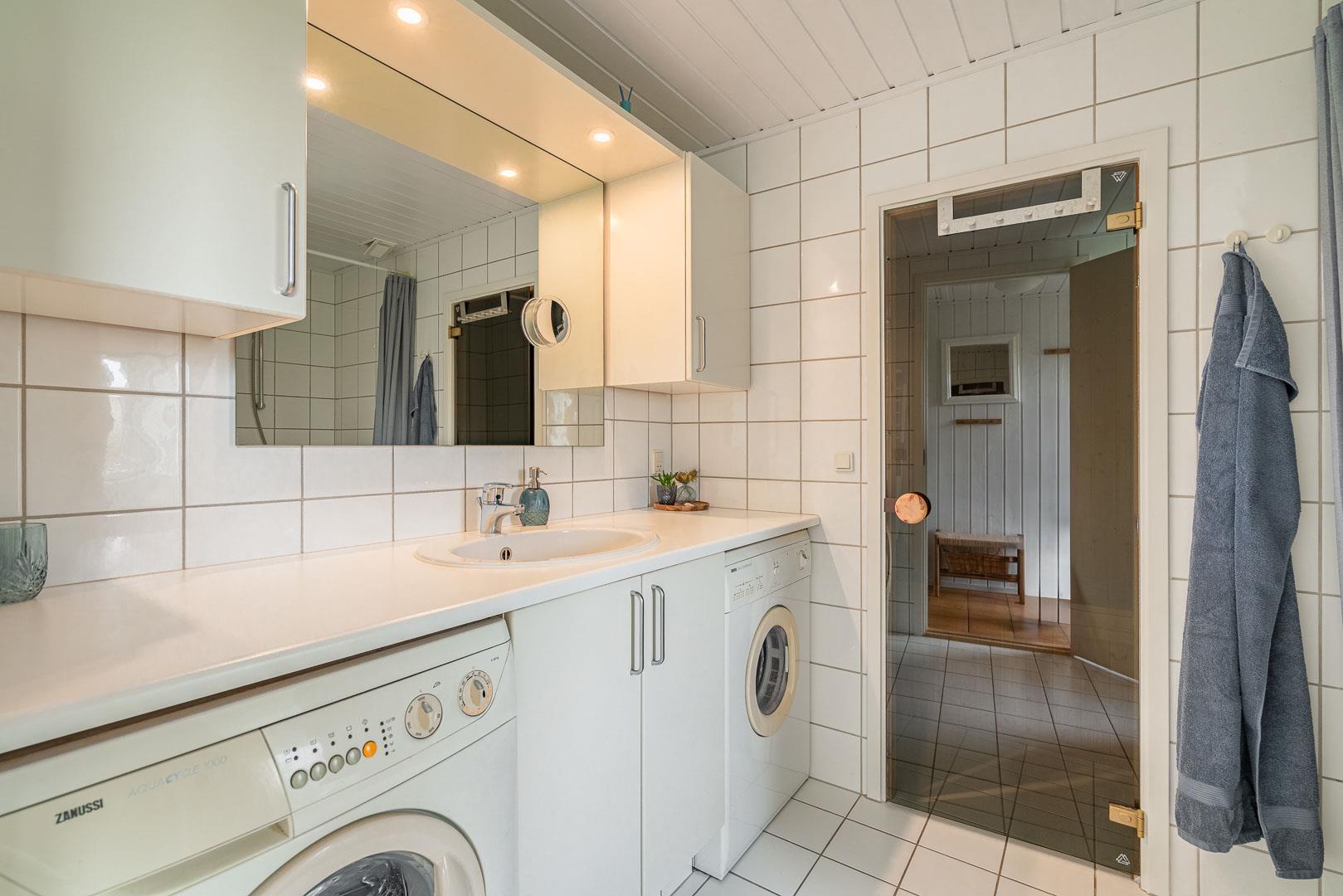 Sommerhuset byder også på et rummeligt badeværelse, som er indrettet med en sauna – det ideelle sted at varme sig op og slappe af efter en lang dag ved stranden. Saunaen er en sand luksus, der gør det muligt at forkæle sig selv med lidt ekstra velvære.