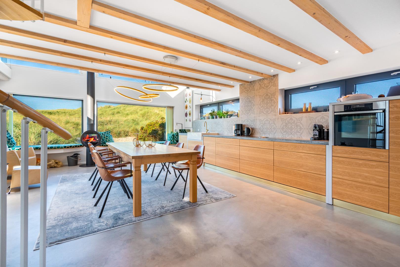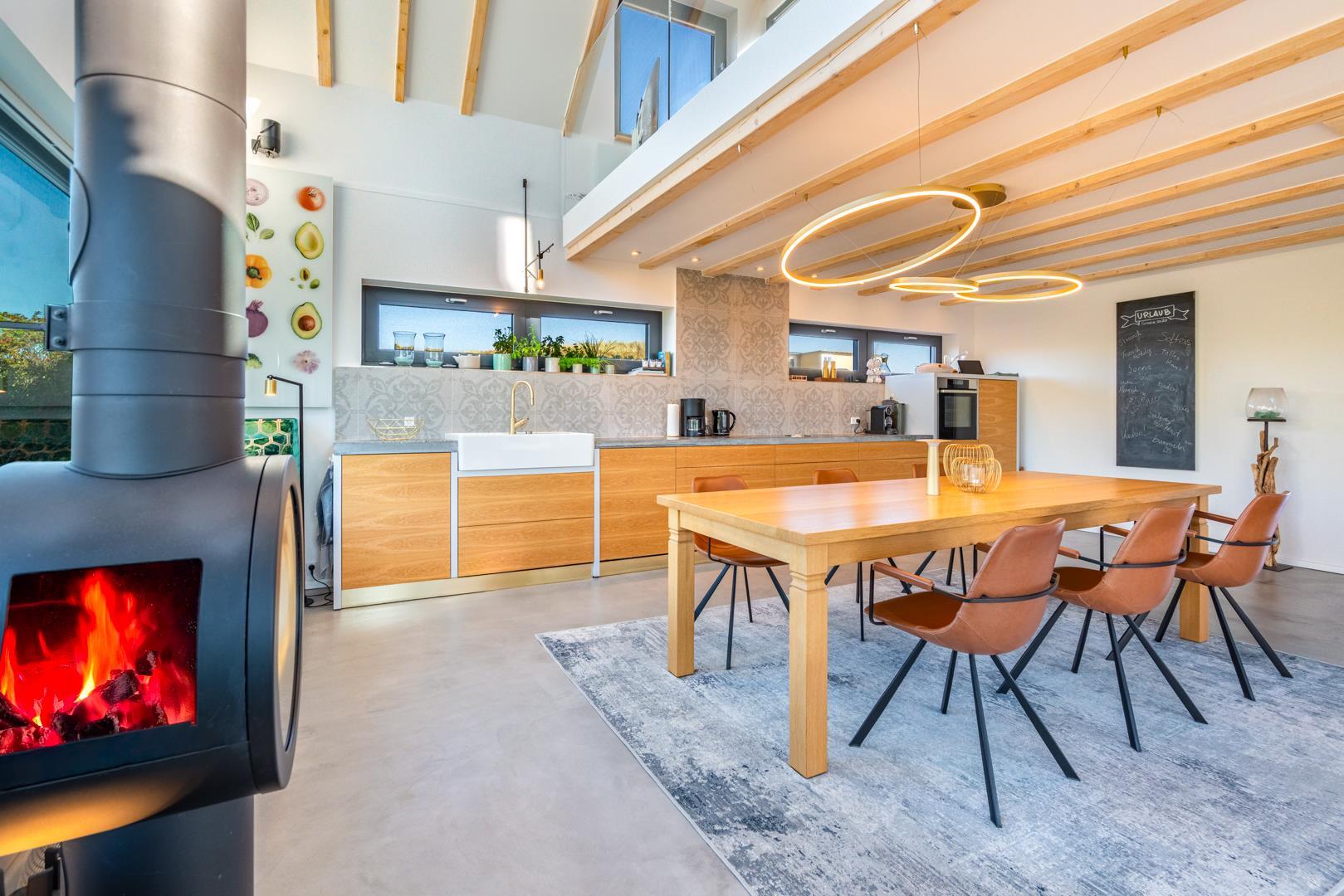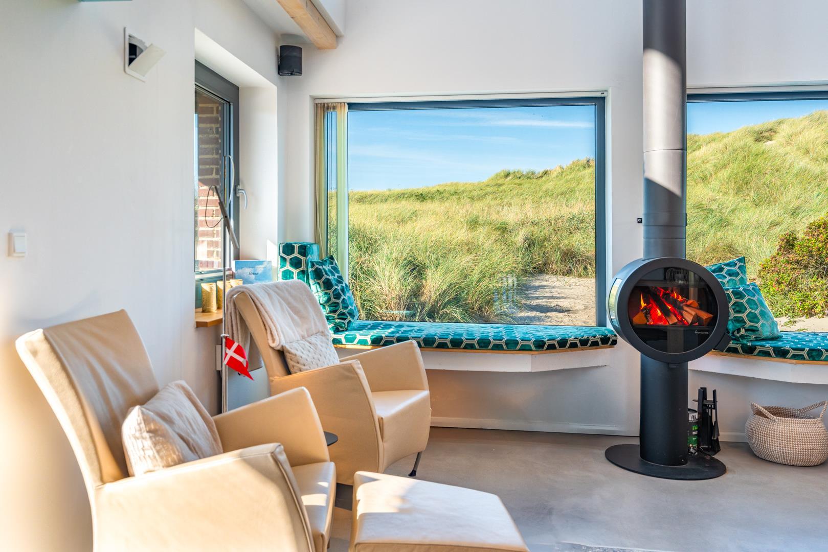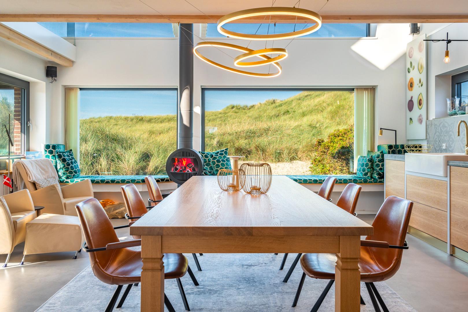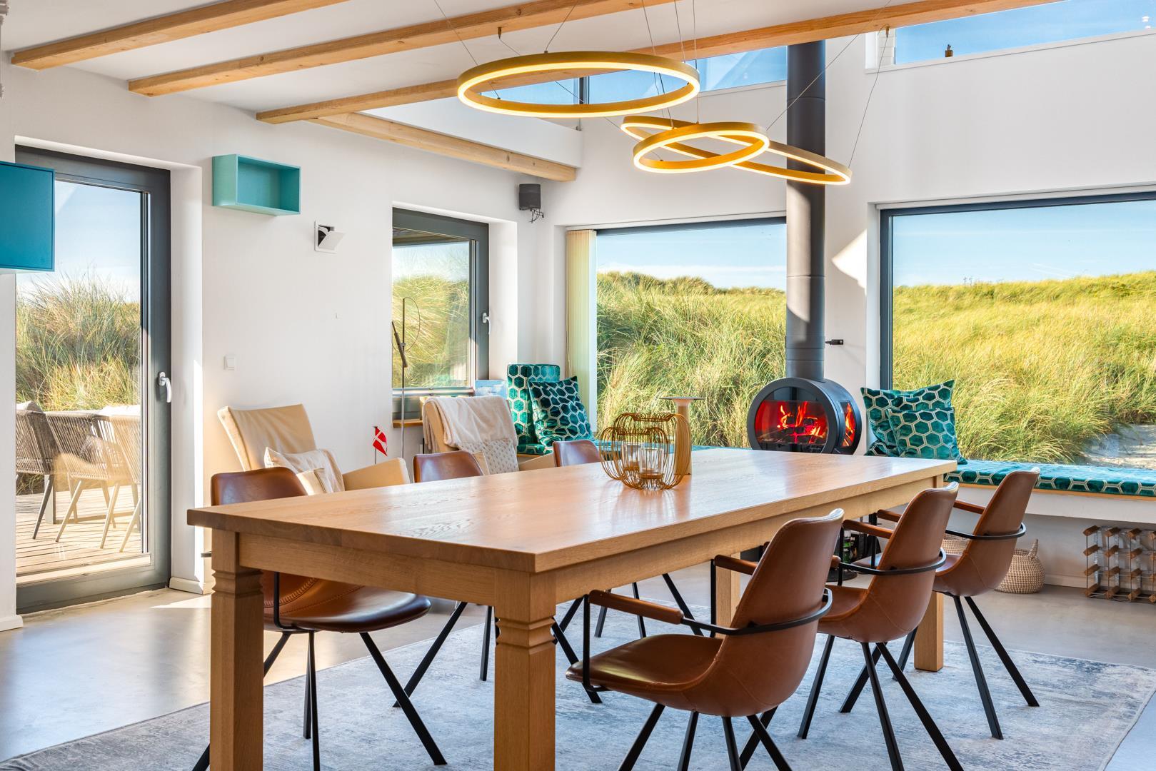 Det fuldt udstyrede køkken danner sammen med det store spisebord og det store rum hjertet i huset. Tykke hynder i vindueskarmen inviterer dig til at slappe af. Den stilfulde pejs fremkalder en hyggelig atmosfære og komplementerer de energibesparende infrarøde varmeapparater på kolde dage.