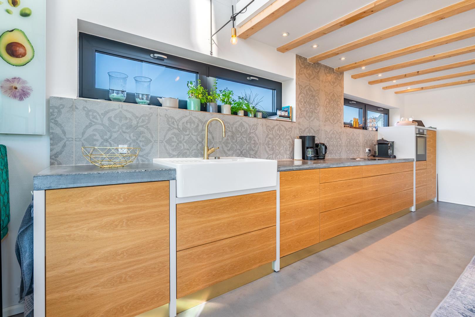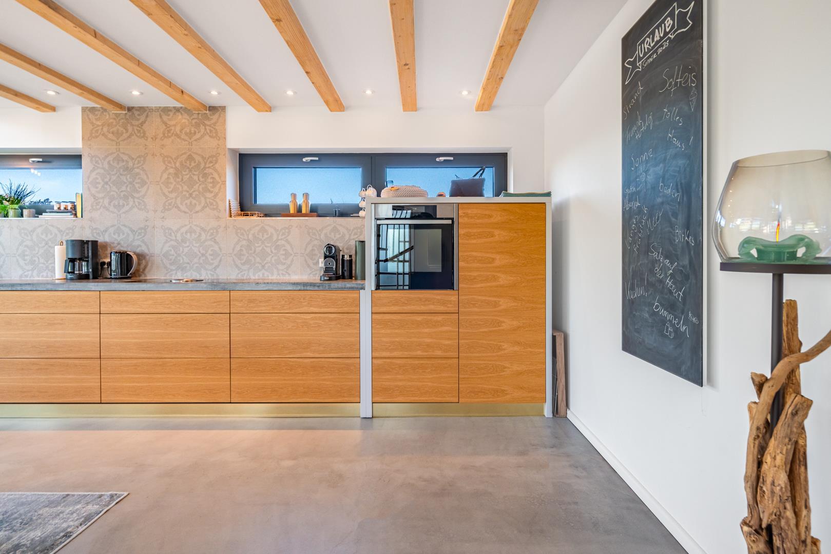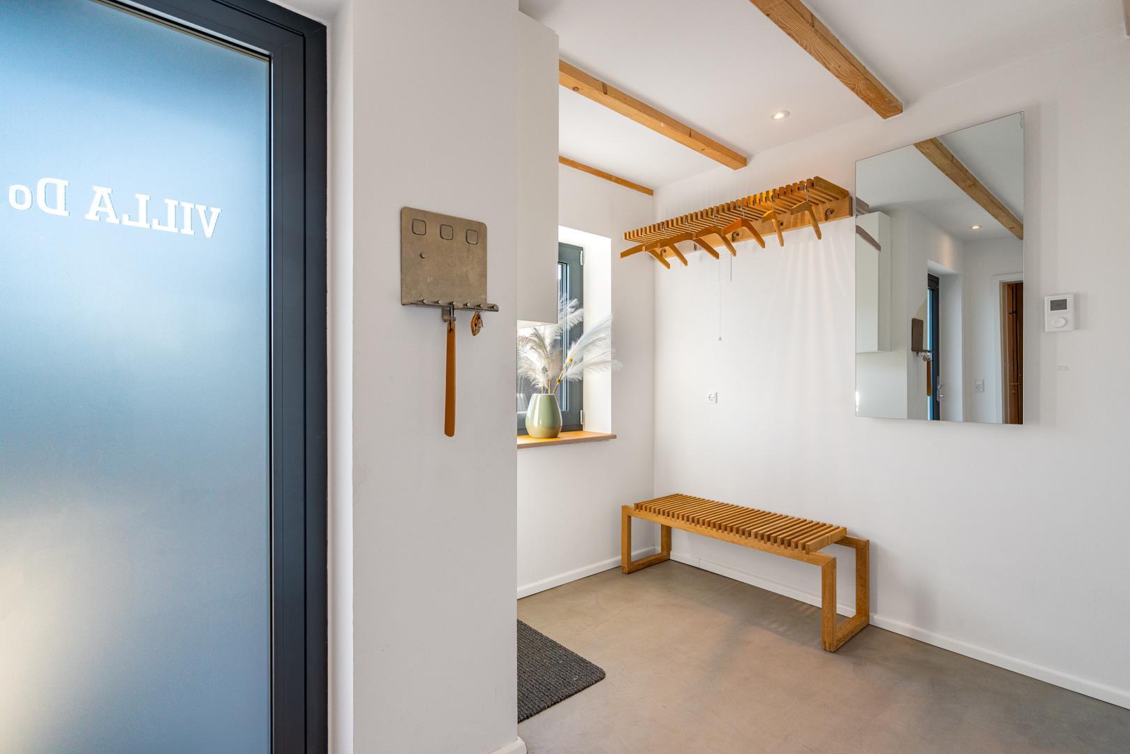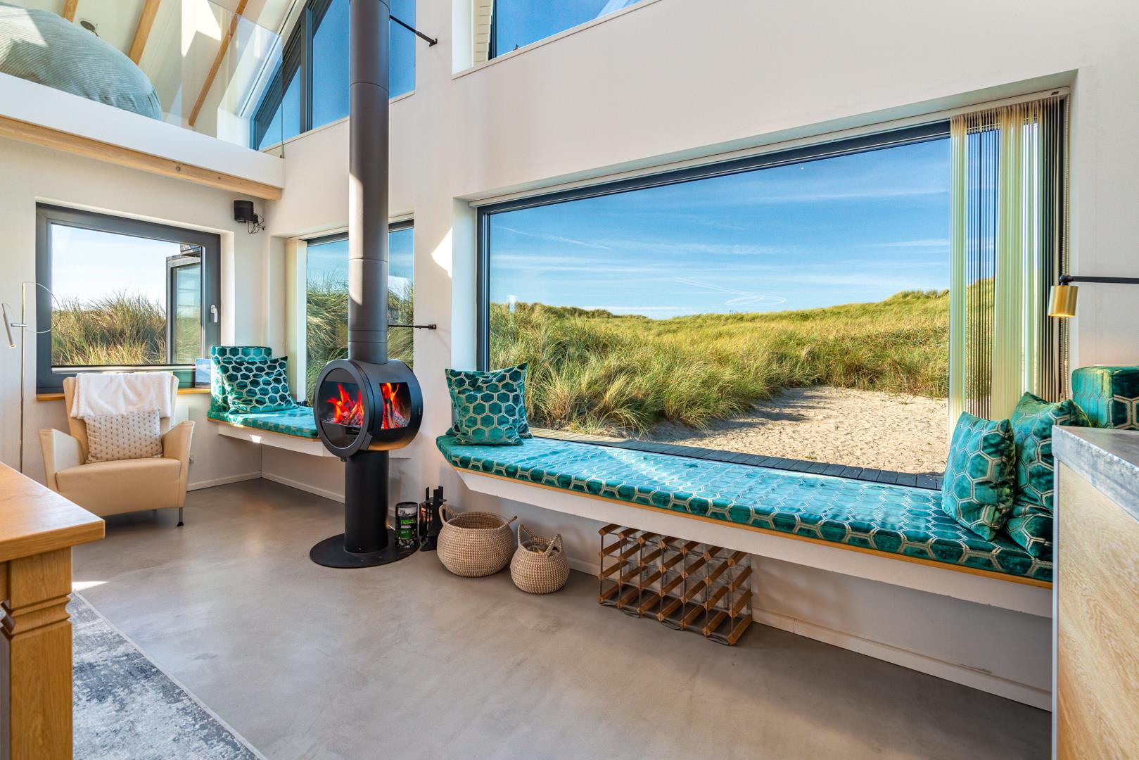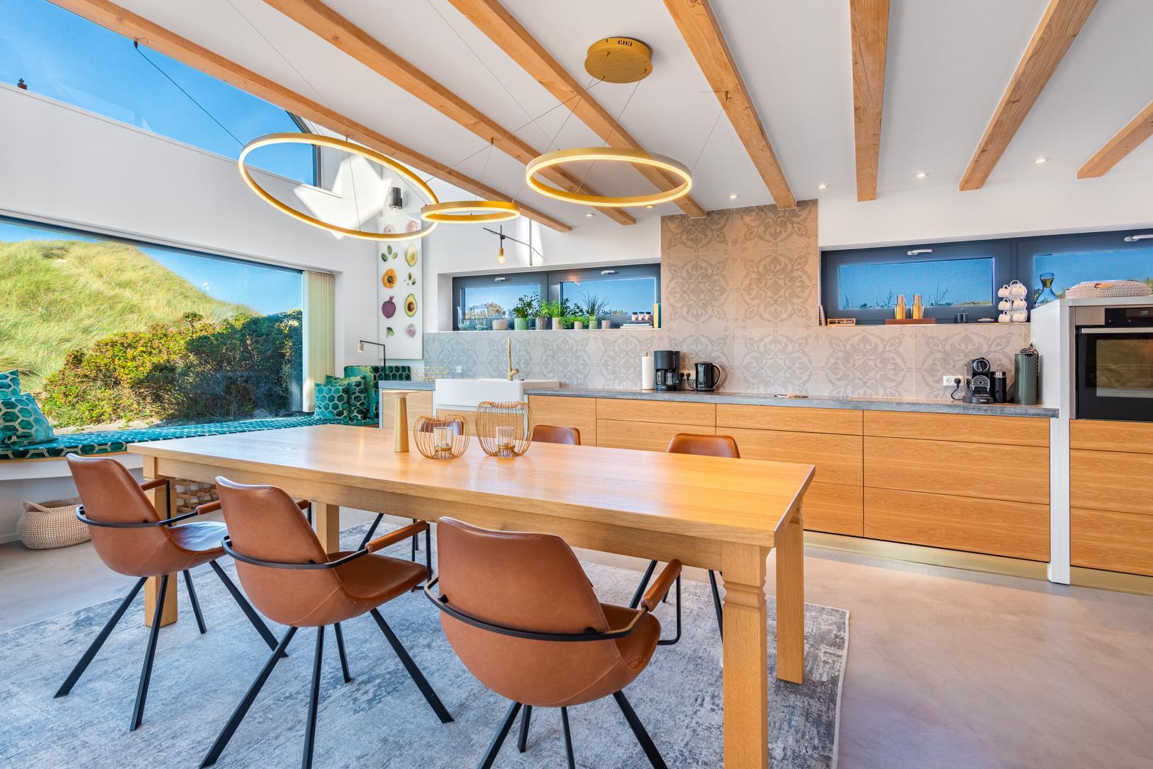 Det fuldt udstyrede køkken danner sammen med det store spisebord og det store rum hjertet i huset. Tykke hynder i vindueskarmen inviterer dig til at slappe af. Den stilfulde pejs fremkalder en hyggelig atmosfære og komplementerer de energibesparende infrarøde varmeapparater på kolde dage.