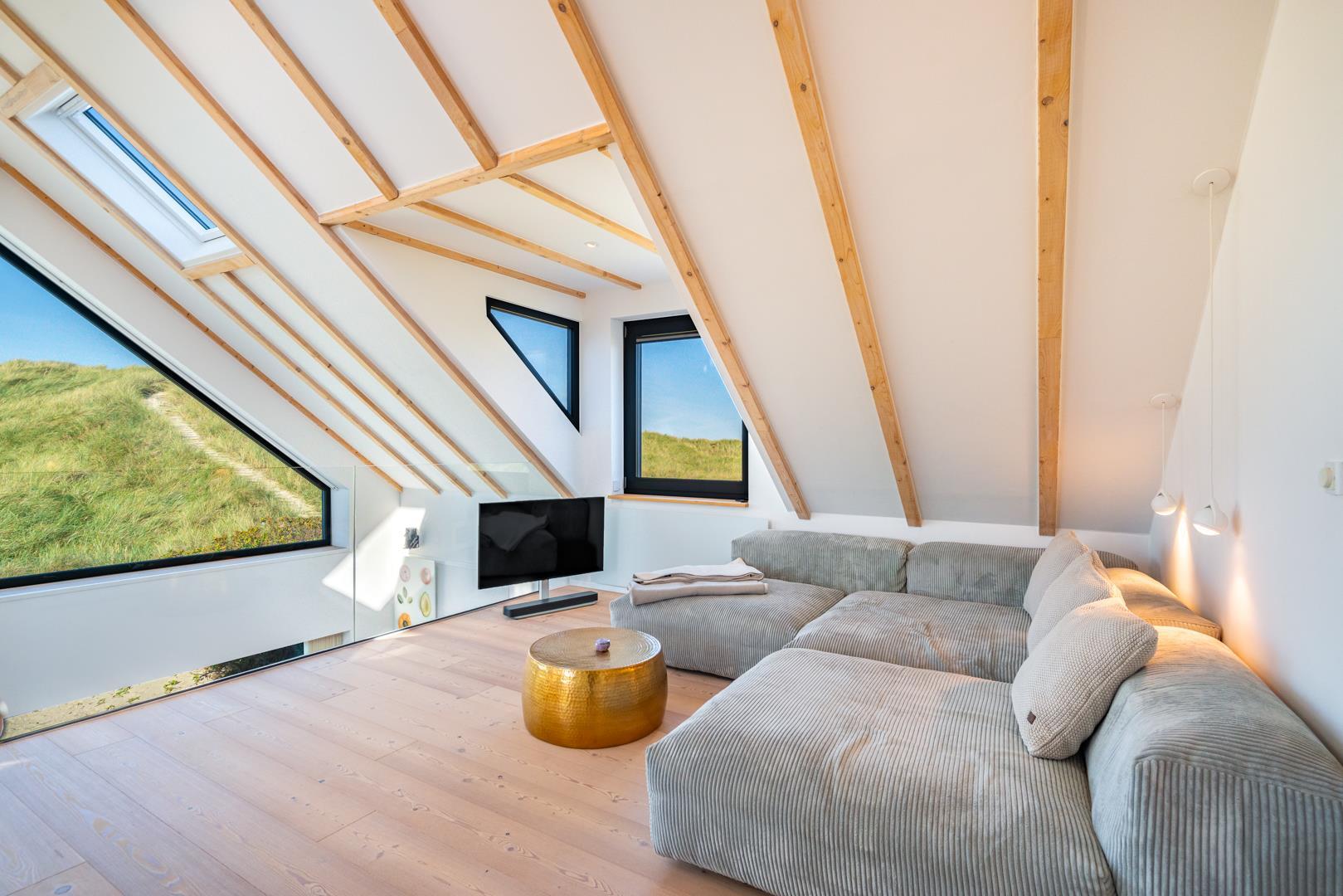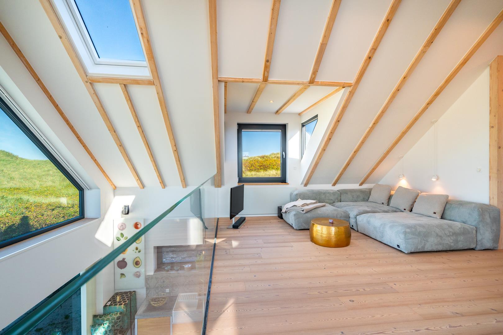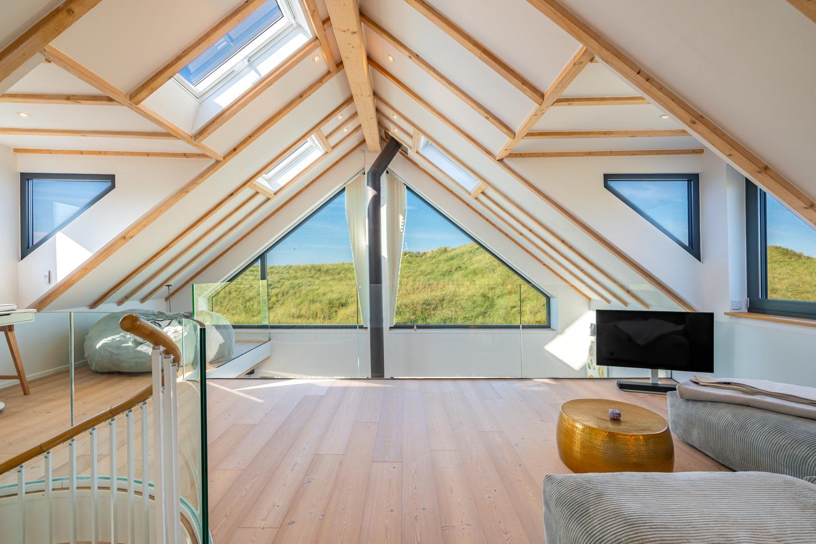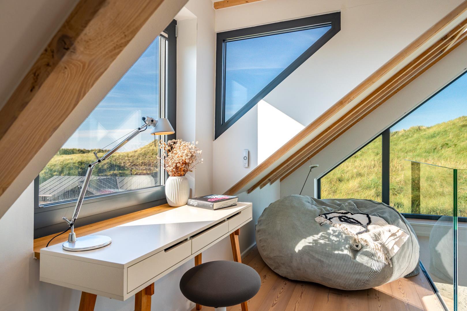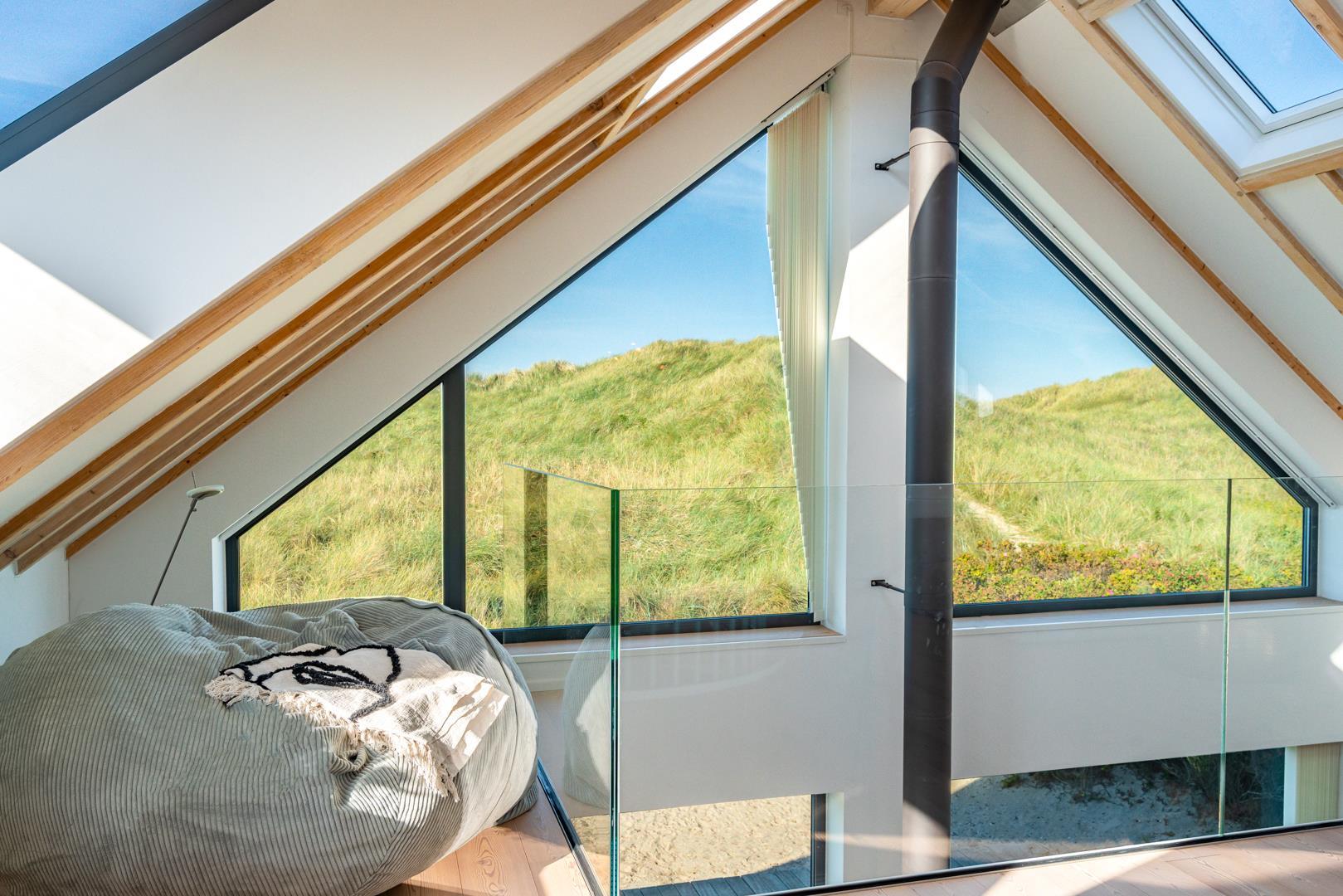 Huset har nu en anden etage, som byder på en fantastisk udsigt over det brede klitlandskab og aftenhimlen. Her finder du et andet soveværelse med en box madrasser, et lille yogarum, et lækkert badeværelse med finsk sauna med udsigt over havet og en infrarød sauna. Loungeområdet ovenpå med sofa og liggestol gør den afslappende ferie perfekt.