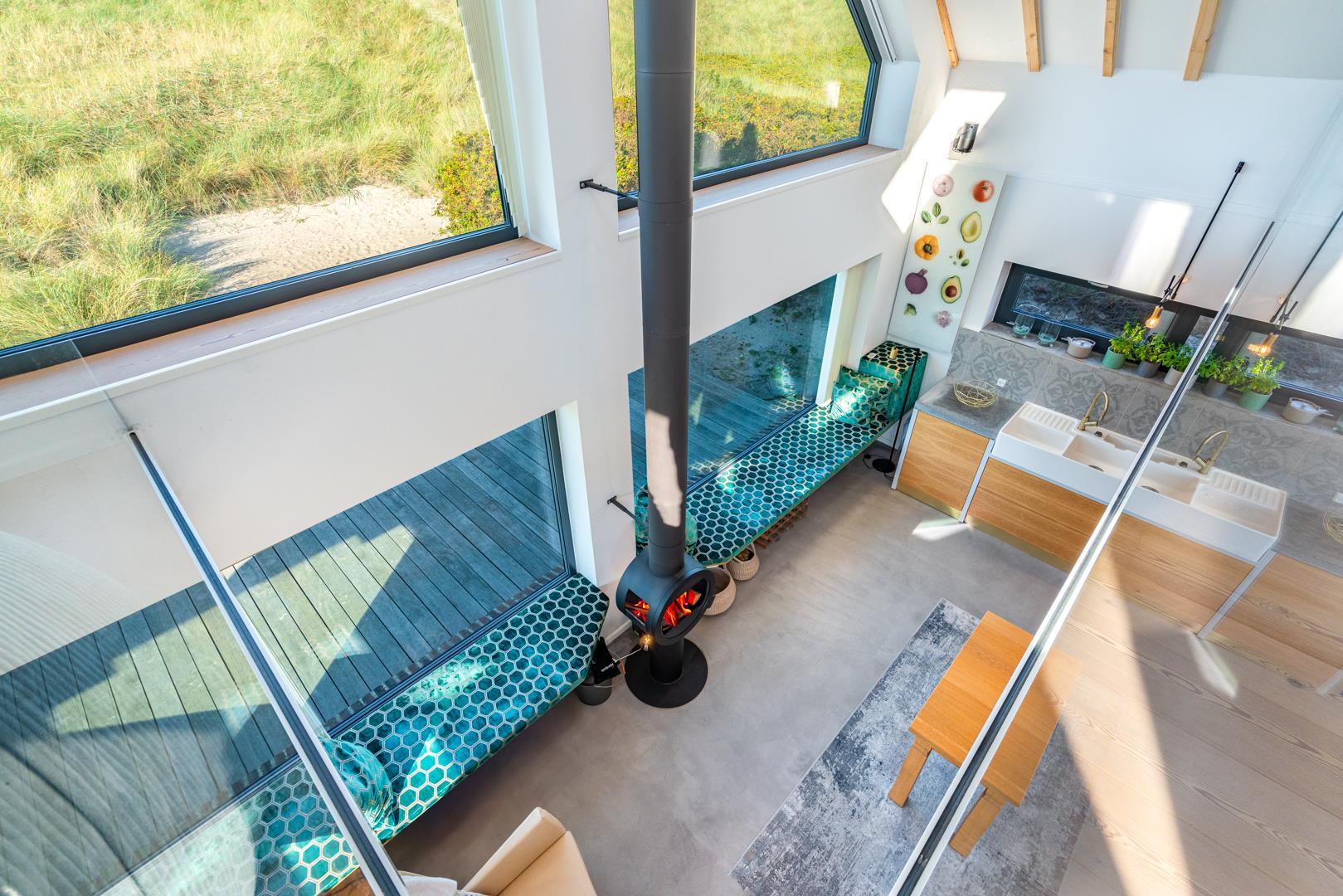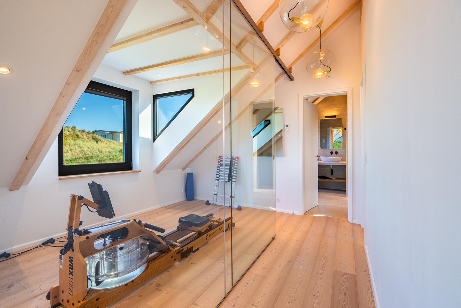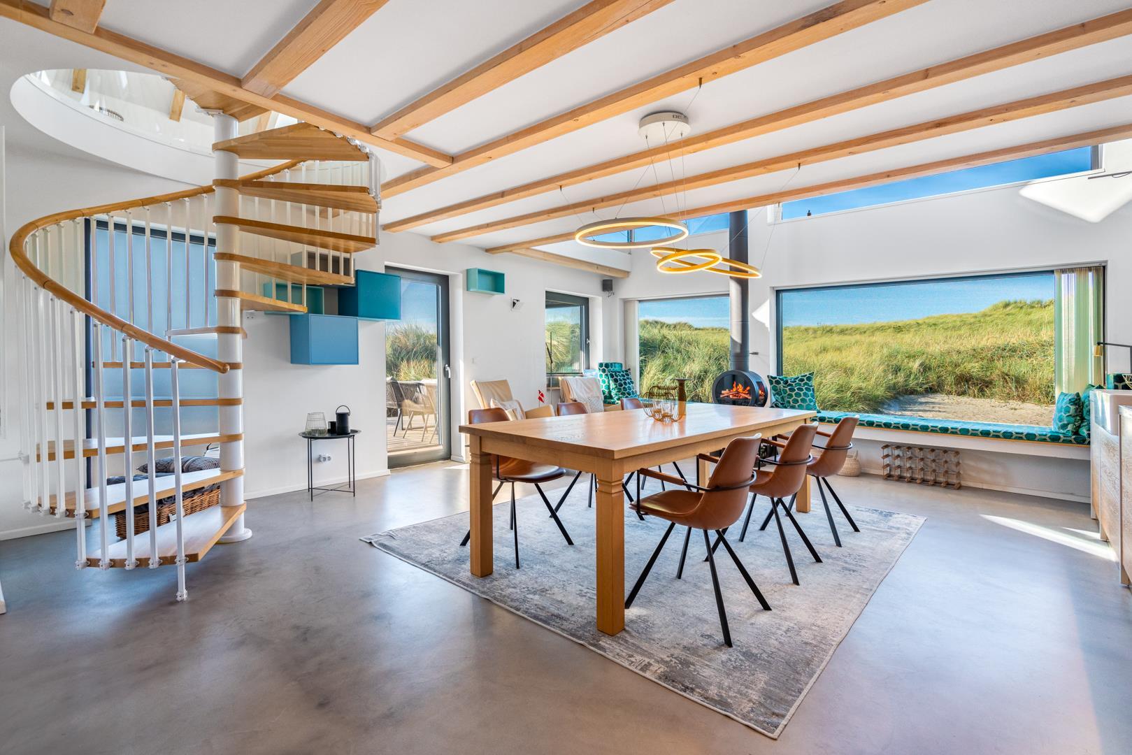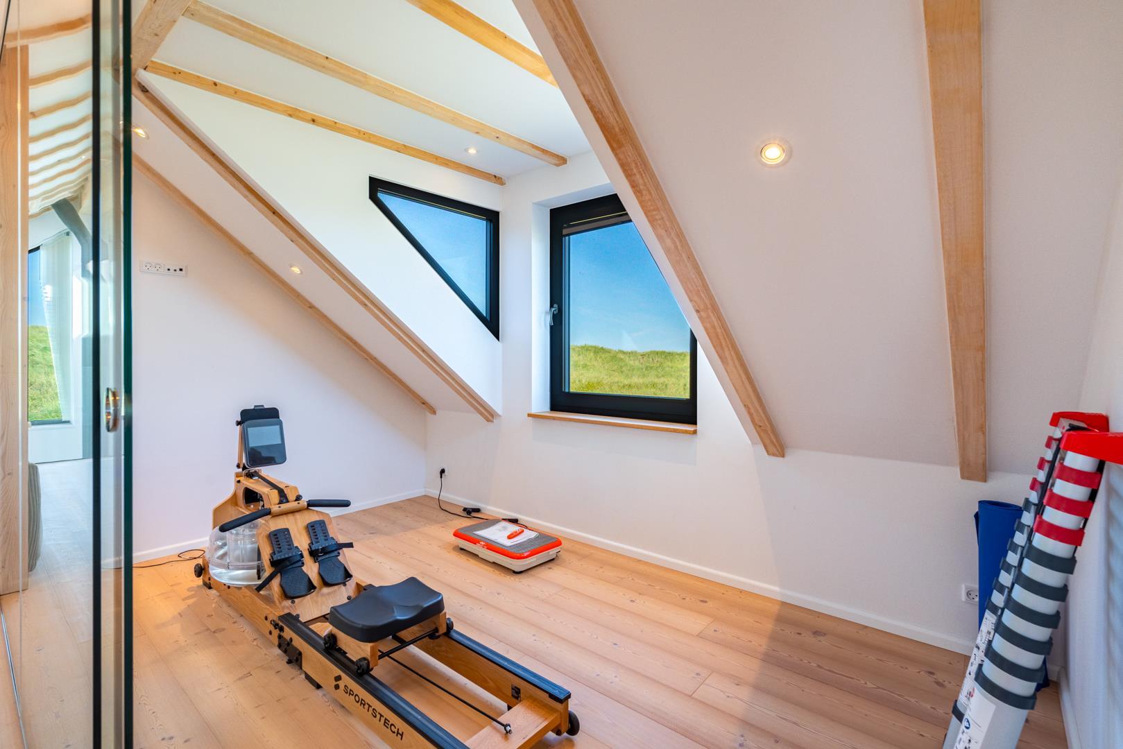 Huset har nu en anden etage, som byder på en fantastisk udsigt over det brede klitlandskab og aftenhimlen. Her finder du et andet soveværelse med en box madrasser, et lille yogarum, et lækkert badeværelse med finsk sauna med udsigt over havet og en infrarød sauna. Loungeområdet ovenpå med sofa og liggestol gør den afslappende ferie perfekt.