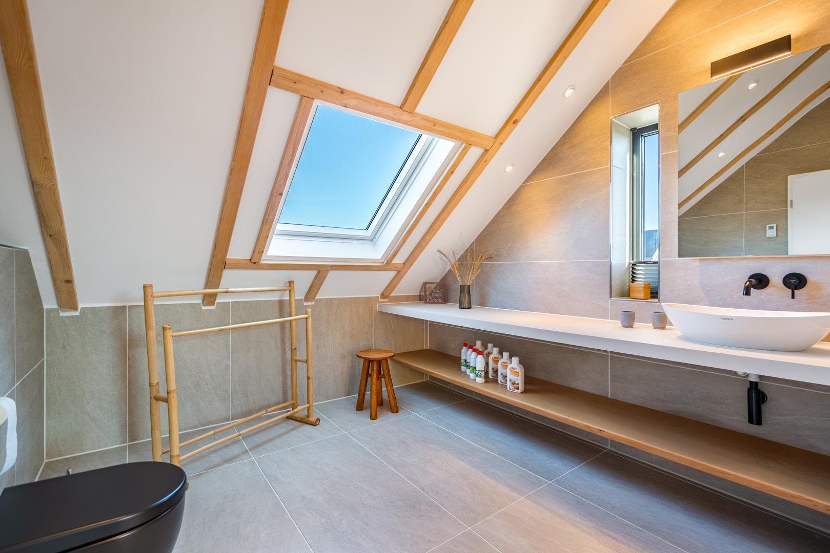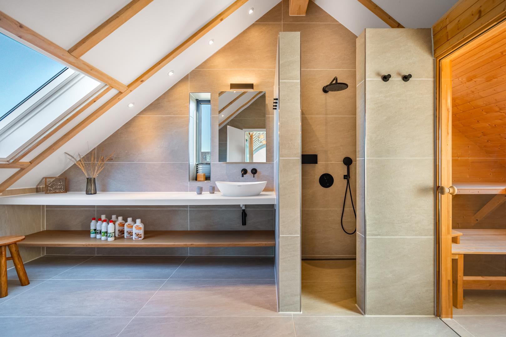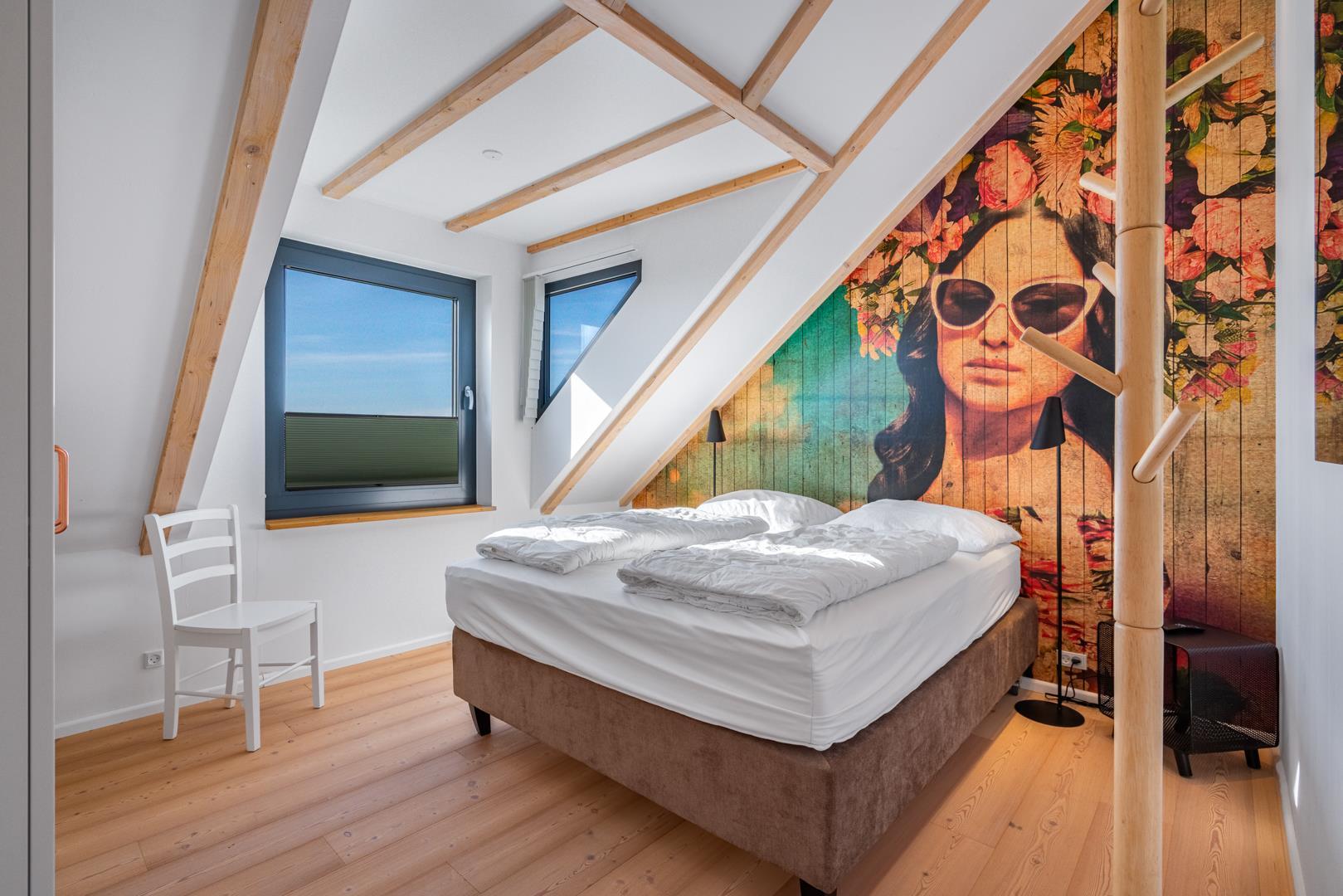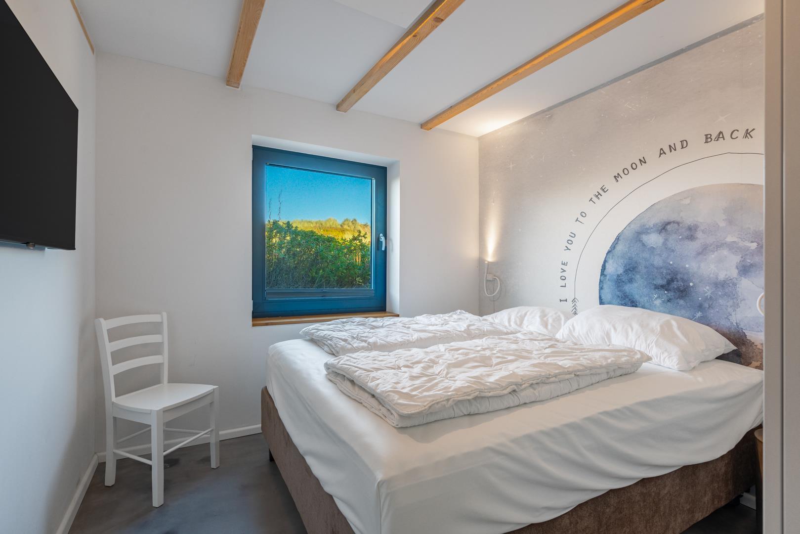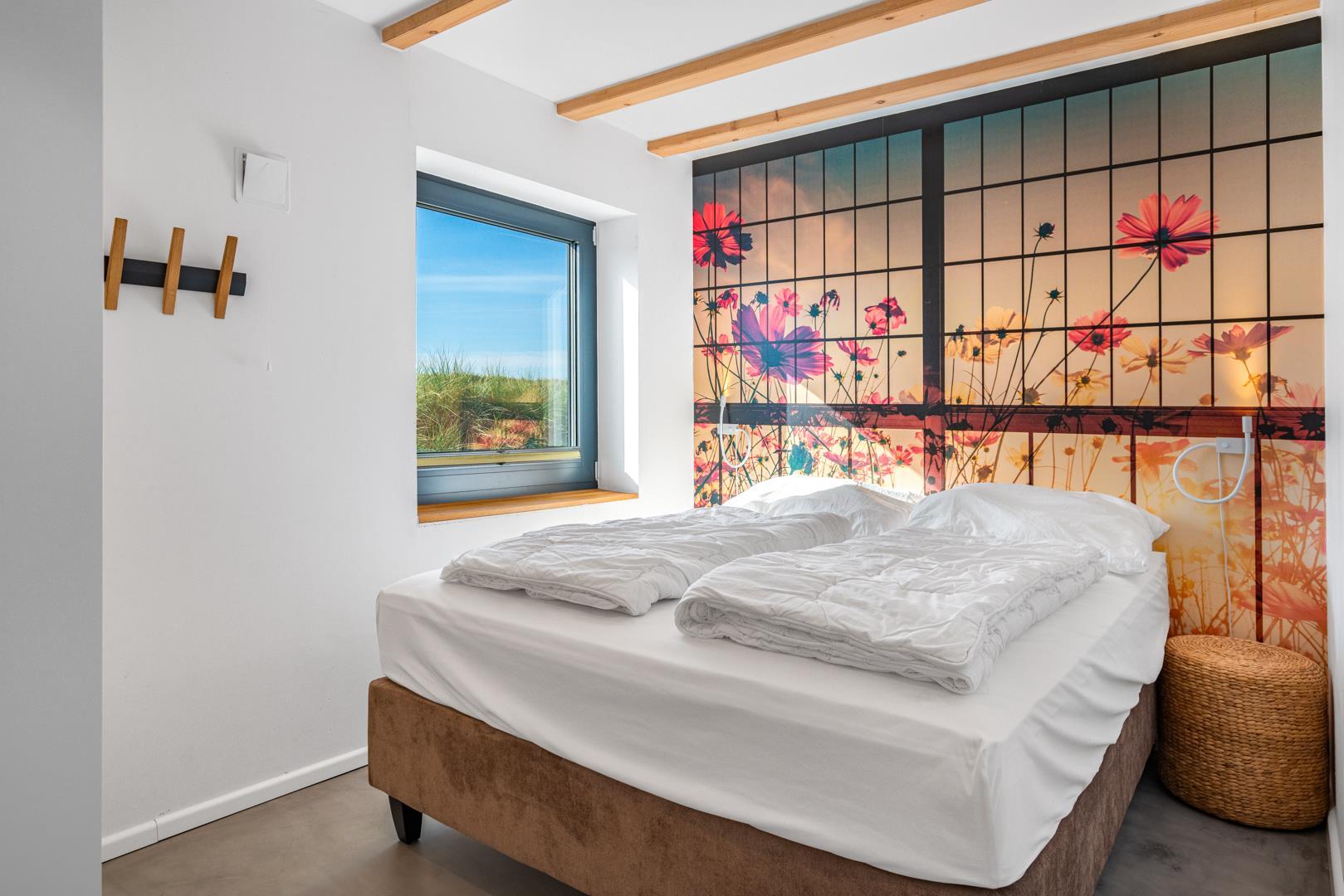 Huset har nu en anden etage, som byder på en fantastisk udsigt over det brede klitlandskab og aftenhimlen. Her finder du et andet soveværelse med en box madrasser, et lille yogarum, et lækkert badeværelse med finsk sauna med udsigt over havet og en infrarød sauna. Loungeområdet ovenpå med sofa og liggestol gør den afslappende ferie perfekt.