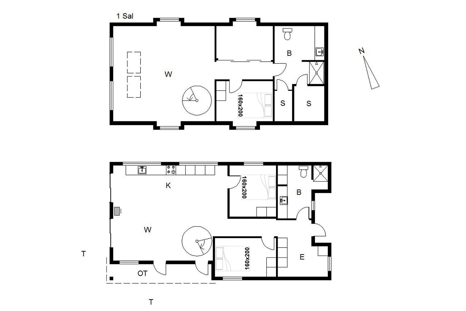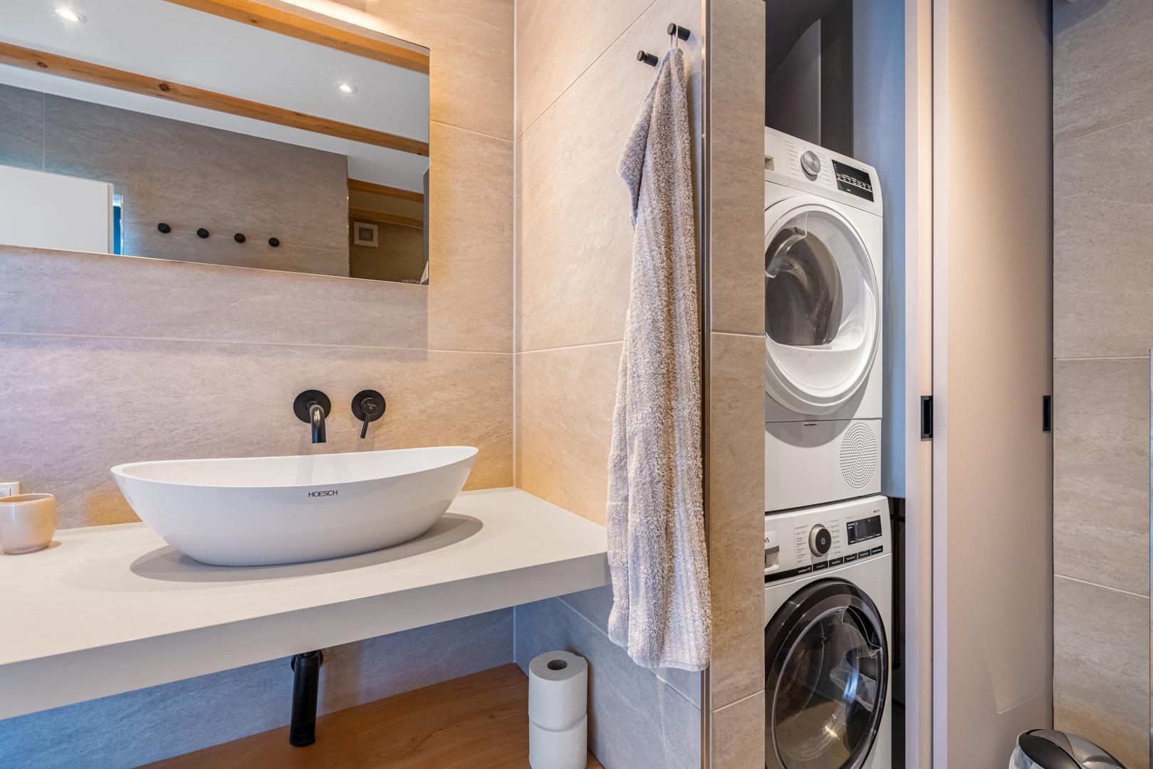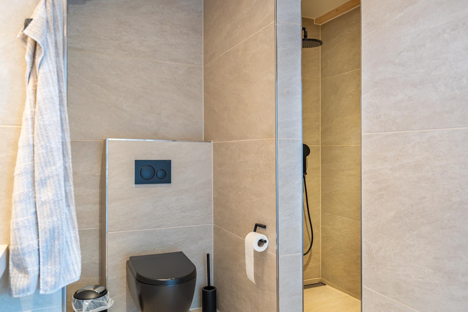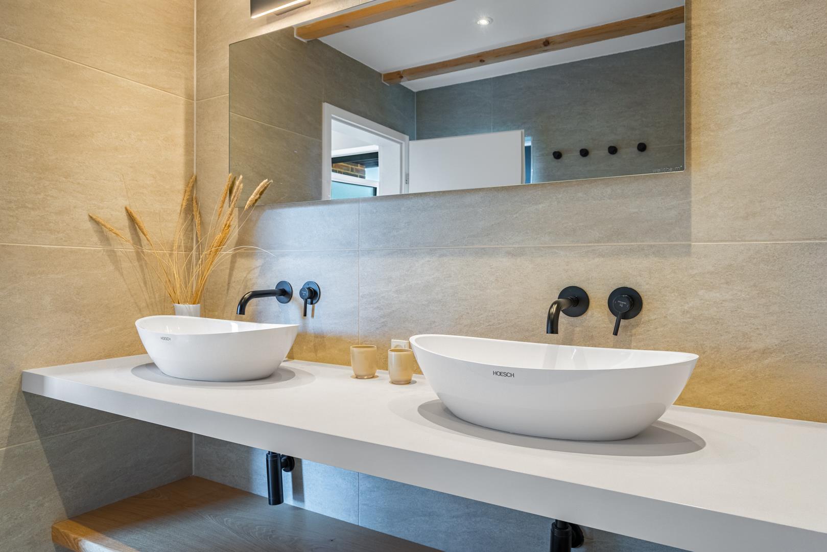 I stueetagen er der 2 soveværelser med komfortable box madrasser og et moderne badeværelse med 2 håndvaske og bruser.