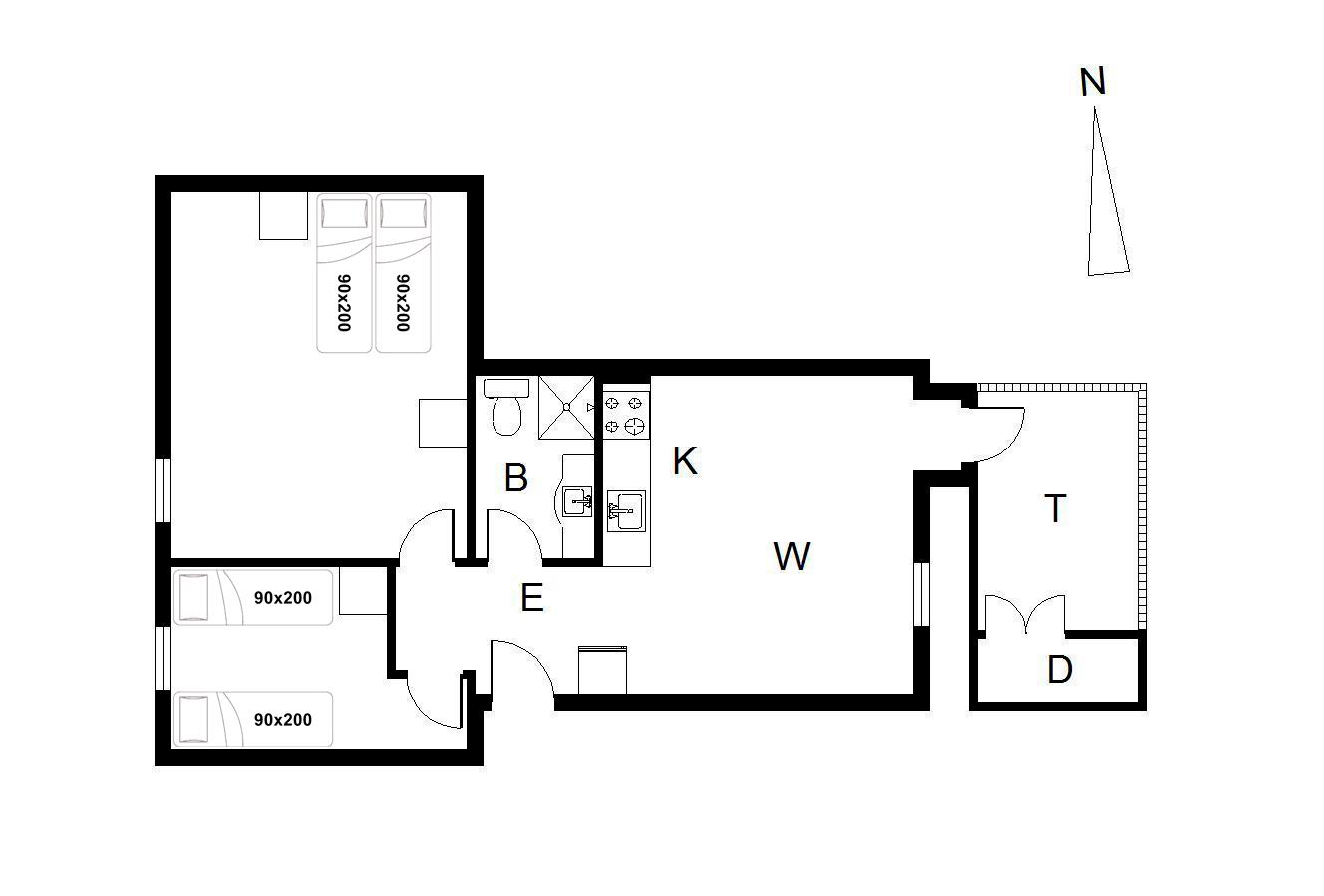 Sengestørrelse: 1 dobbeltseng med 2 madrasser 90 x 200 cm + 2 enkeltsenge 90 x 200 cm.