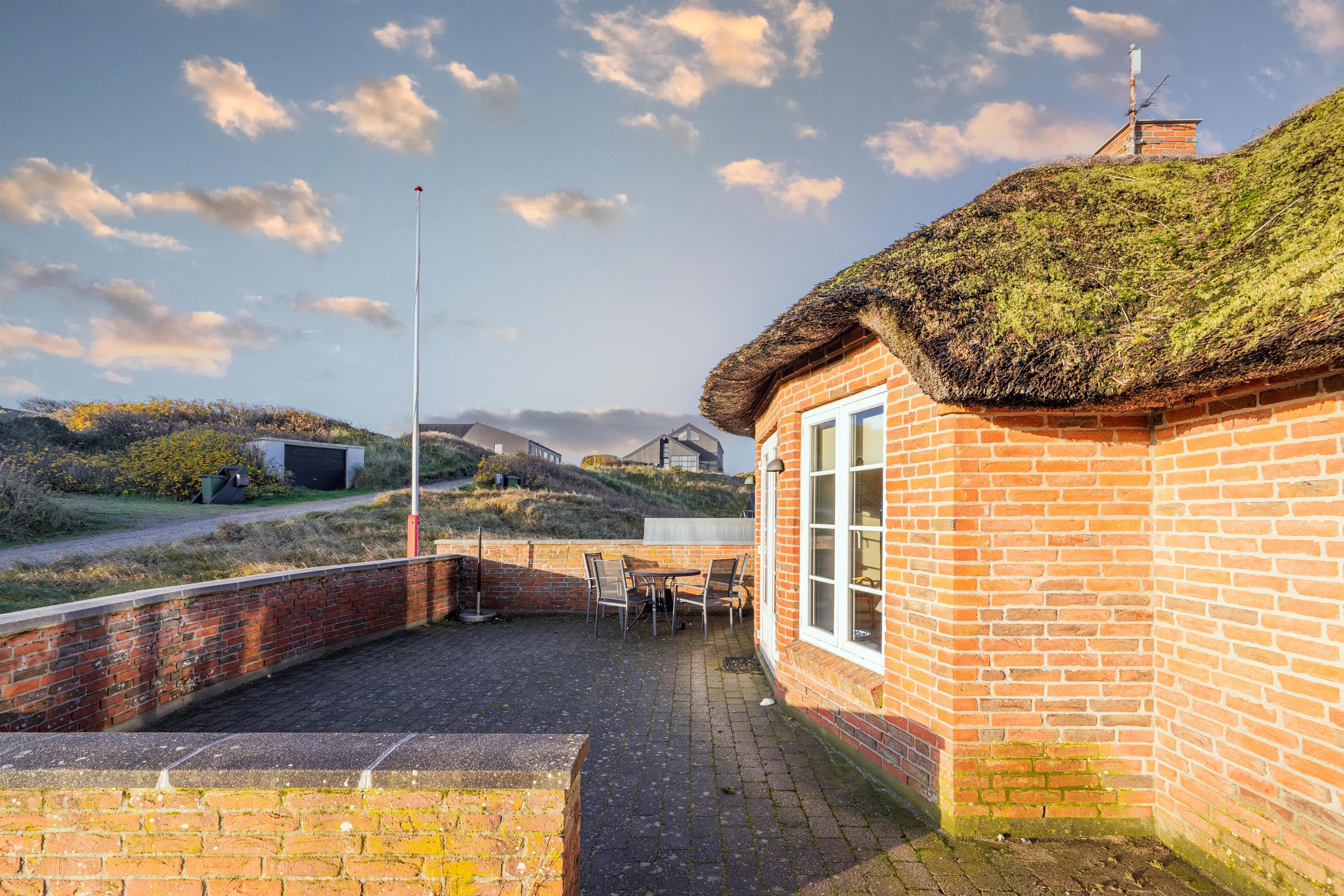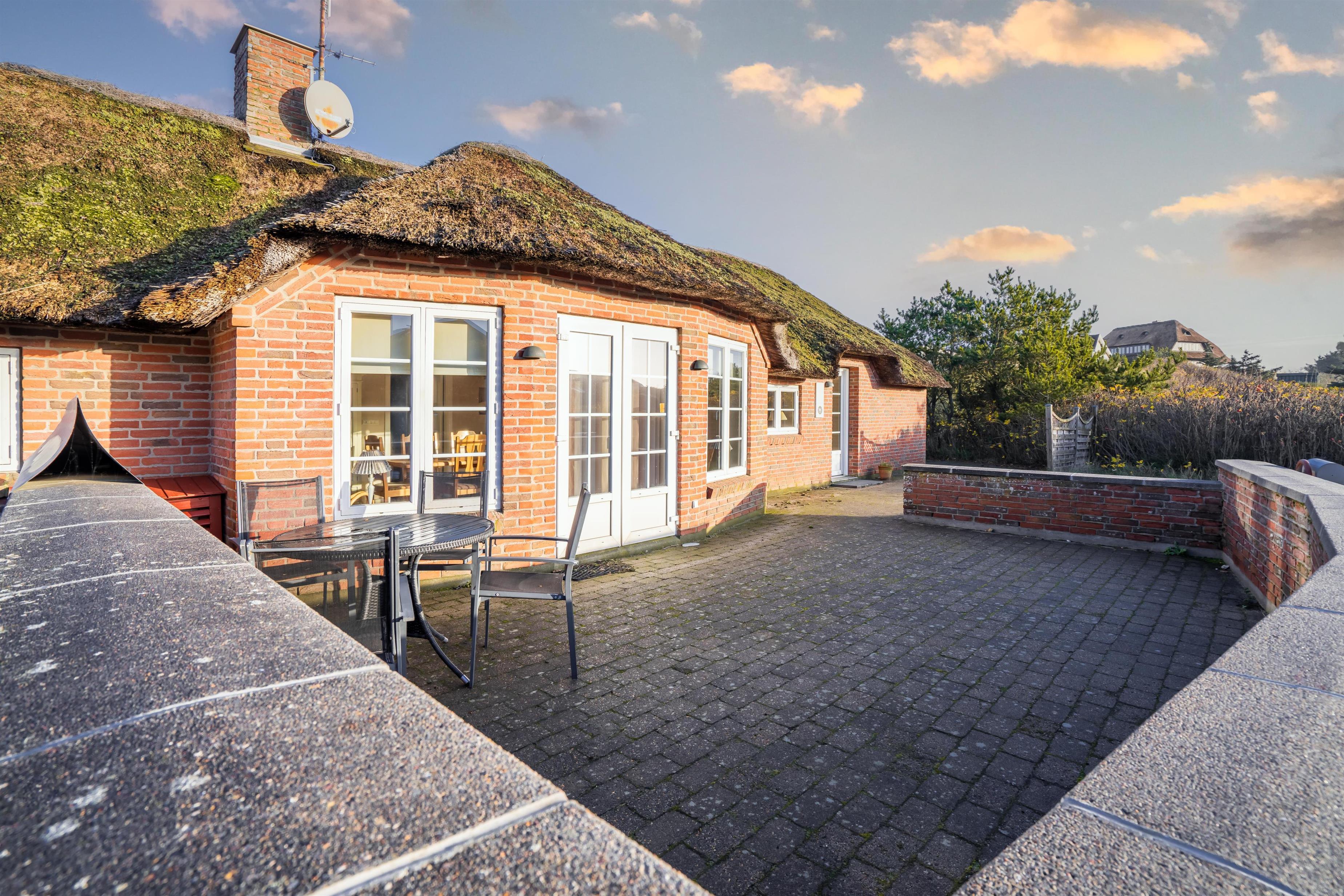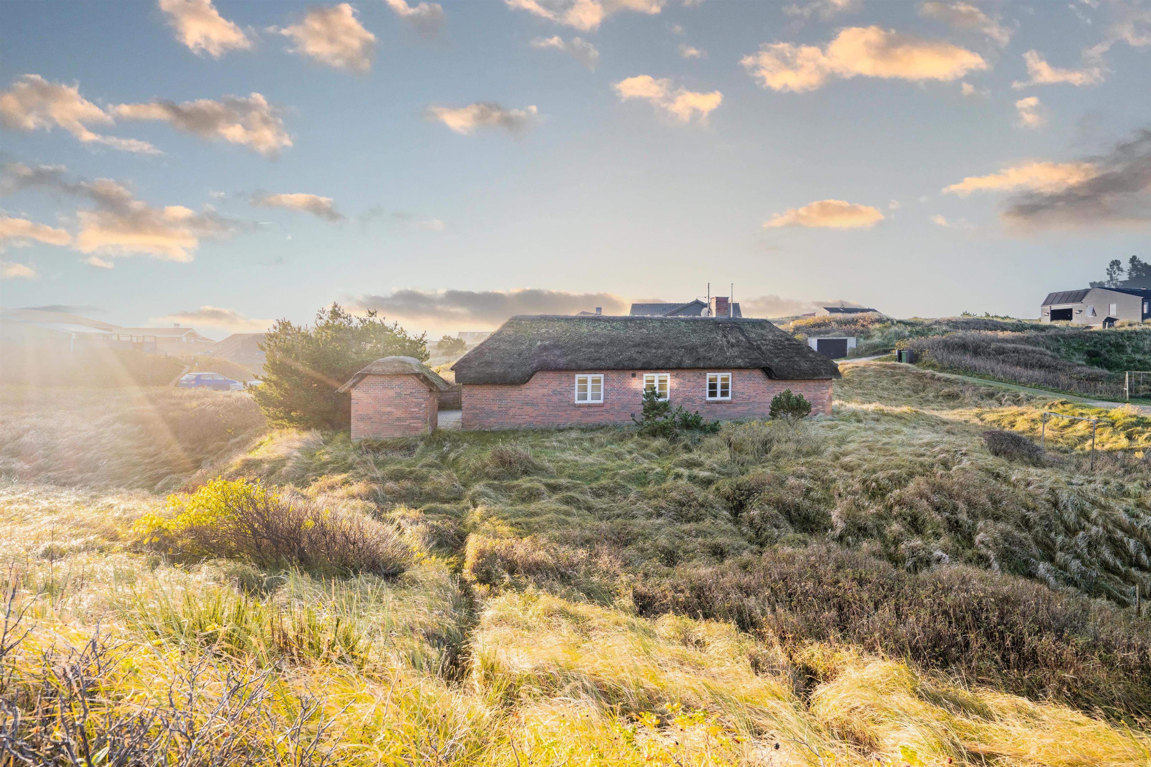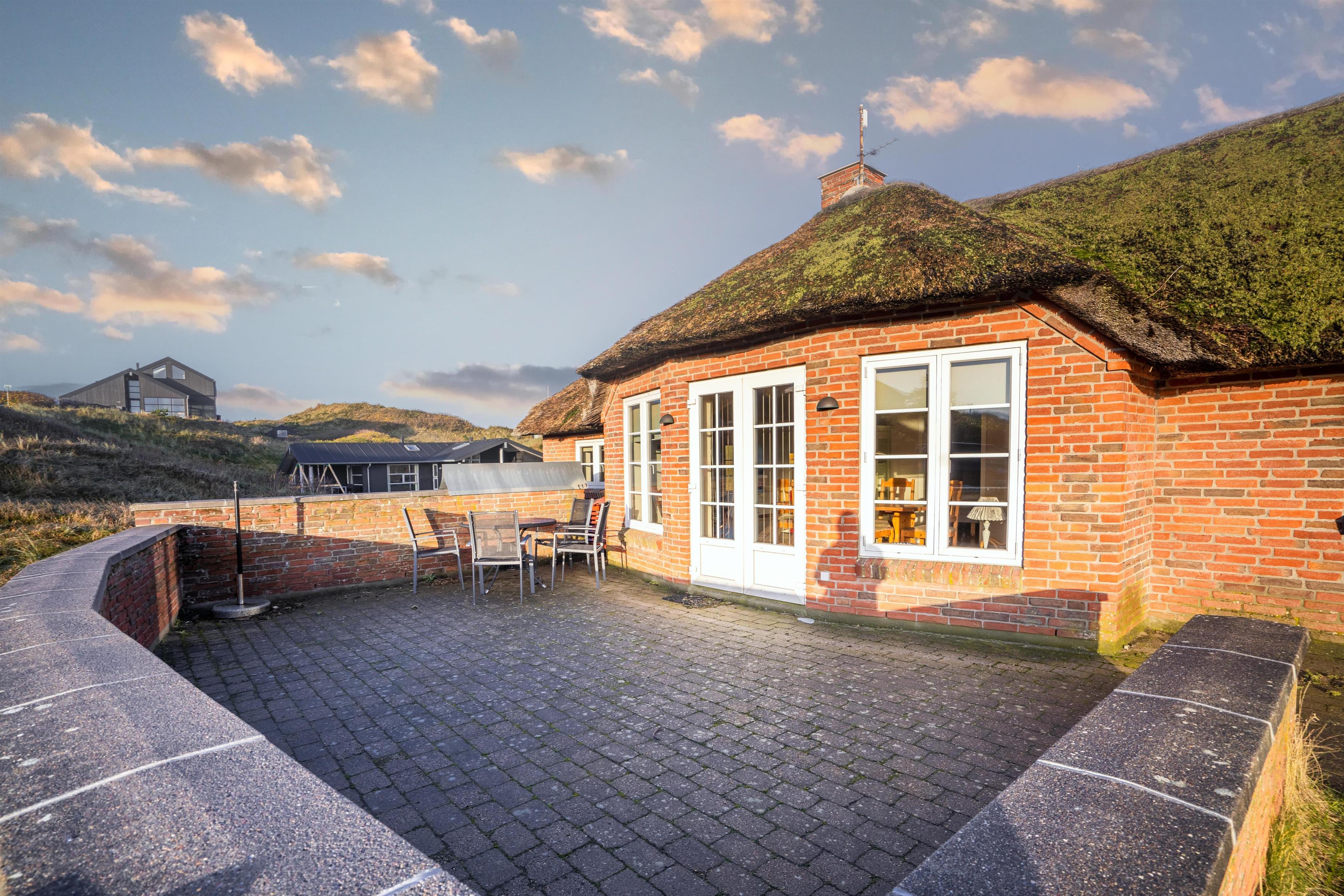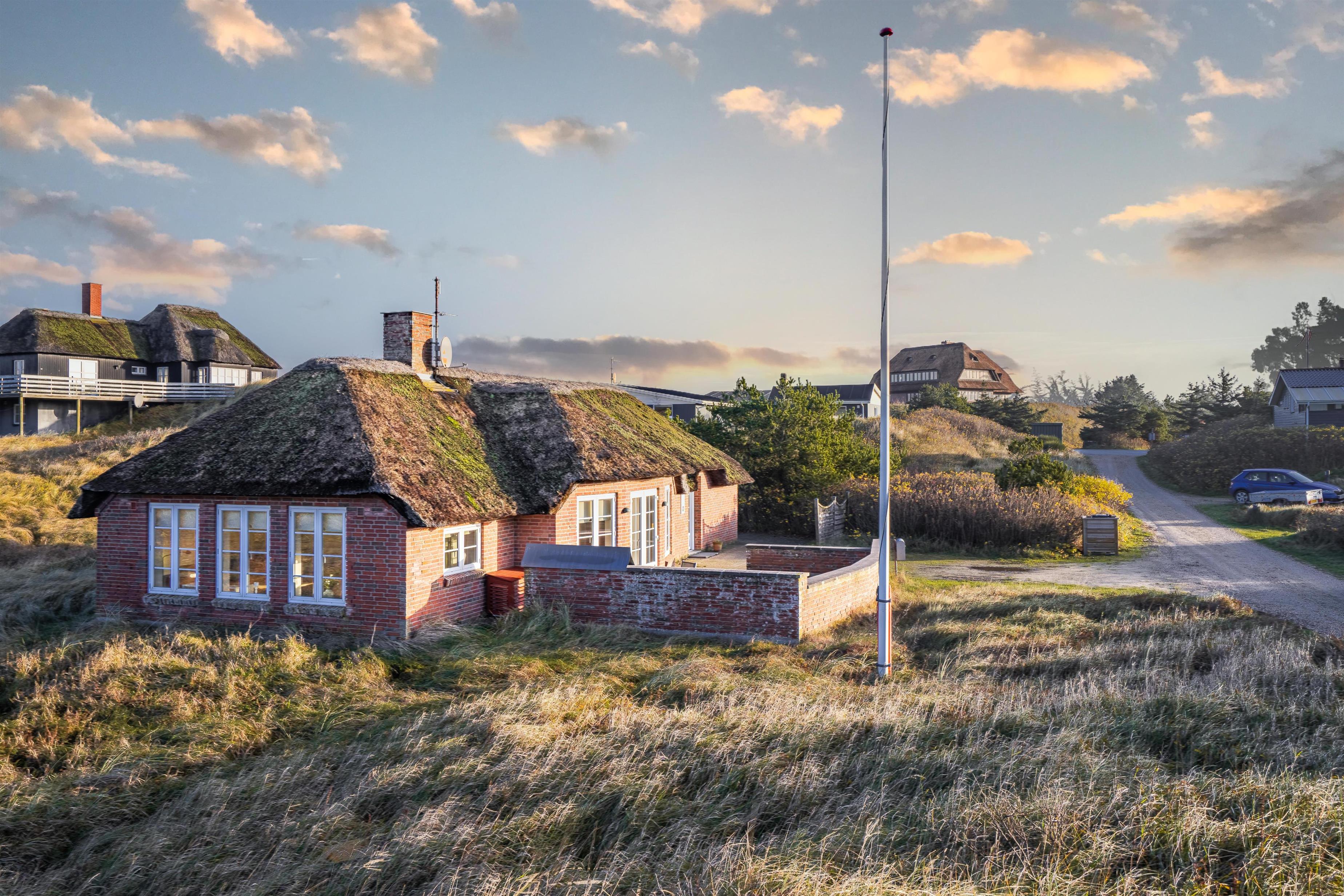 Meget velholdt og rummelig feriehus med stråtag beliggende på en dejlig kuperet naturgrund få minutters gang fra byen og Vesterhavet. Flot veludstyret køkken med spisekrog. 2 dejlige badeværelser med bruser og gulvvarme, det ene råder ligeledes over en sauna. Fra stuen er der udgang til dejlig ugeneret terrasse.