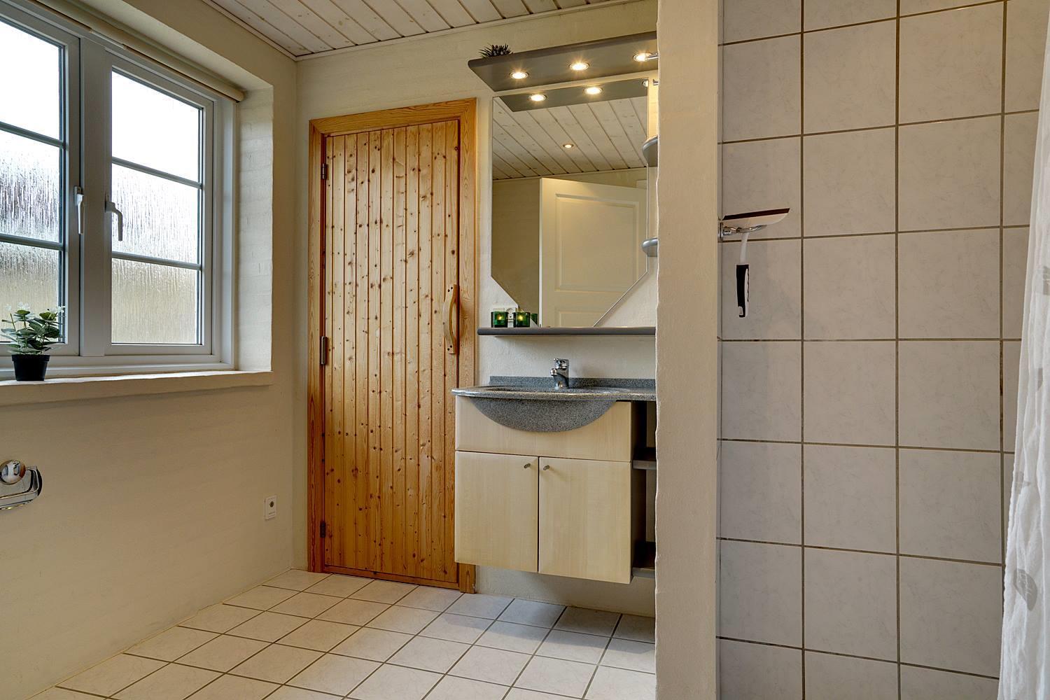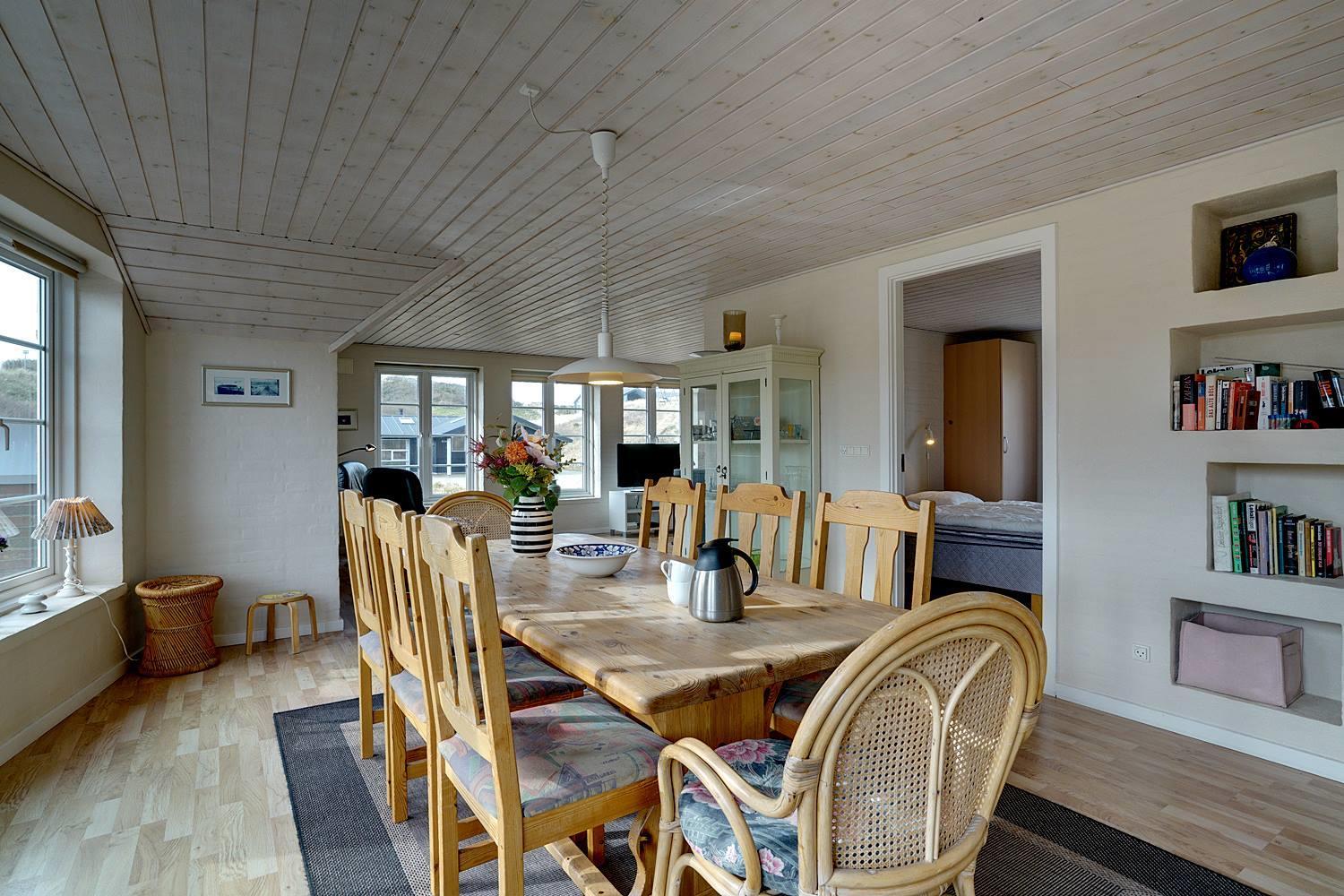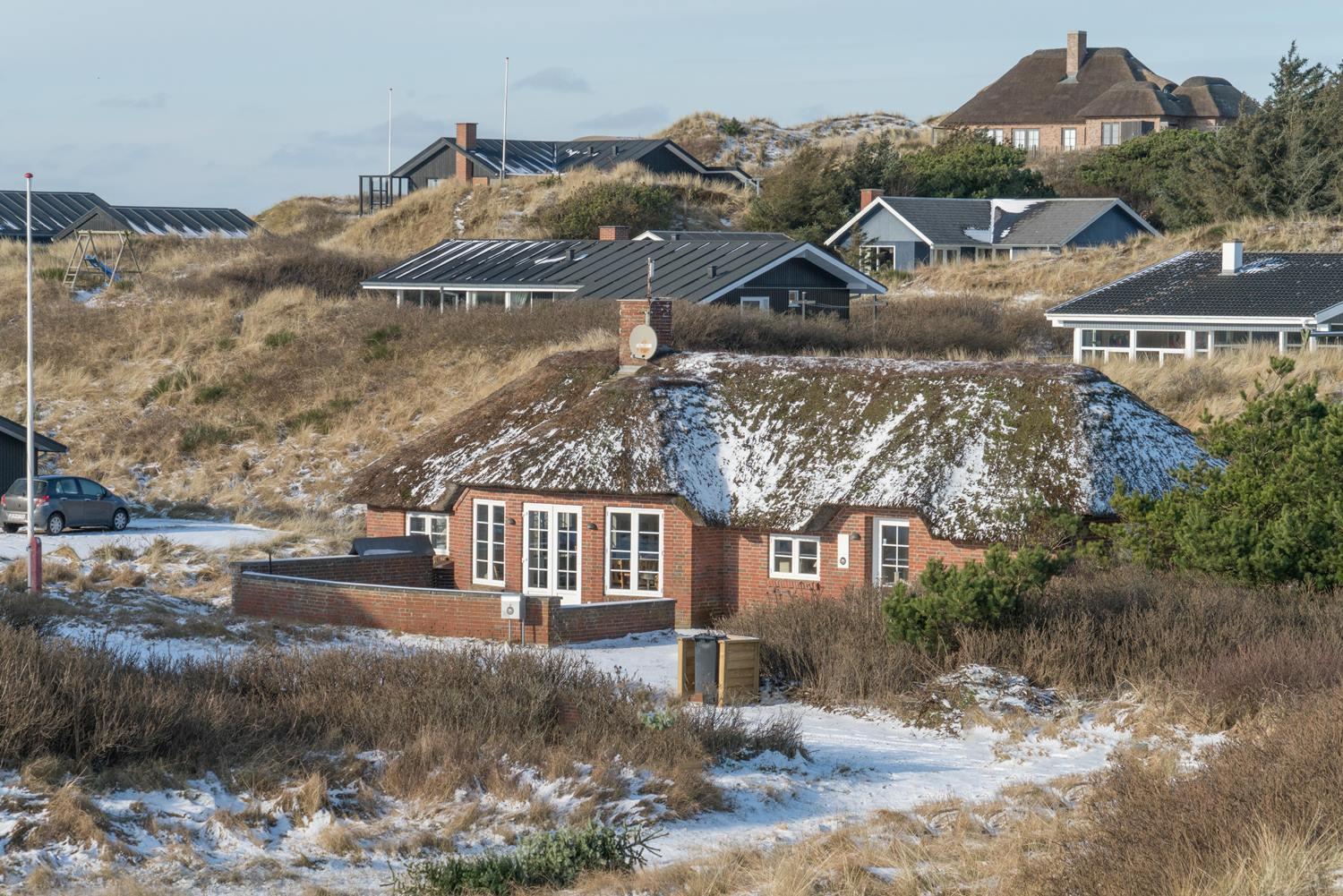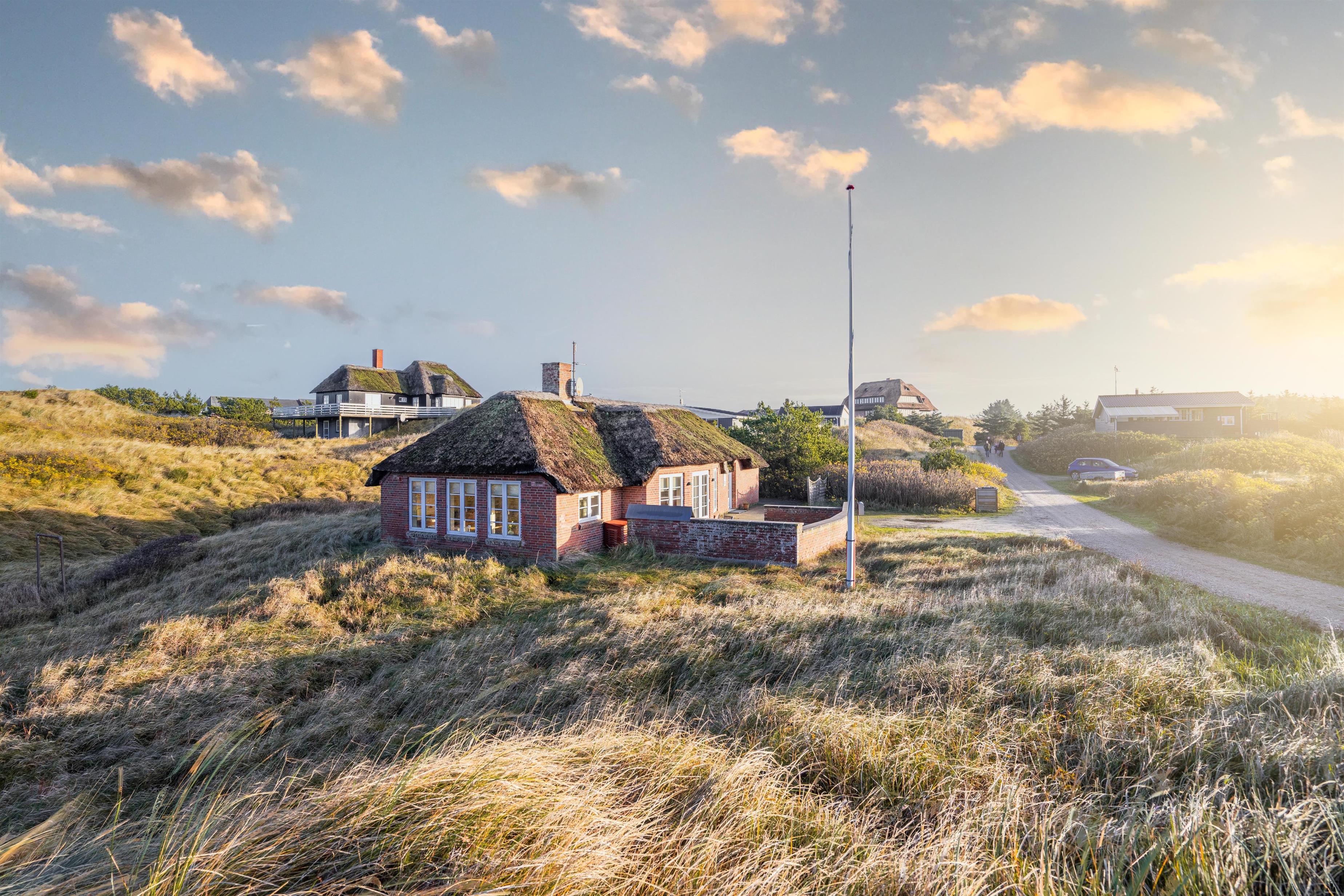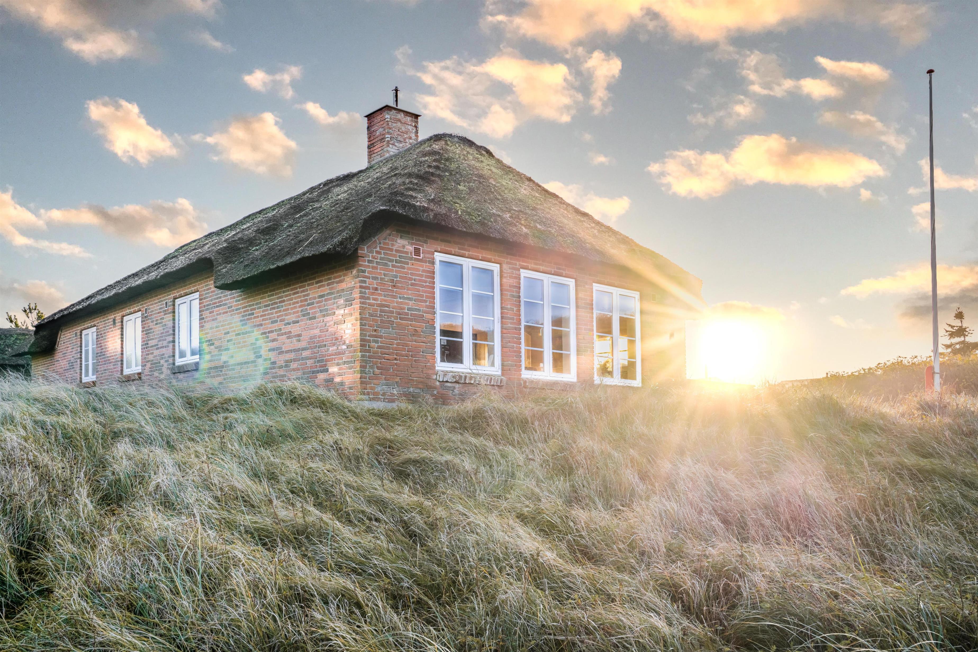 Meget velholdt og rummelig feriehus med stråtag beliggende på en dejlig kuperet naturgrund få minutters gang fra byen og Vesterhavet. Flot veludstyret køkken med spisekrog. 2 dejlige badeværelser med bruser og gulvvarme, det ene råder ligeledes over en sauna. Fra stuen er der udgang til dejlig ugeneret terrasse.
