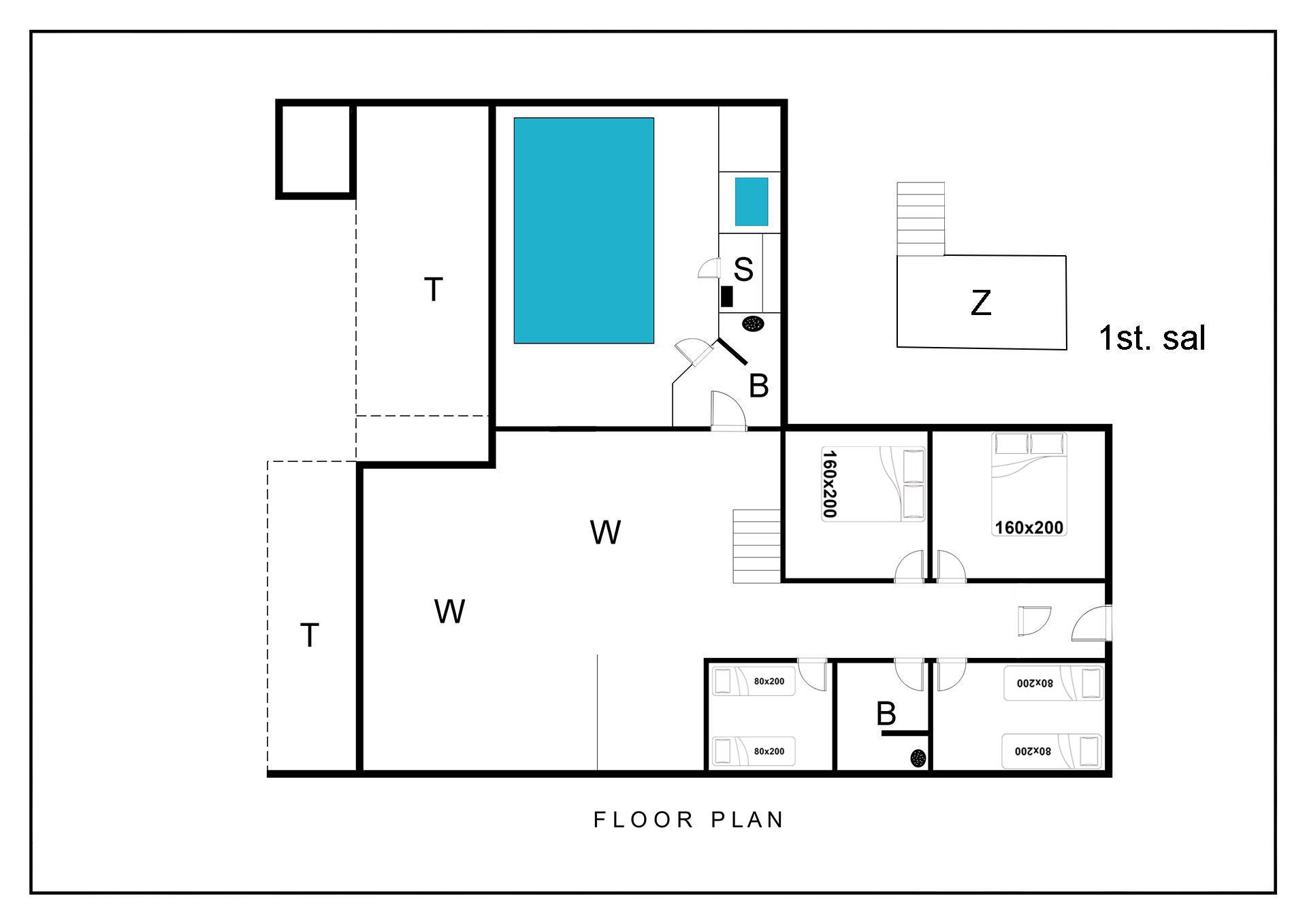 Sengestørrelse: 2 dobbeltsenge 160 x 200 cm + 4 enkeltsenge 80 x 200 cm