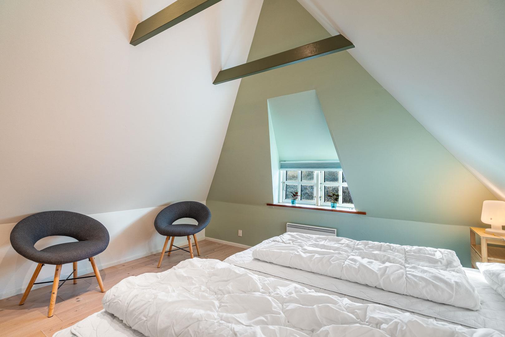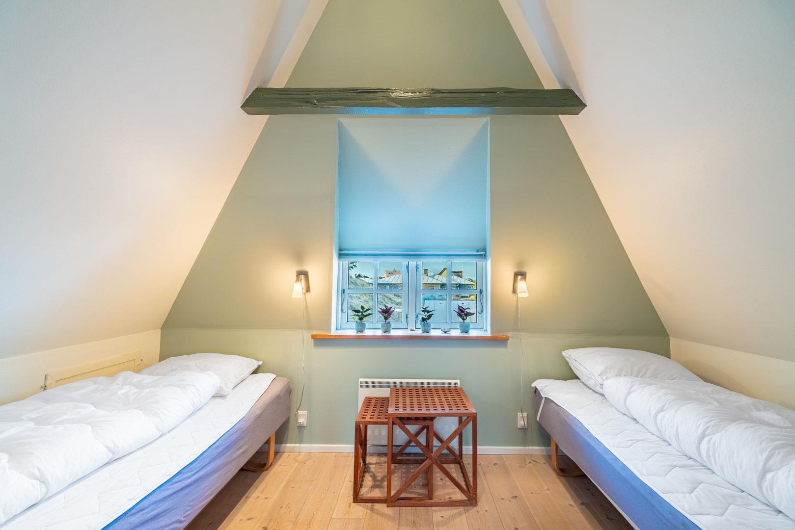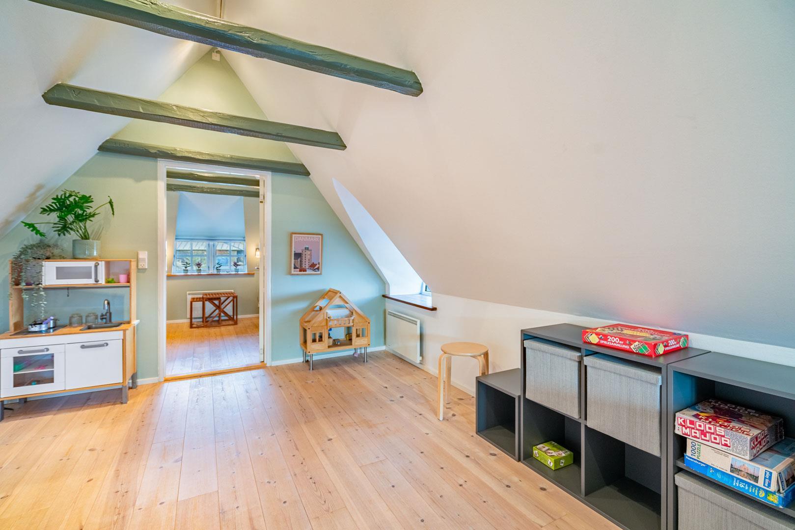 De resterende værelser ligger på 1. salen – Et værelse med dobbeltseng og et med to enkeltsenge. På 1. salen er der tænkt på børnefamilierne – her vil du opleve en lille legende oase med TV-stue, et legekøkken og et lille dukkehus. Perfekt sted til en masse leg i børnehøjde.
