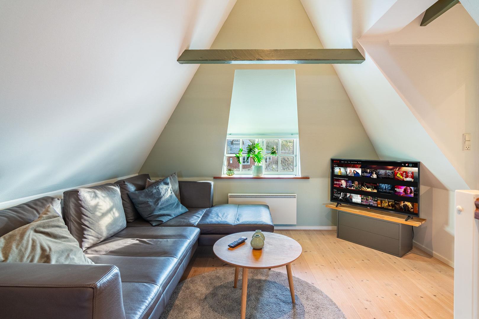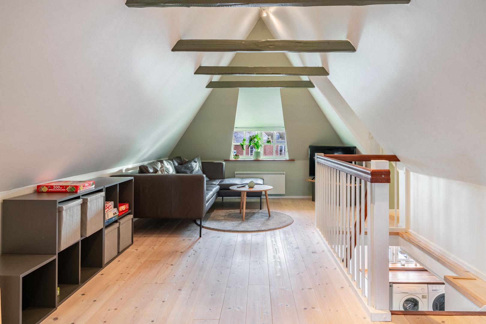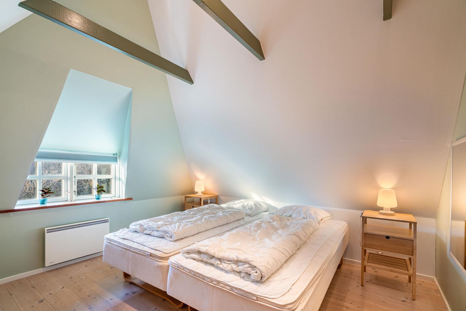 De resterende værelser ligger på 1. salen – Et værelse med dobbeltseng og et med to enkeltsenge. På 1. salen er der tænkt på børnefamilierne – her vil du opleve en lille legende oase med TV-stue, et legekøkken og et lille dukkehus. Perfekt sted til en masse leg i børnehøjde.