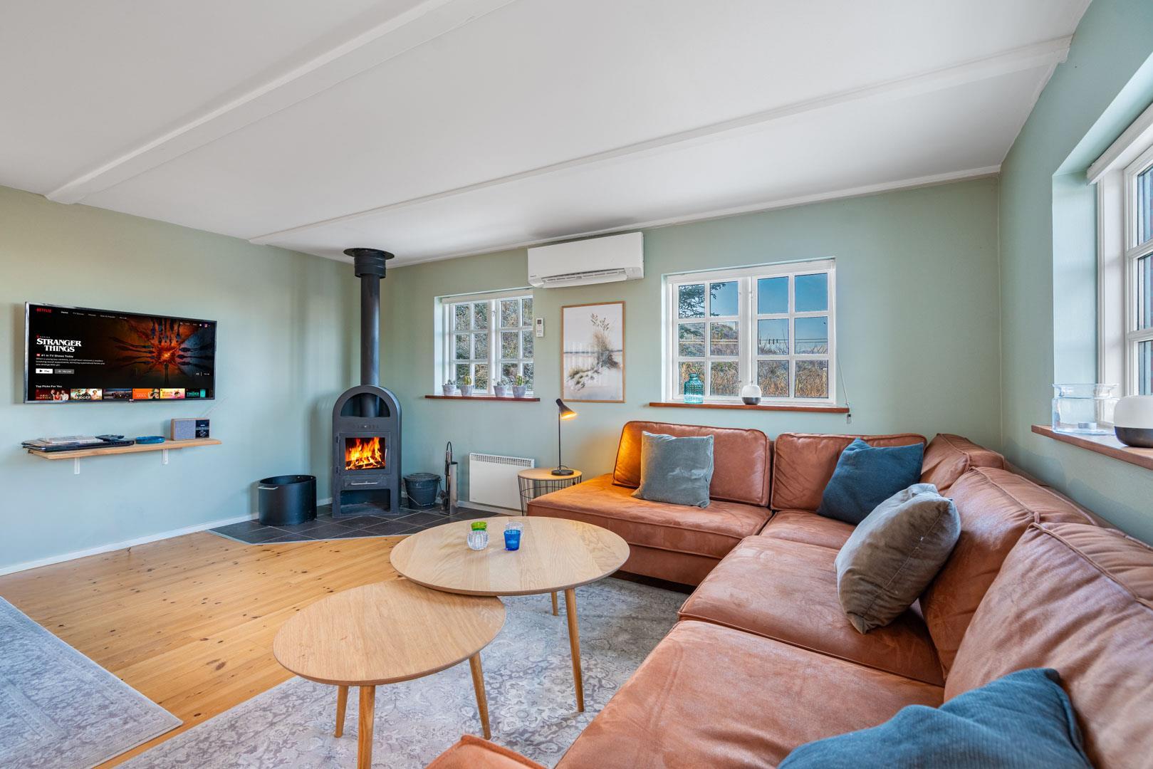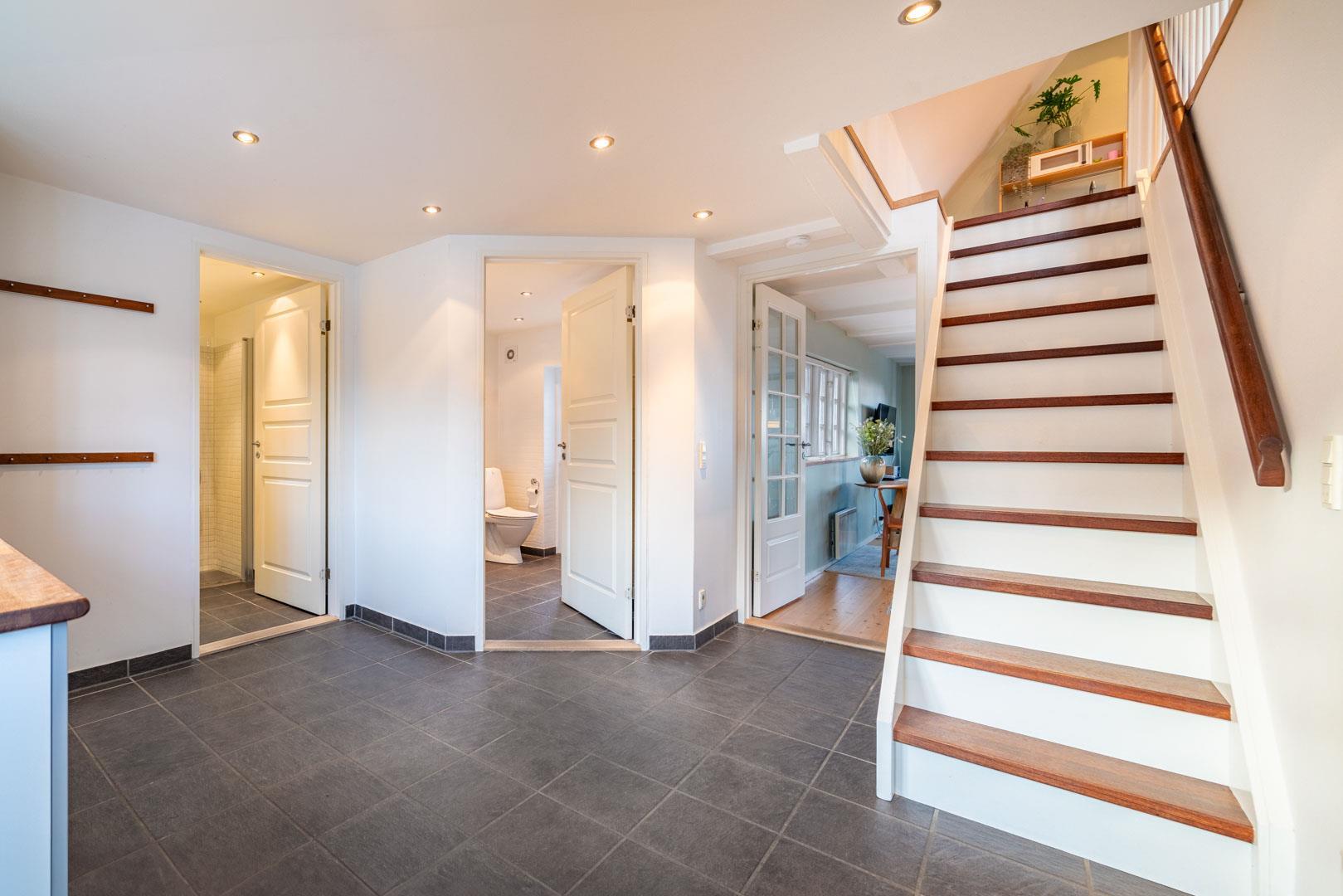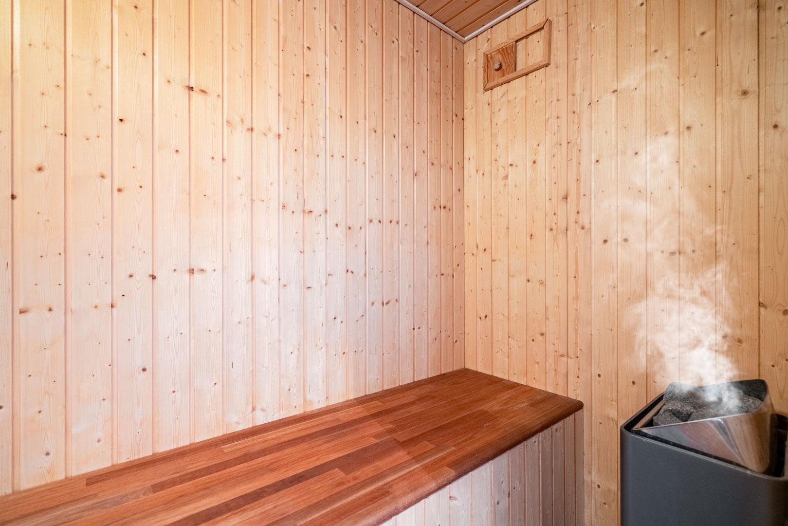 Fra stuen er der udgang til flere skønne terrasser. Brændeovnen er perfekt placeret og spreder derfor hygge og varme til hele rummet. I stueetagen finder du også begge badeværelser, hvoraf det ene er med sauna, samt et soveværelse med en dobbeltseng.