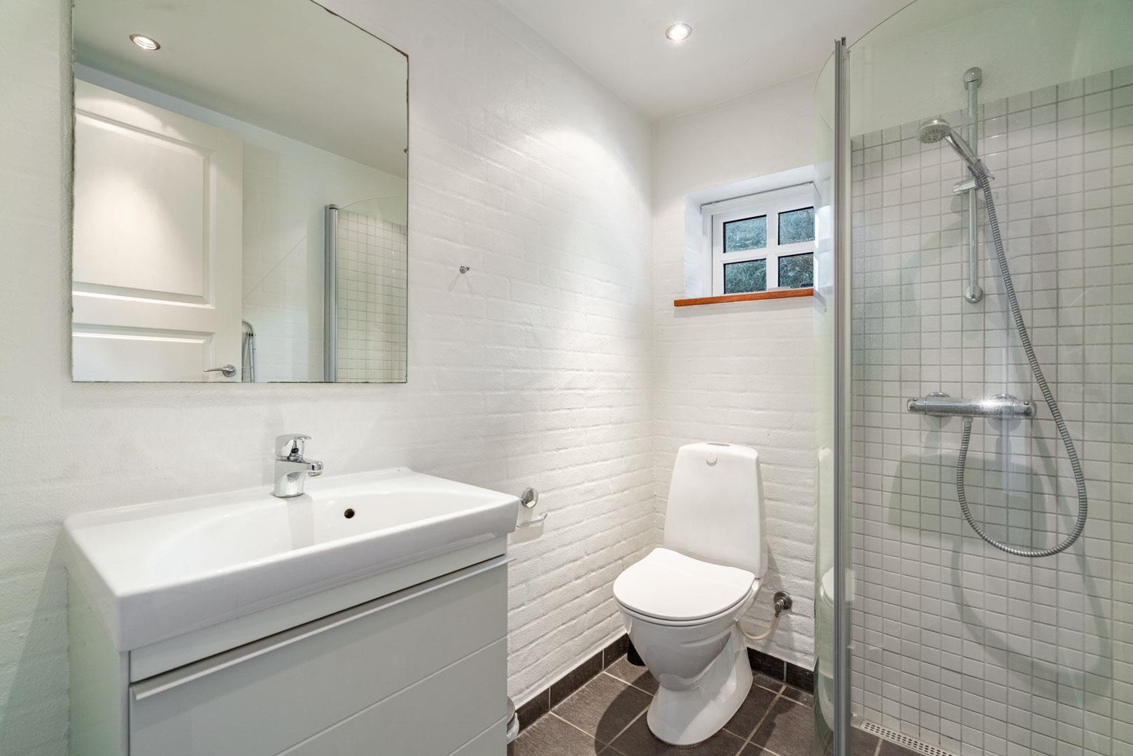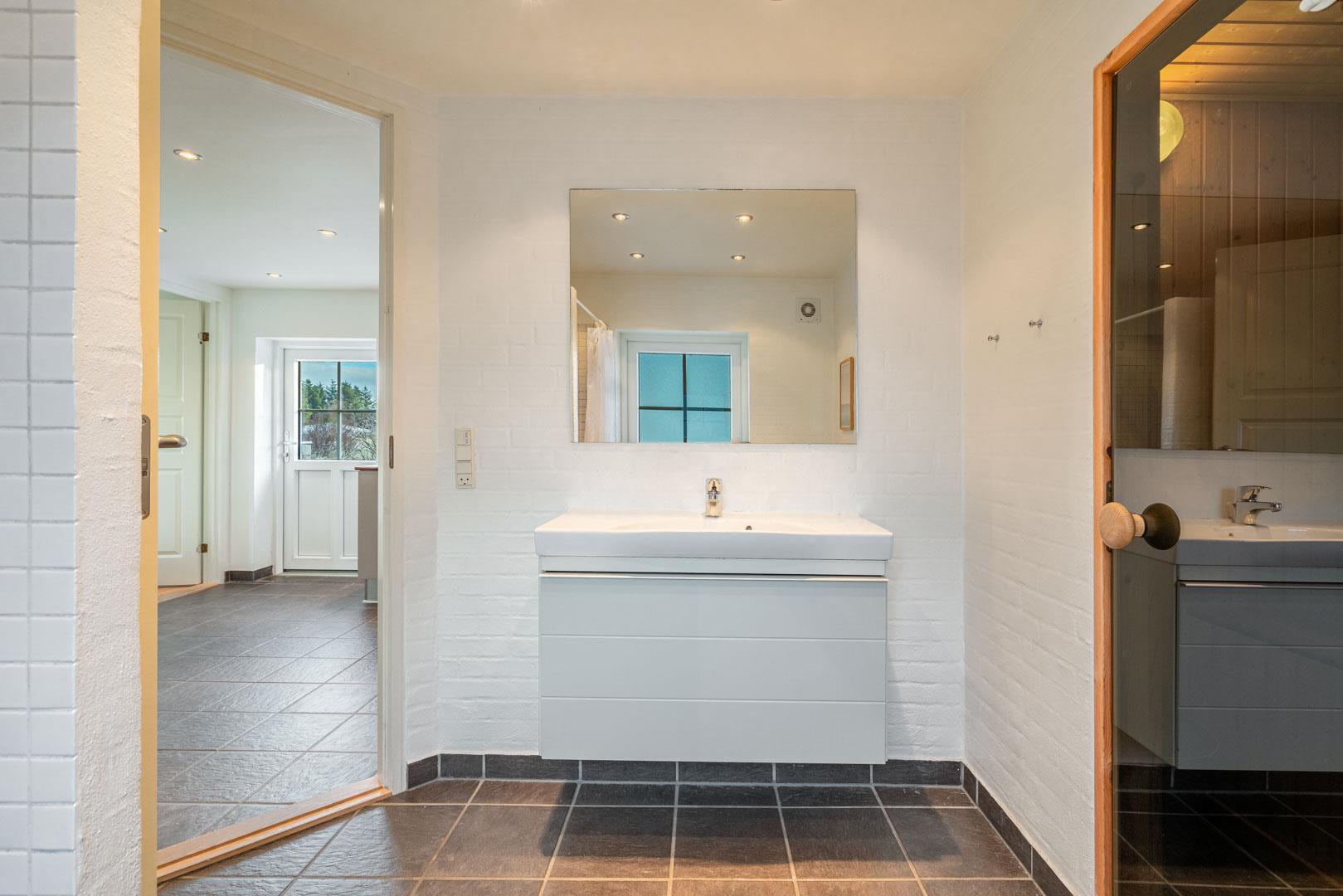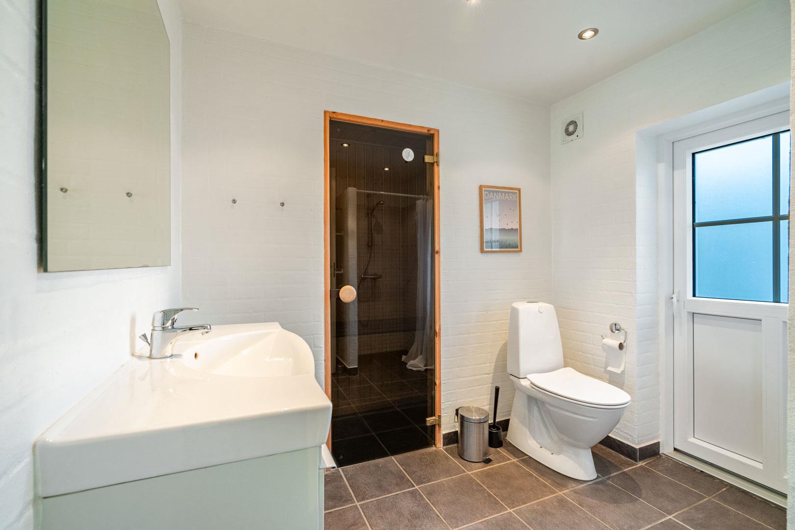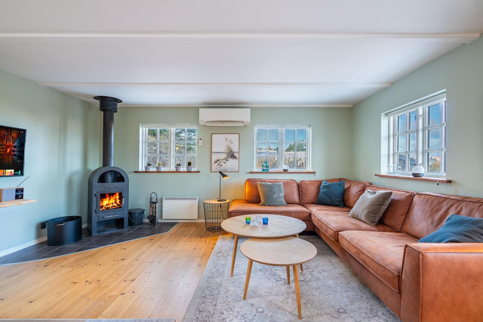 Fra stuen er der udgang til flere skønne terrasser. Brændeovnen er perfekt placeret og spreder derfor hygge og varme til hele rummet. I stueetagen finder du også begge badeværelser, hvoraf det ene er med sauna, samt et soveværelse med en dobbeltseng.