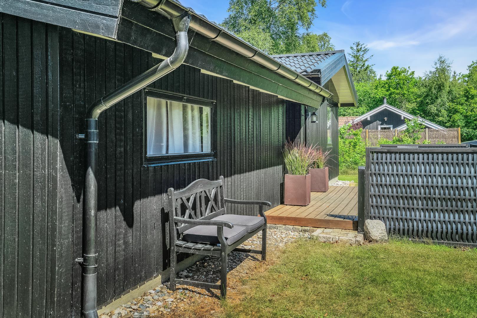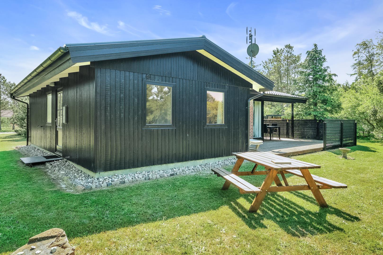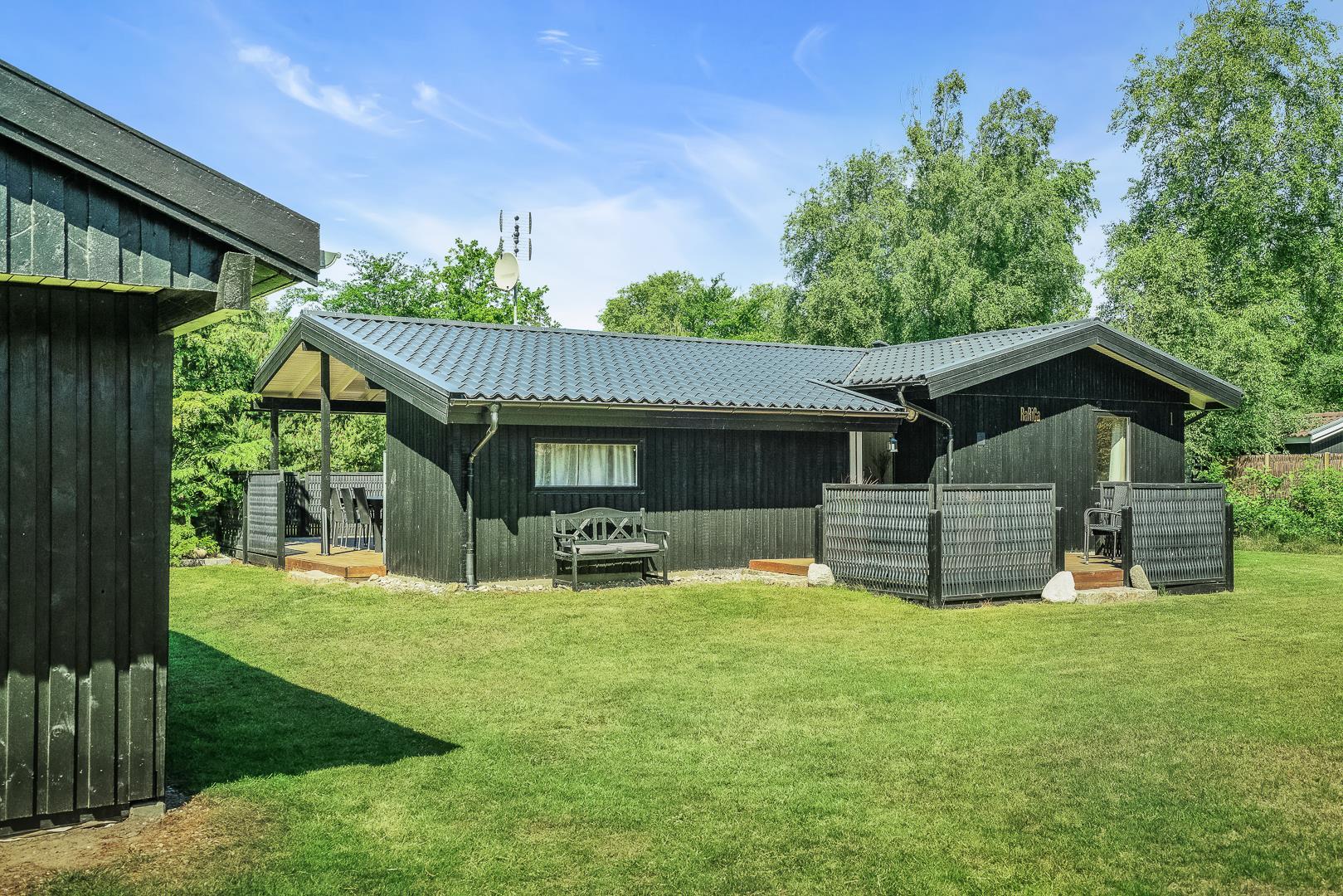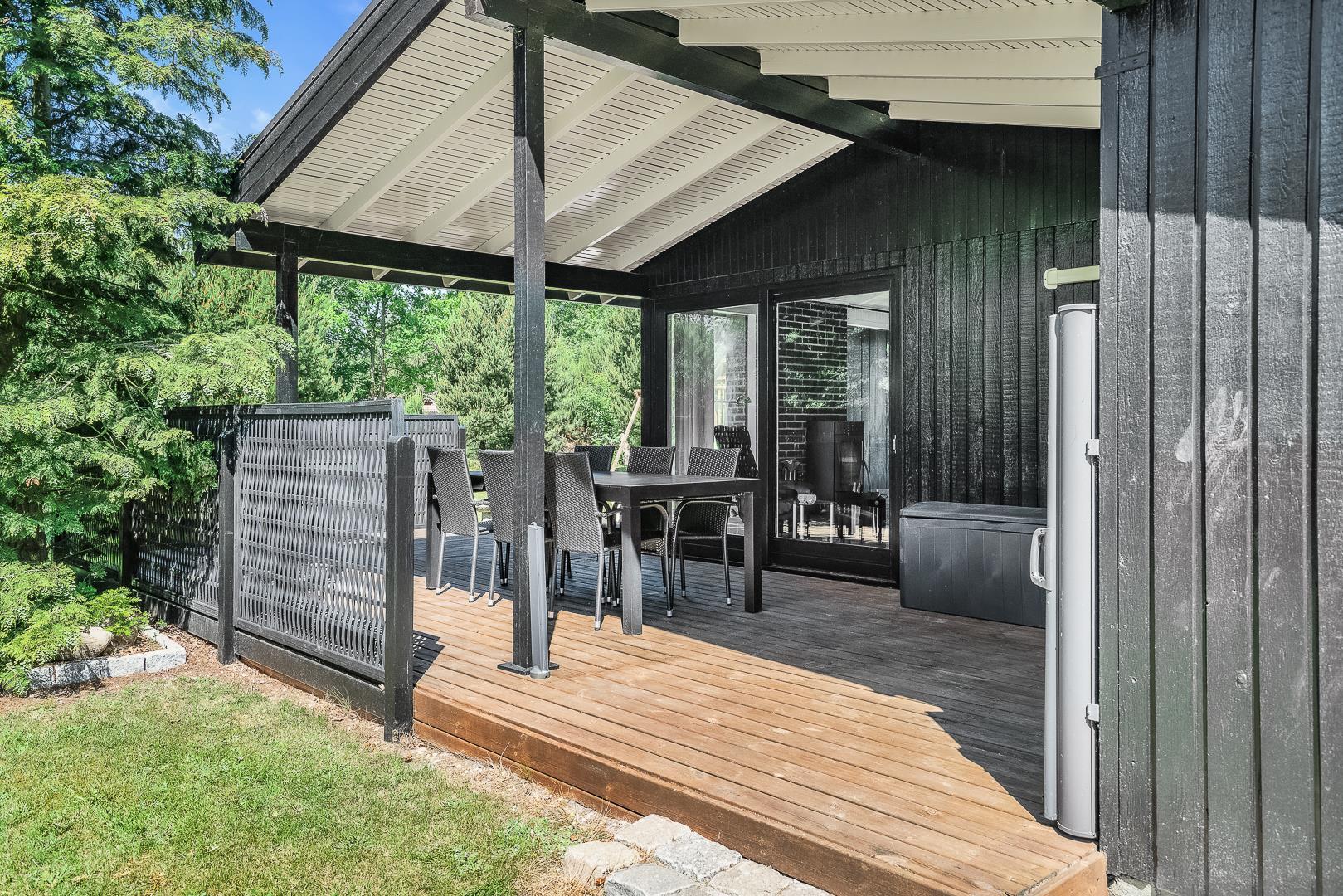 Hyggeligt feriehus i rolige omgivelser med sauna, brændeovn og delvis overdækket terrasse tæt på naturen.