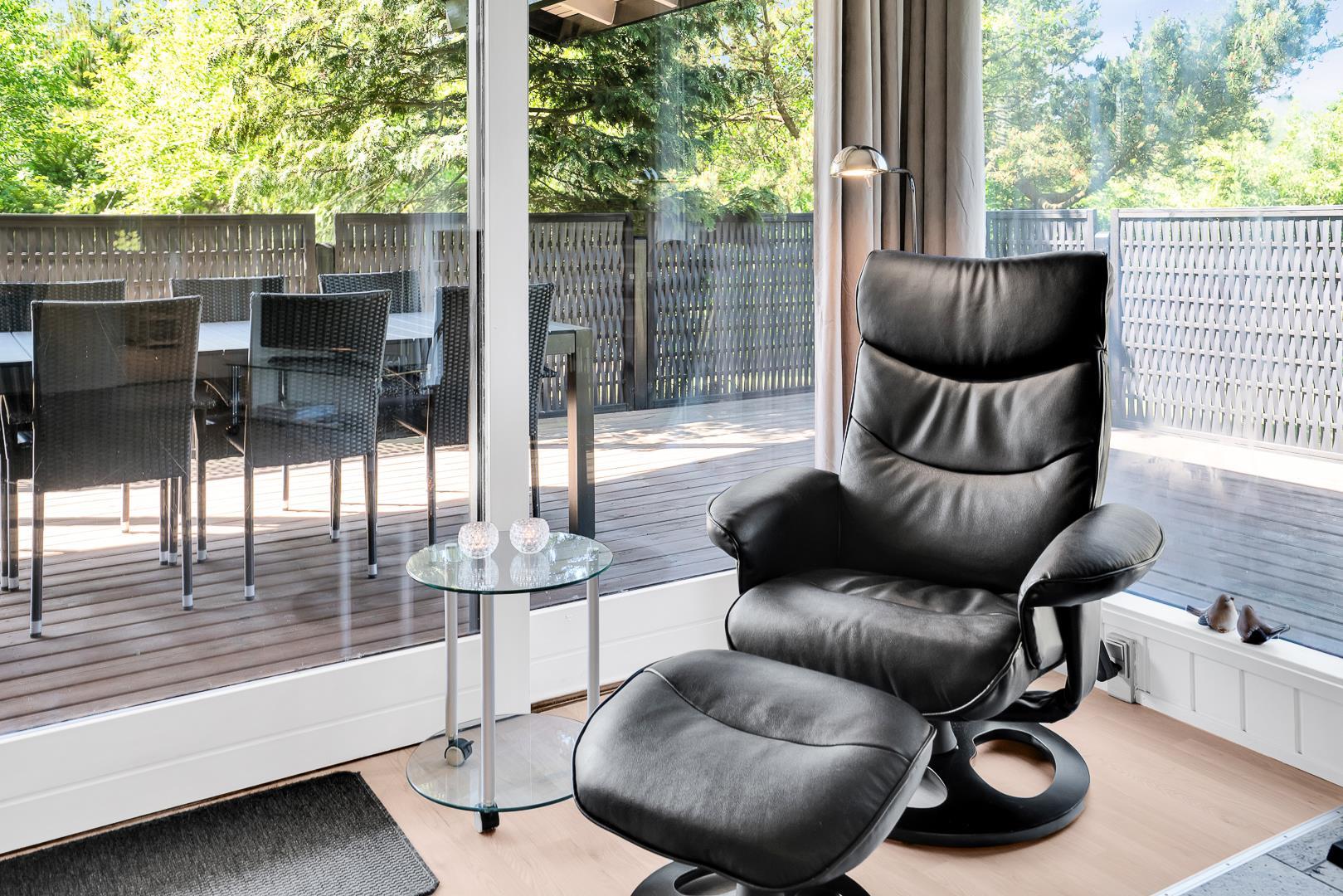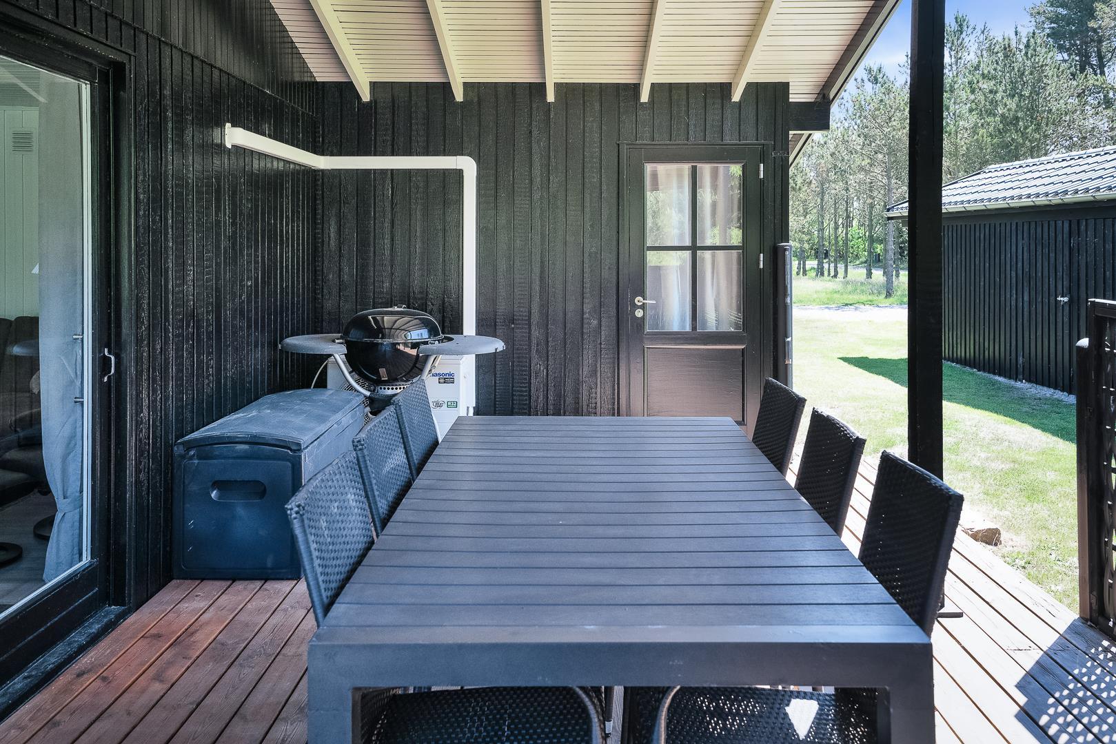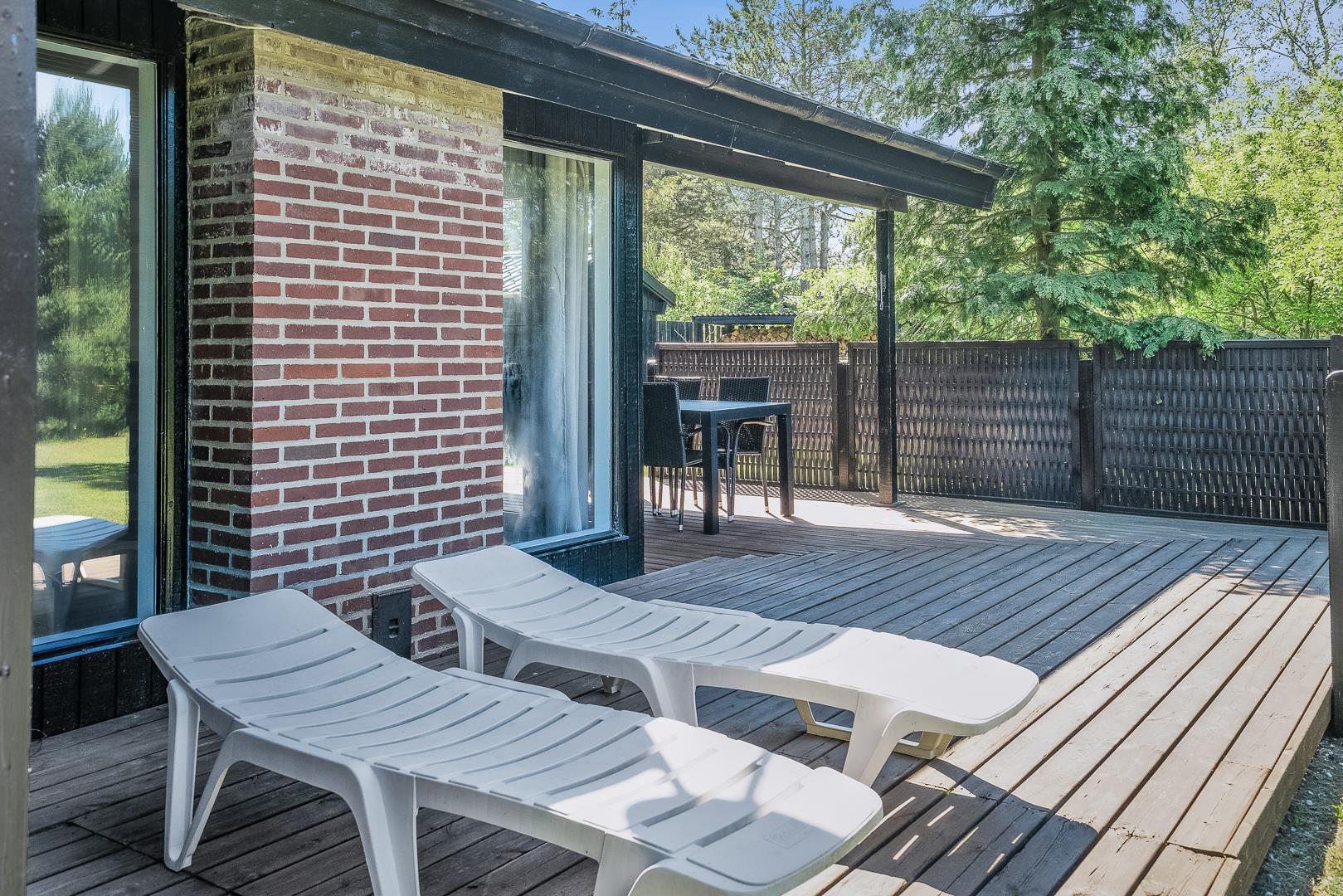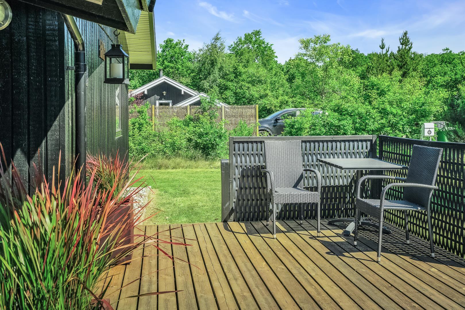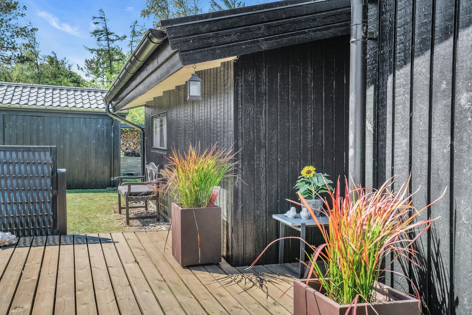 Hyggeligt feriehus i rolige omgivelser med sauna, brændeovn og delvis overdækket terrasse tæt på naturen.