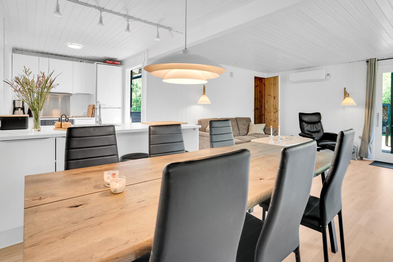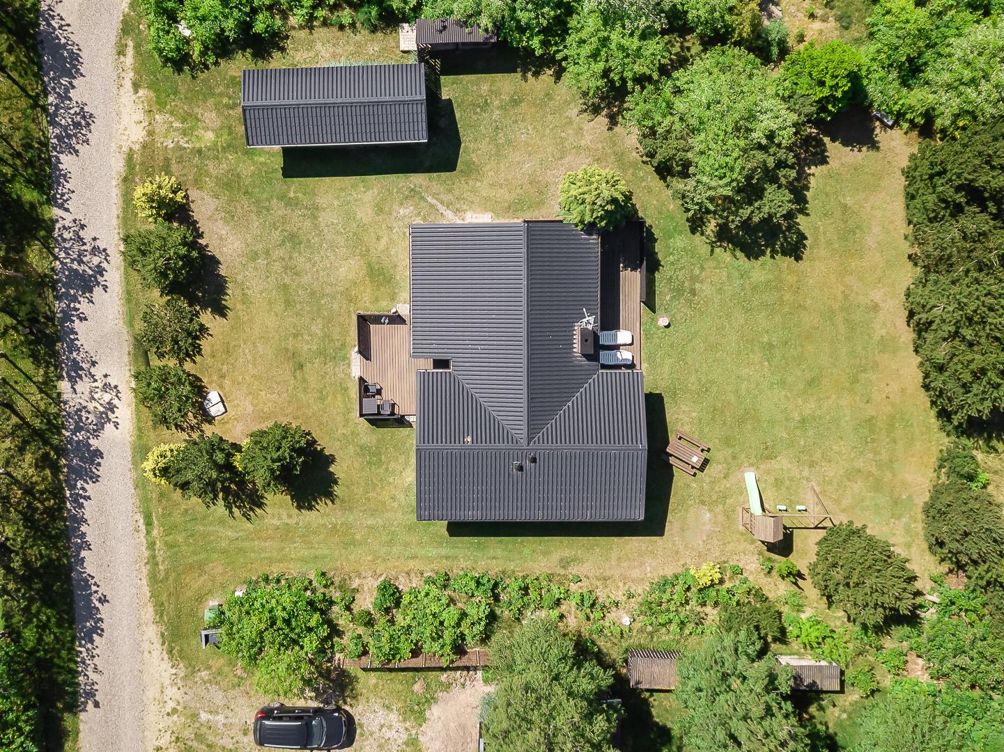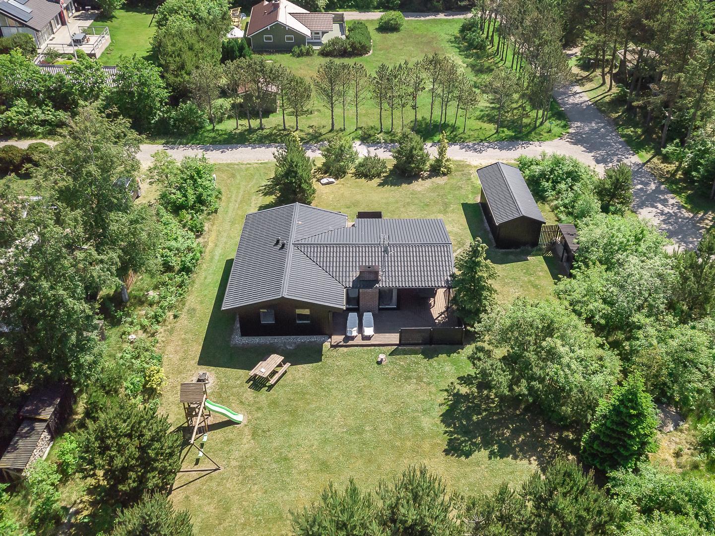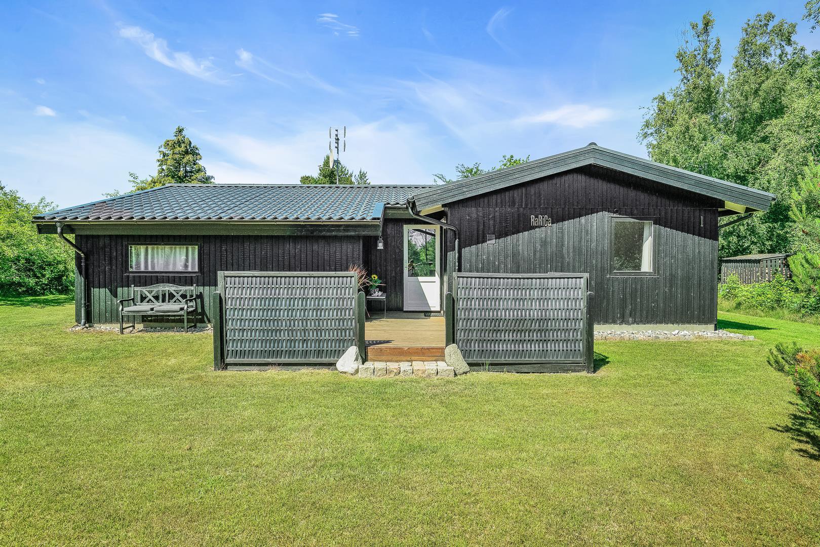 Midt i den skønne natur på en dejlig grund i rolige omgivelser omkranset af træer ligger dette dejlige og velholdte feriehus. Fra den lyse og pænt indrettede stue, som er kombineret med køkkenet, er der adgang til skøn ugeneret delvis overdækket træterrasse. Der er græsplæne omkring huset.