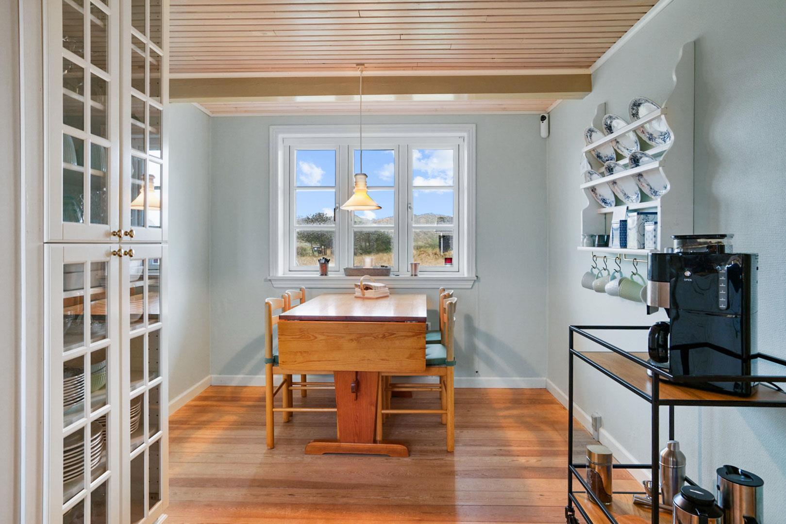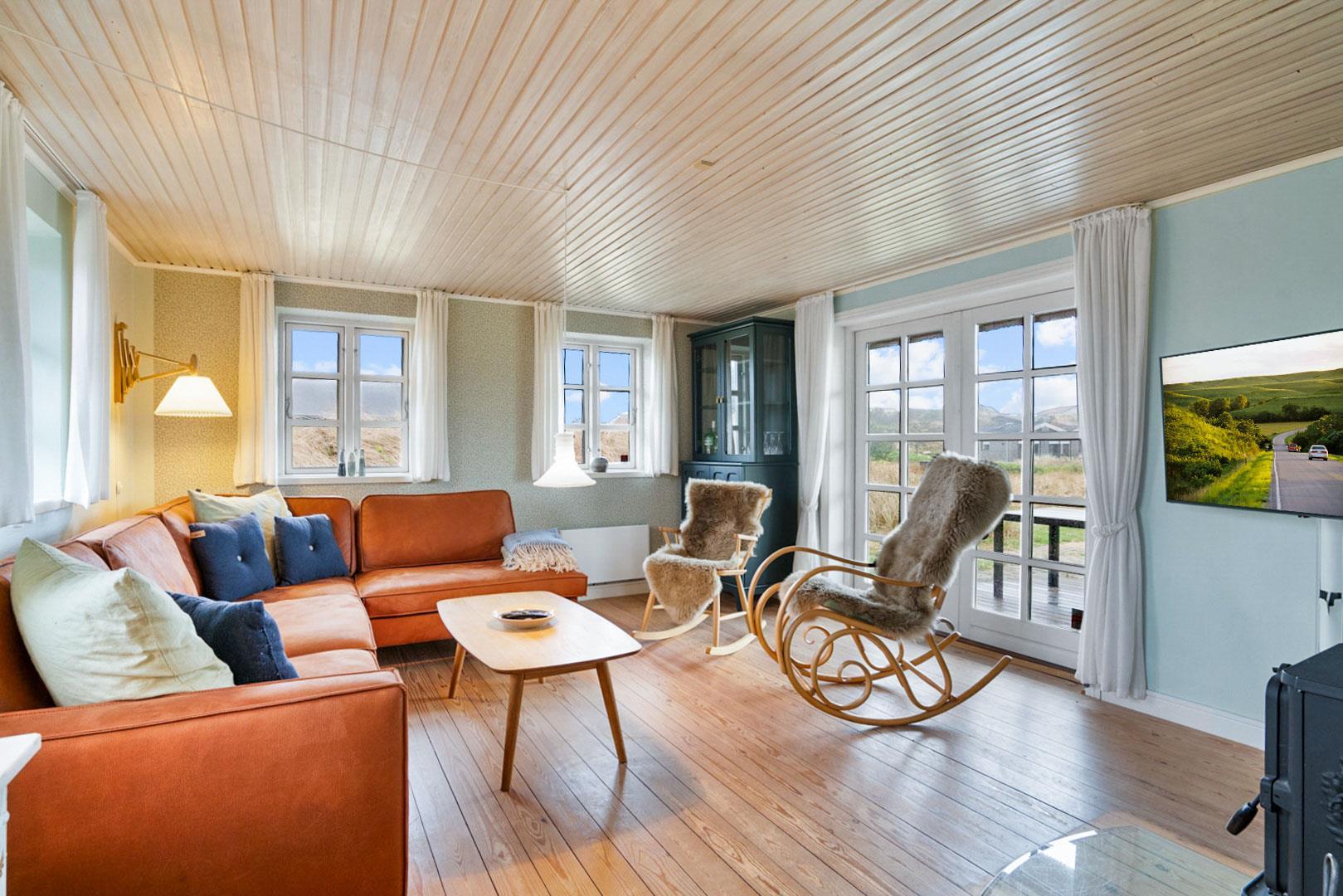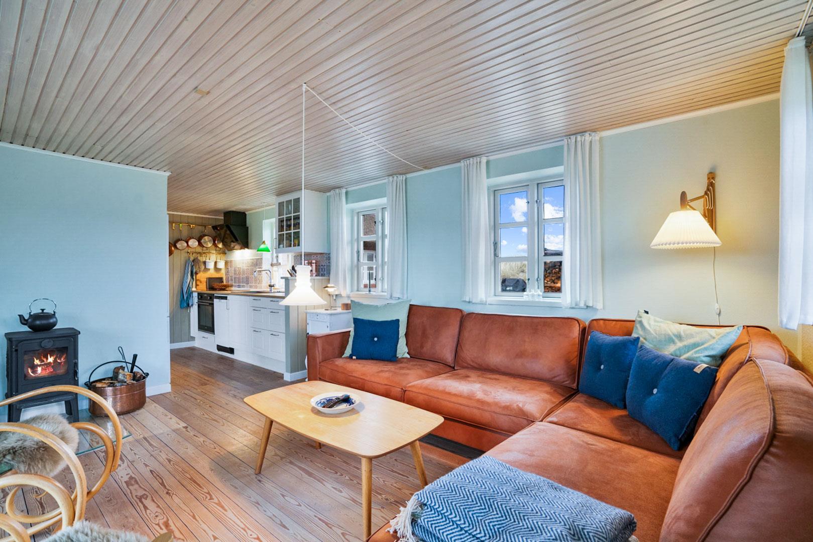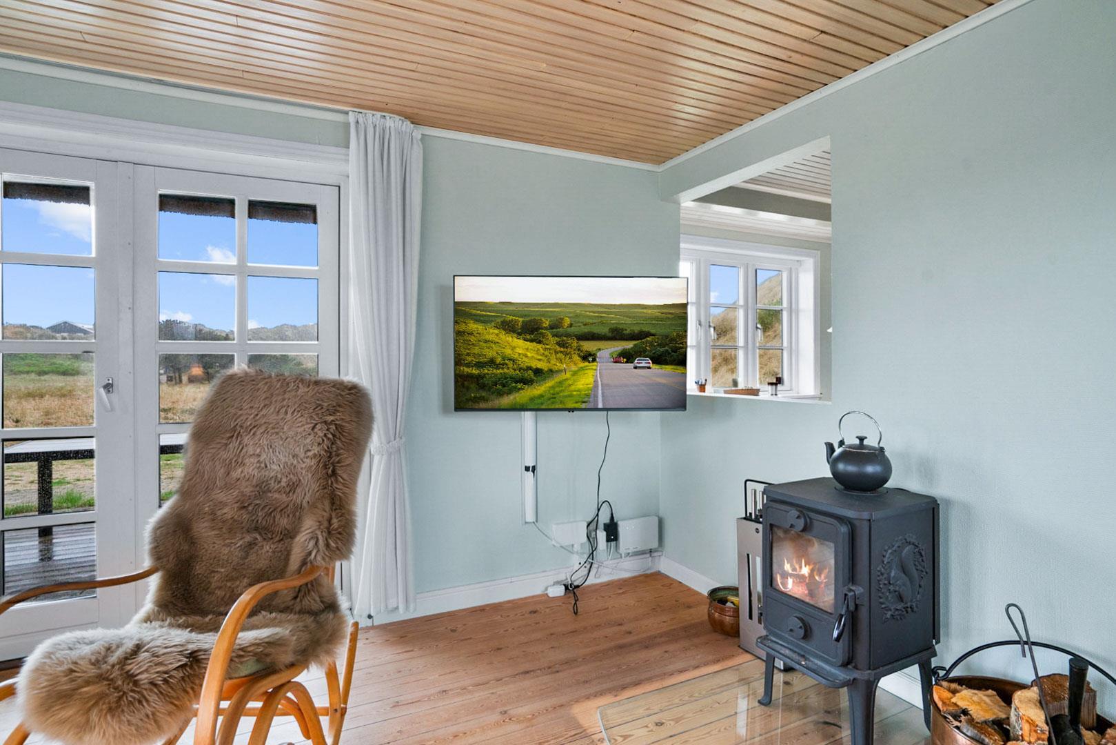 Det lyse opholds- og spiseområde imponerer med store vinduespartier og en skøn udsigt over klitterne. Her kan du gøre det hyggeligt foran pejsen, mens vinden blæser gennem heden udenfor. En varmepumpe sørger for behagelige temperaturer hele året.