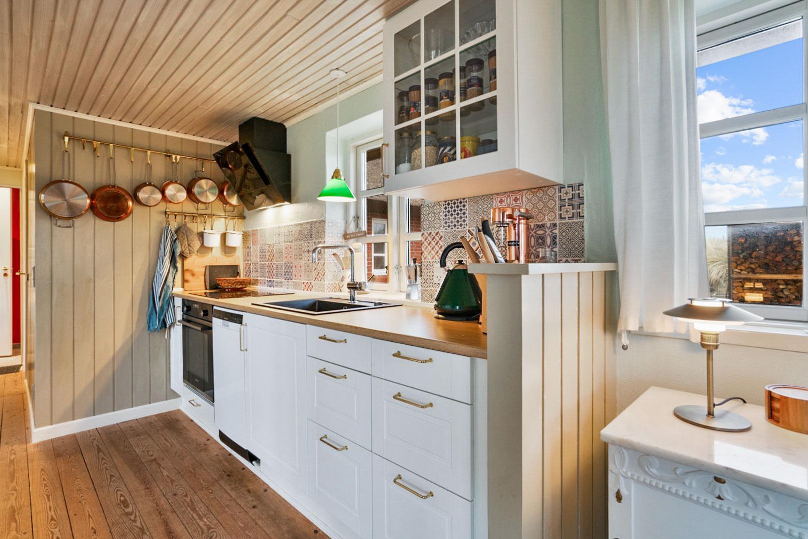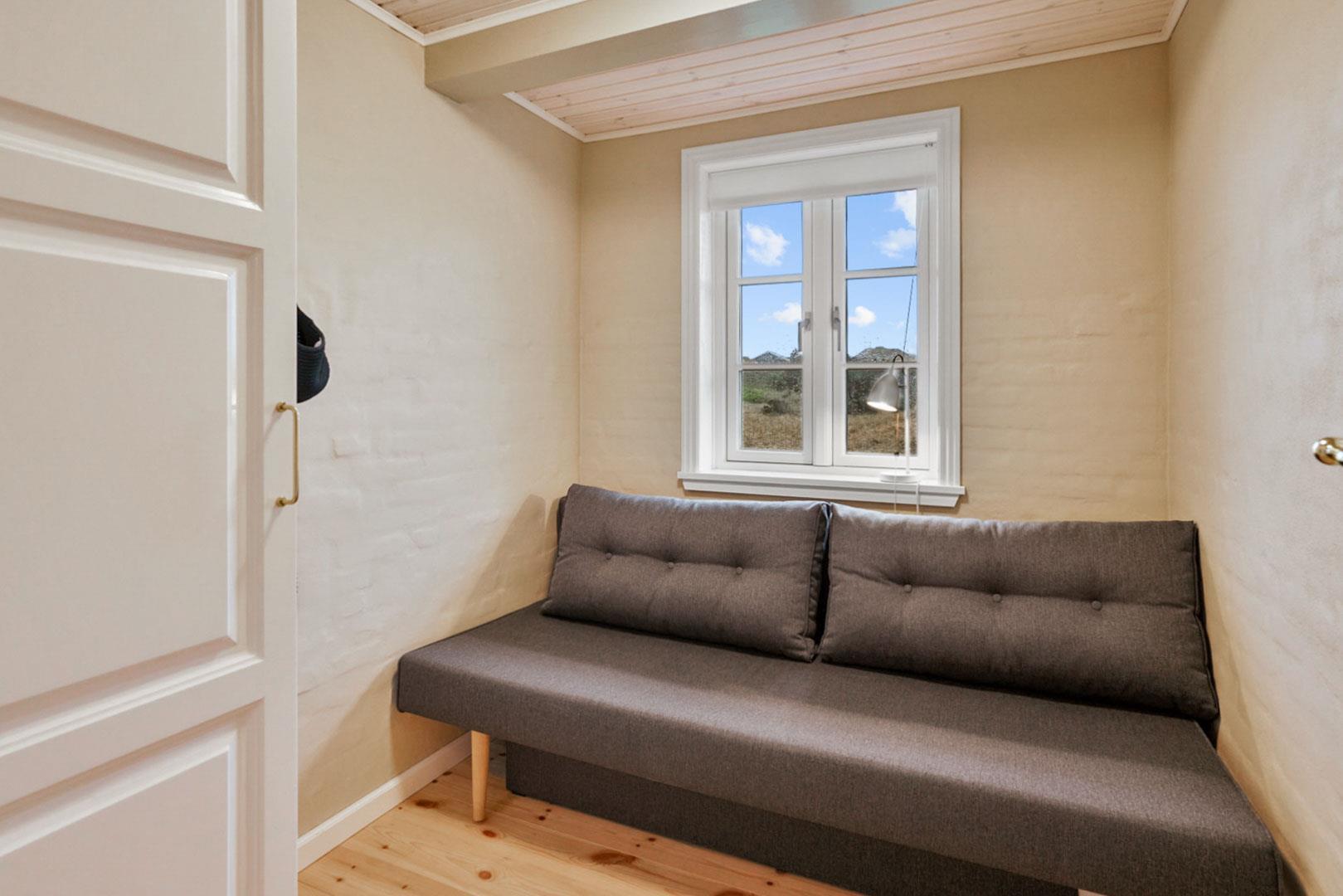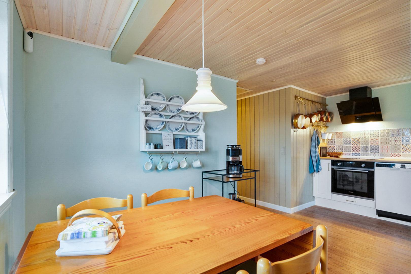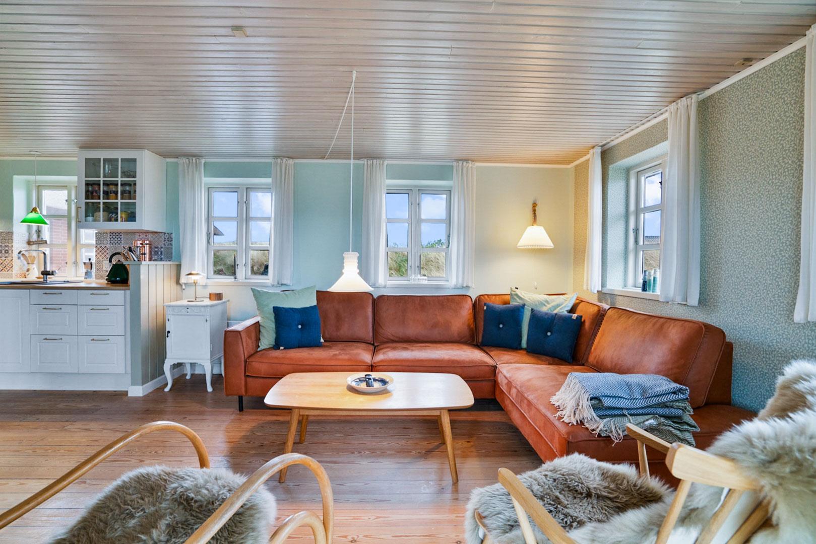 Det lyse opholds- og spiseområde imponerer med store vinduespartier og en skøn udsigt over klitterne. Her kan du gøre det hyggeligt foran pejsen, mens vinden blæser gennem heden udenfor. En varmepumpe sørger for behagelige temperaturer hele året.