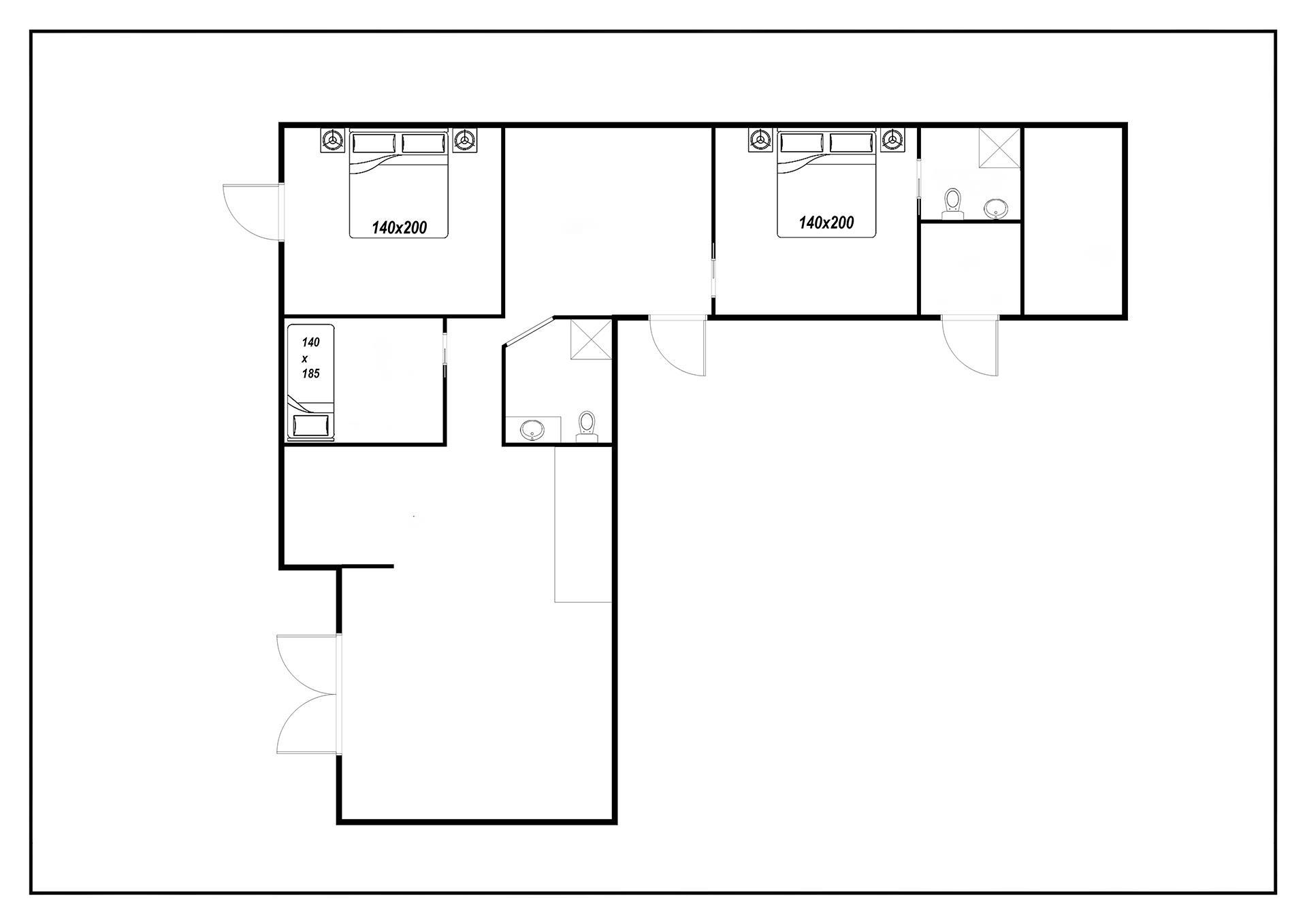 2 dobbeltsenge 140 x 200 cm + 1 dobbeltseng 140 x 185 cm.