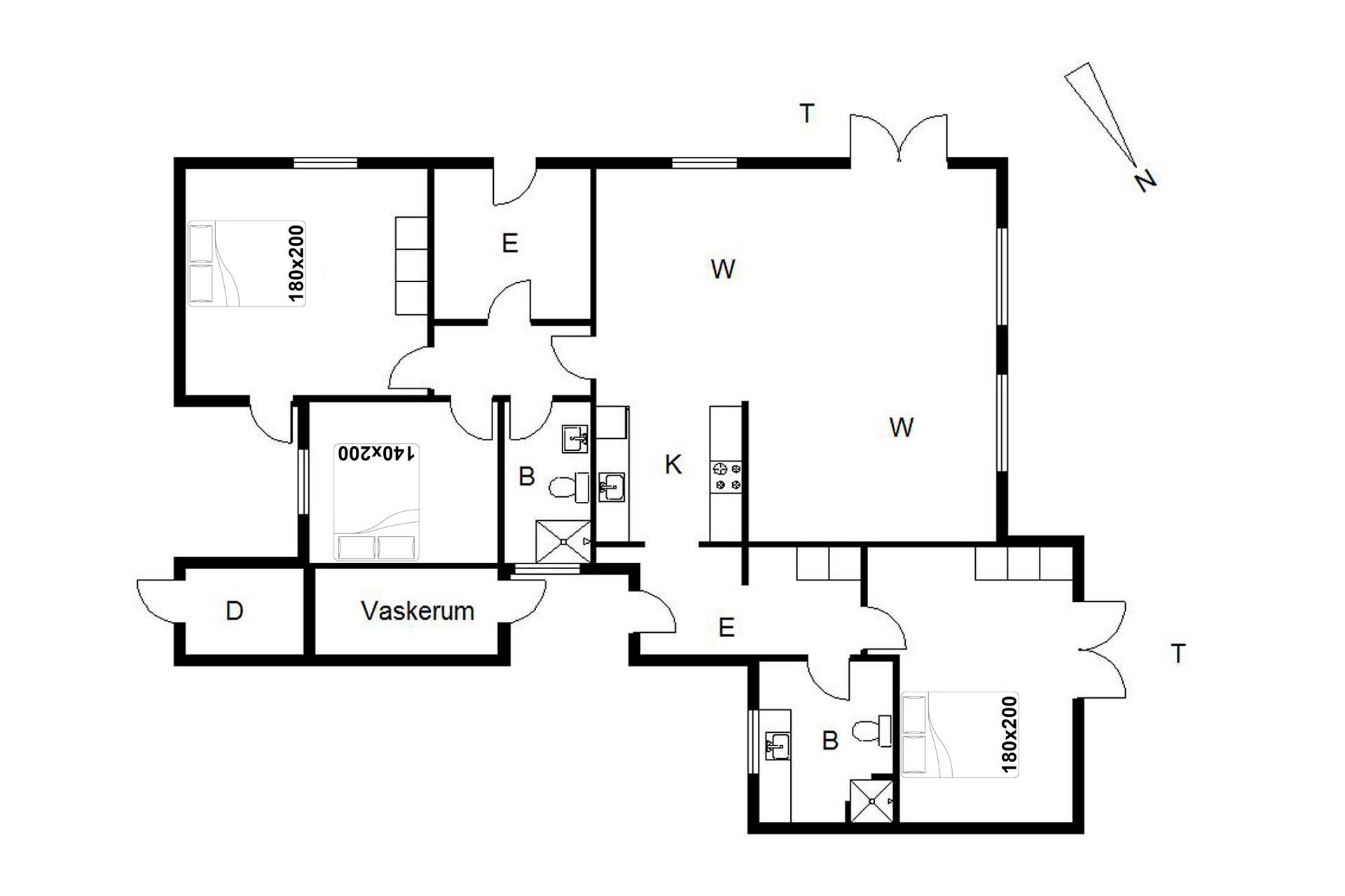Sengestørrelse: 2 dobbeltsenge 180 x 200 cm + 1 dobbeltseng 160 x 200 cm.