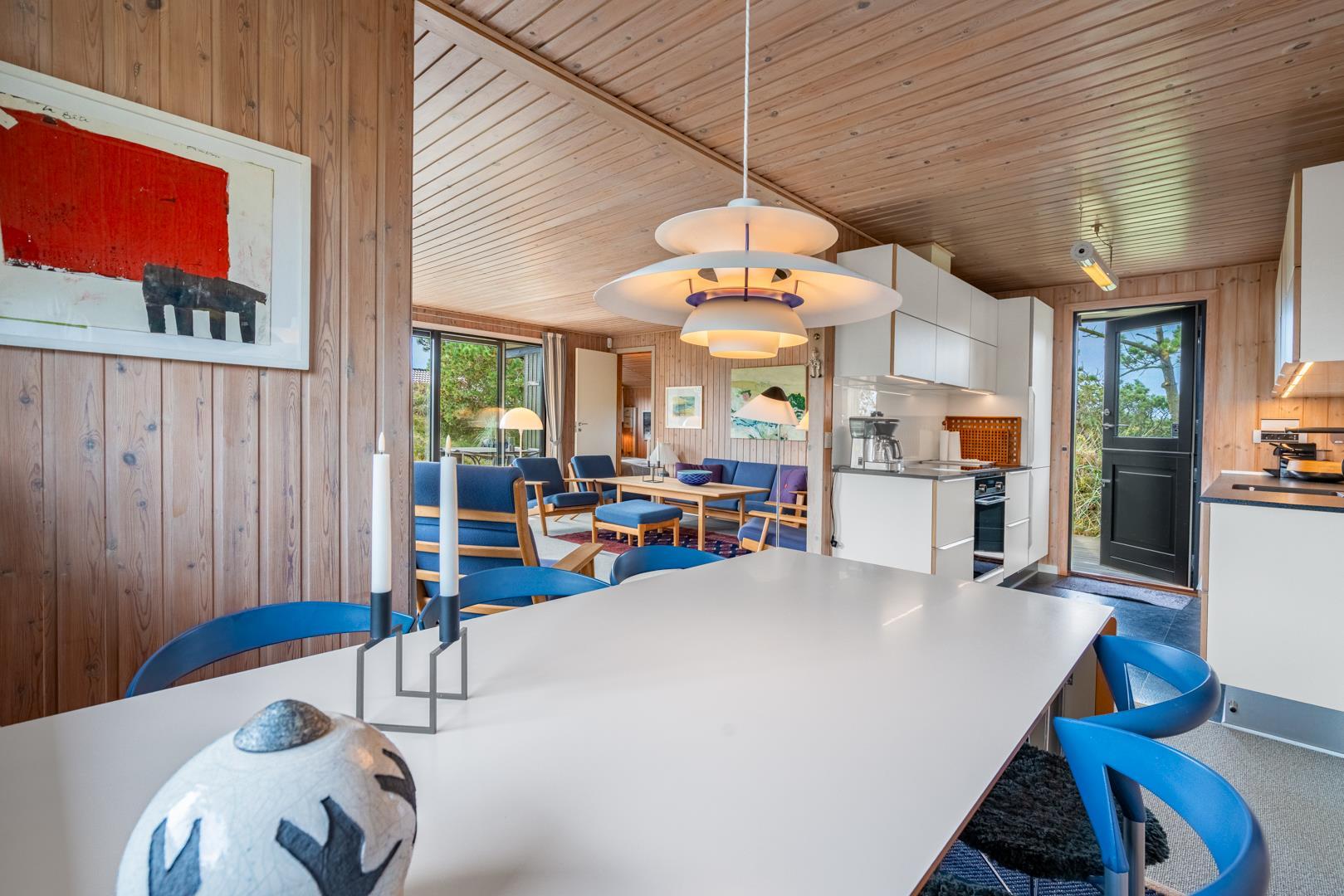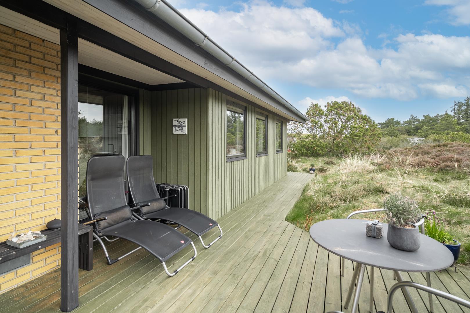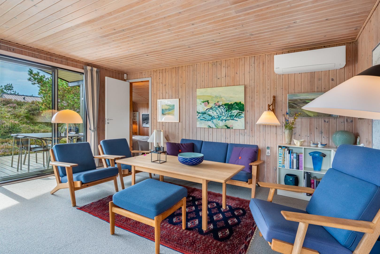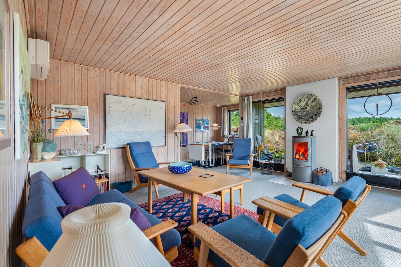 Privat og smagfuldt indrettet feriehus beliggende på en rolig og kuperet naturgrund ud til fredet område, godt tilbage trukket fra vejen. Fra stuen er udgang til feriehusets ugeneret, delvis overdækkede terrasse med panorama udsigt til områdets lyngklædte klitter. Sengestørrelser: dobbeltseng 180x200 cm. (2 madrasser), dobbeltseng 140 x 200 enkeltsenge85x200 cm.,