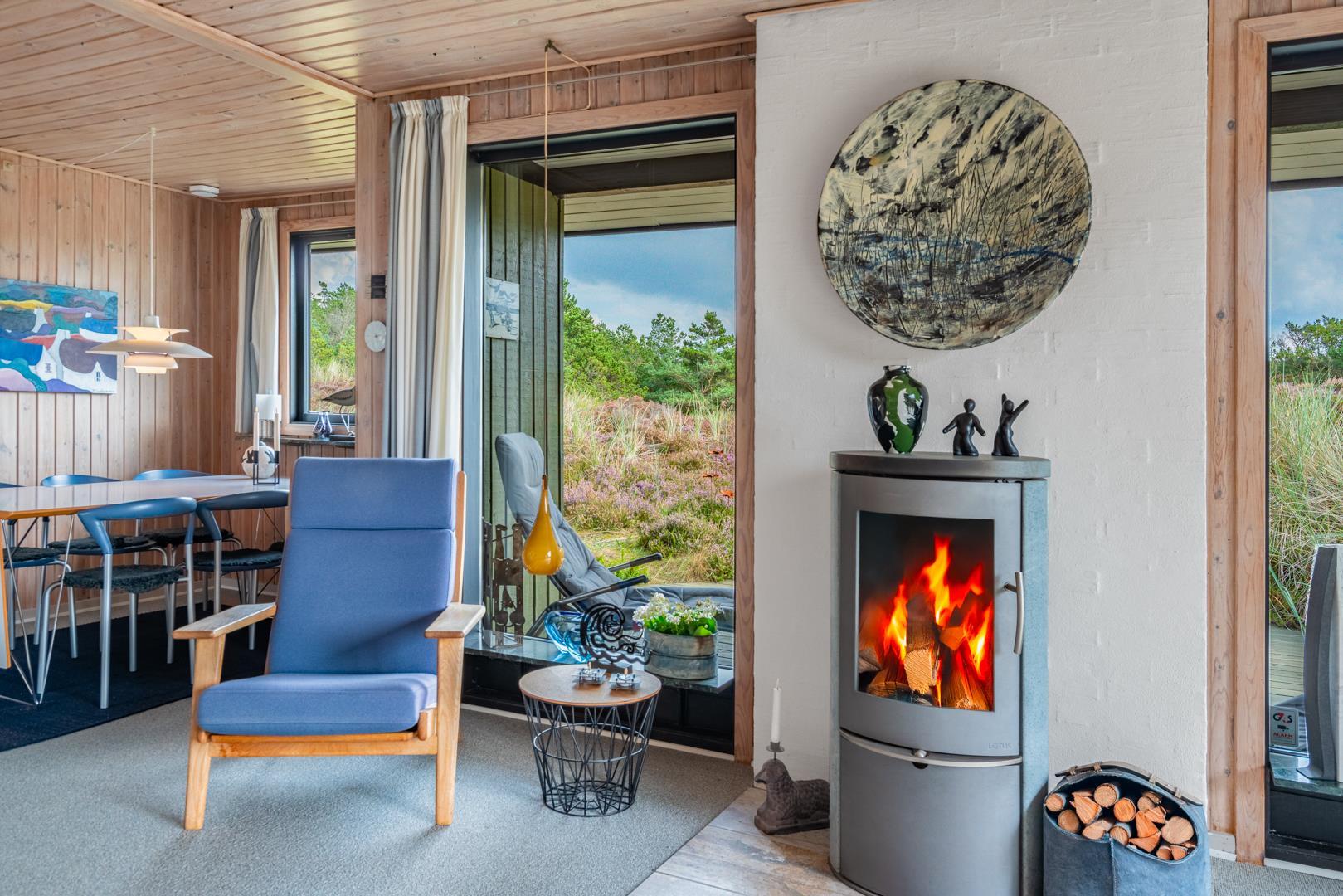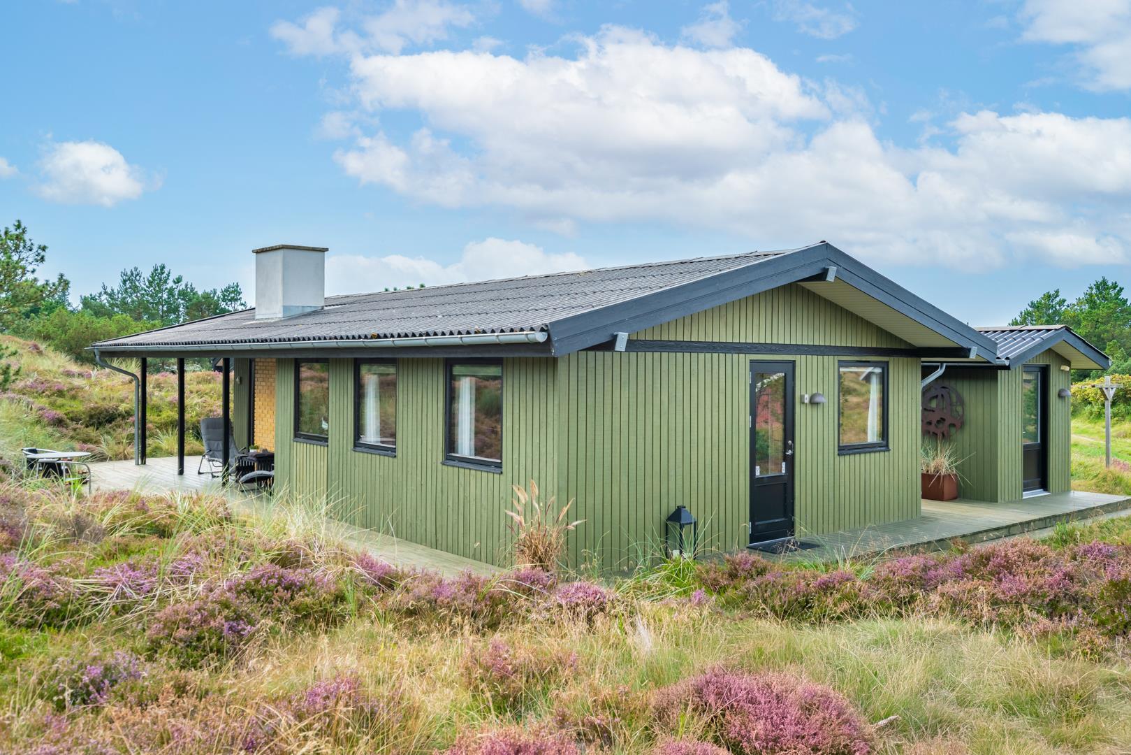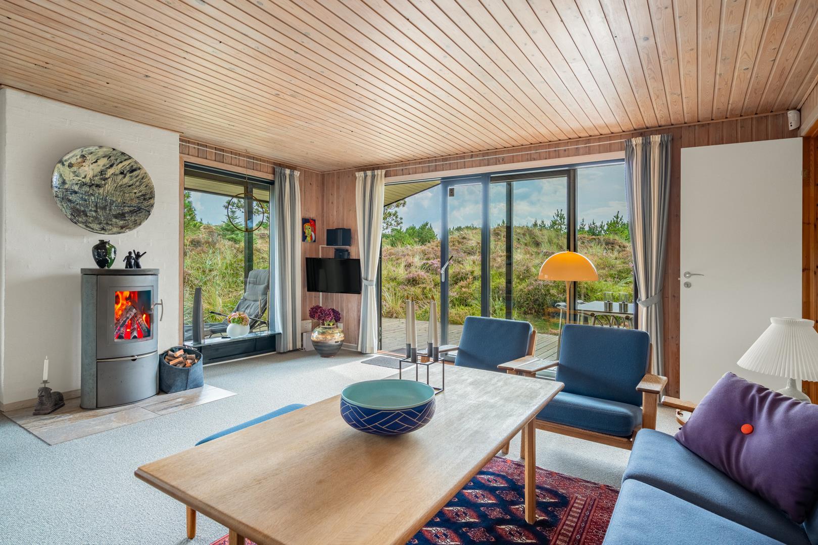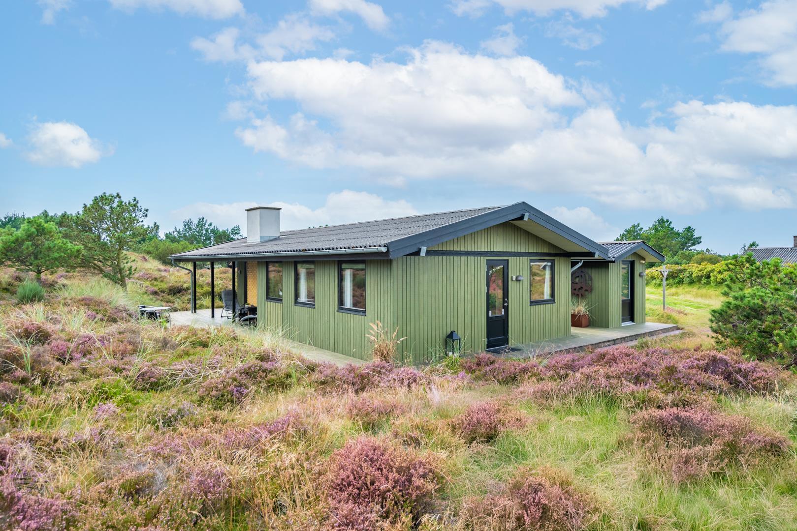 Privat og smagfuldt feriehus på en rolig naturgrund med panoramaudsigt til lyngklædte klitter i Henne Strand.
