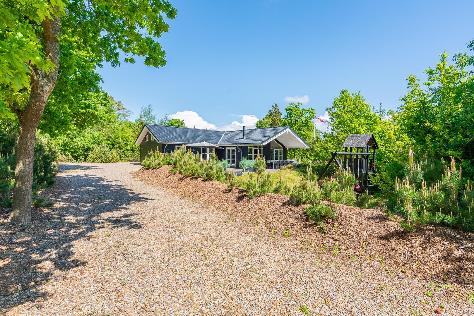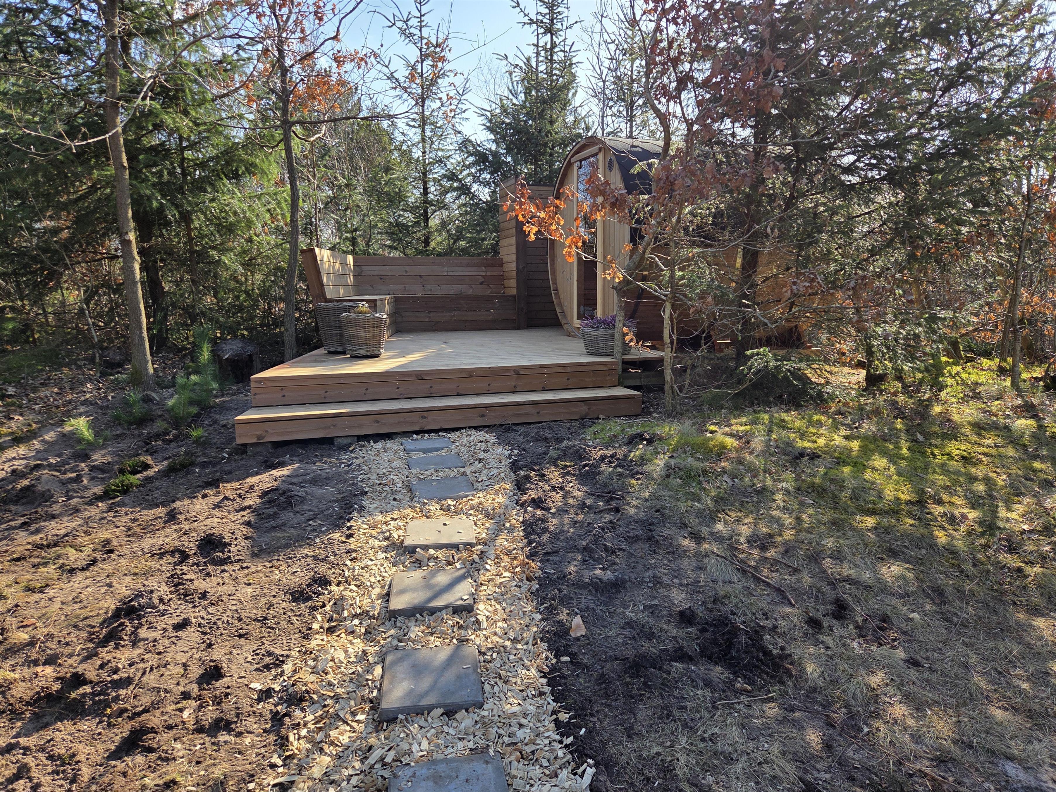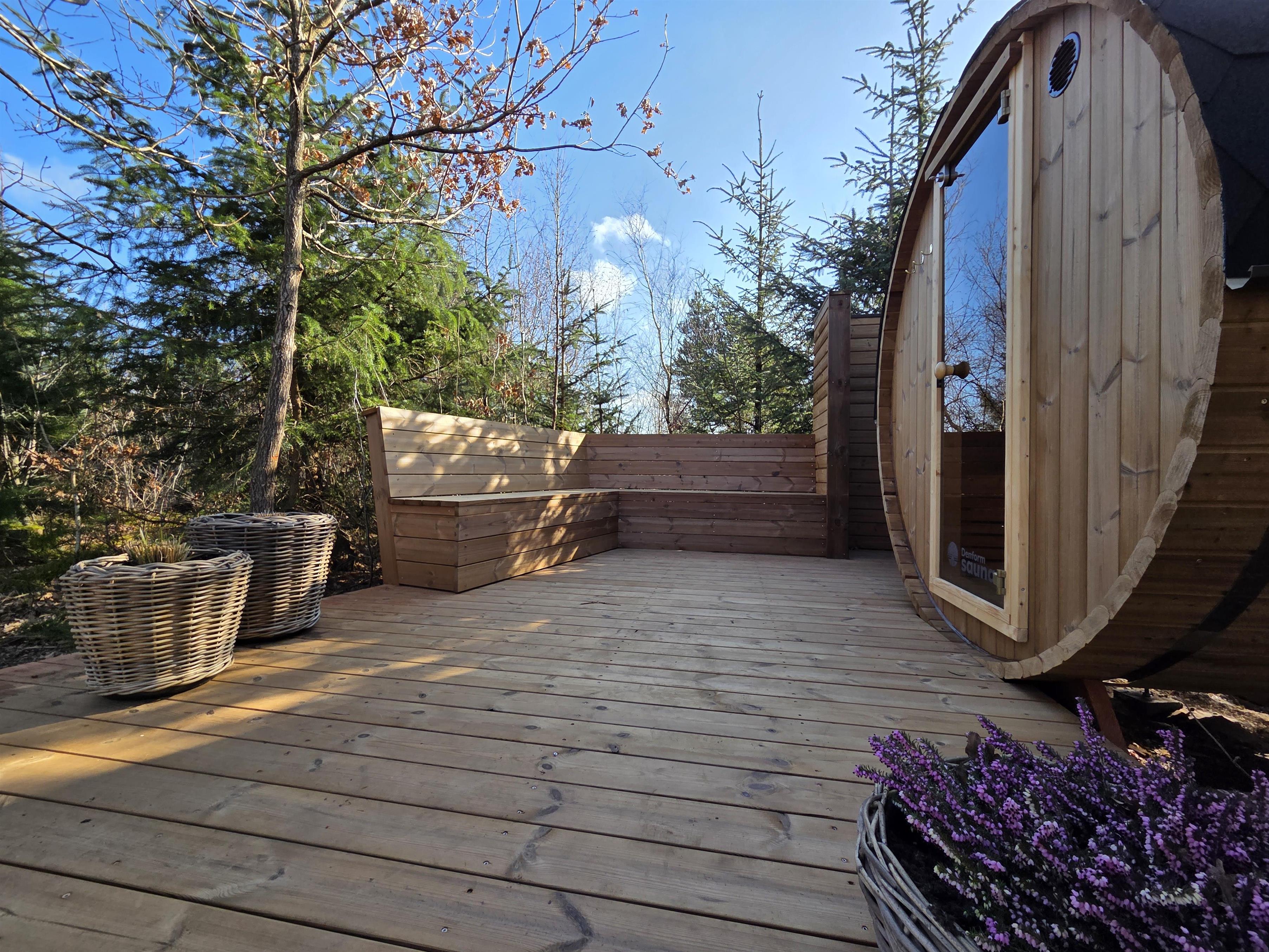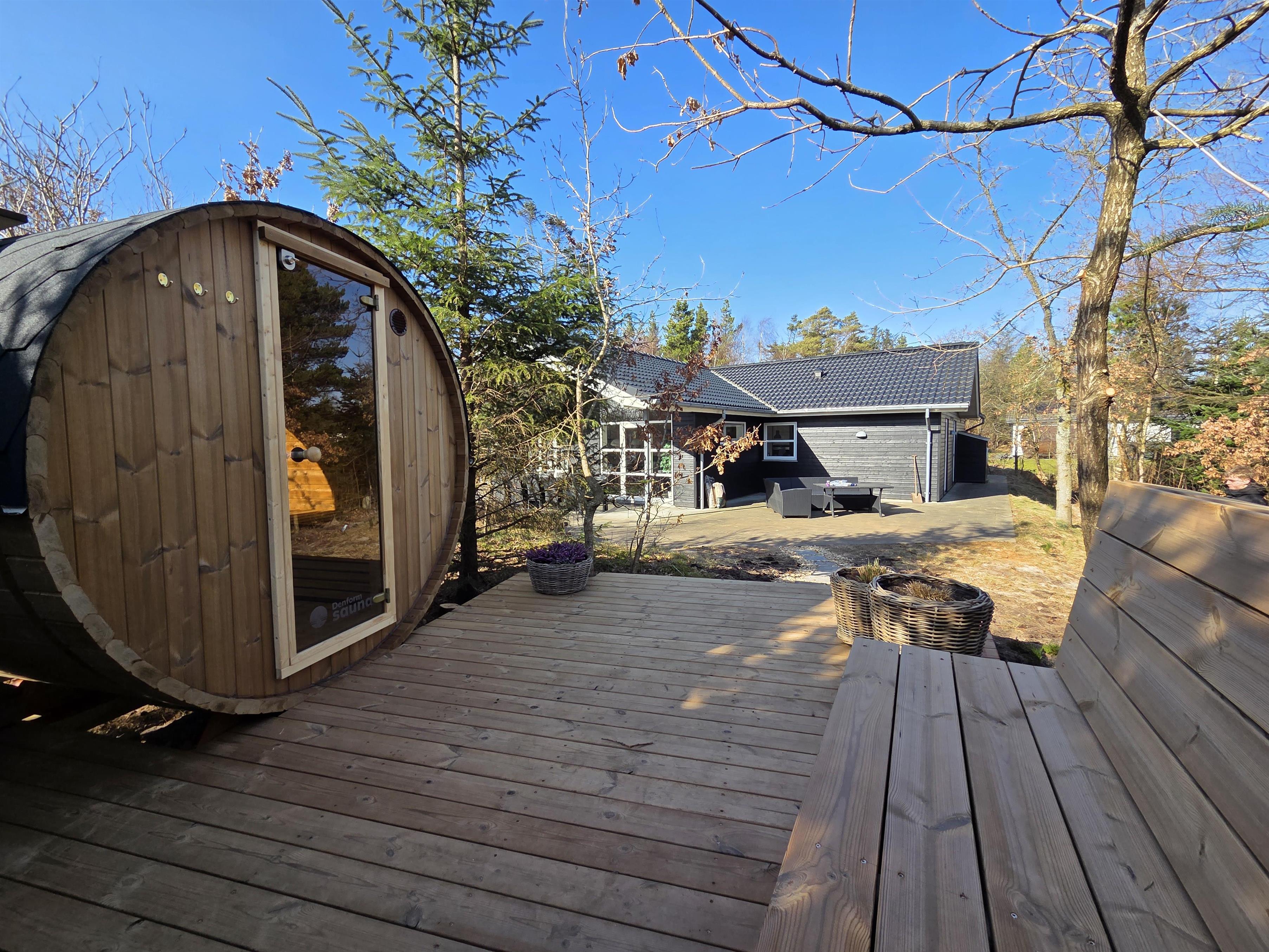 På grunden finder du en skøn "skovsauna" og ude bruser med tilhørende udeområde. Her ligger den helt ugeneret, så roen og den naturskønne grund kan nydes i fulde drag.