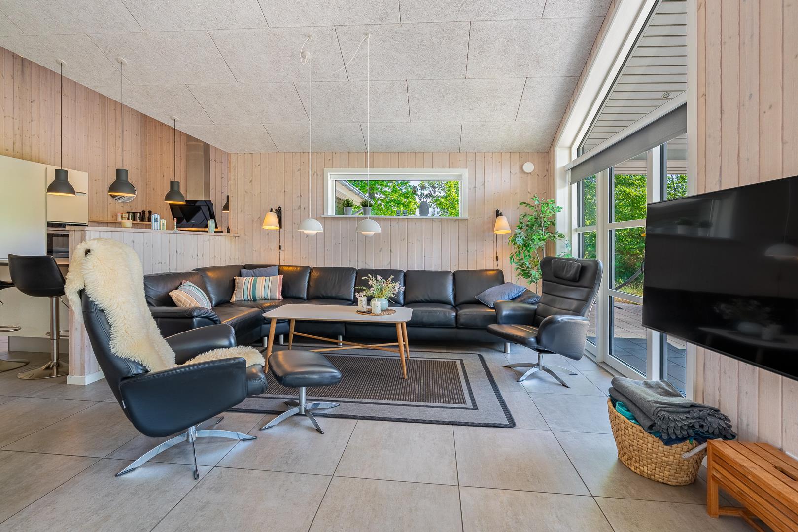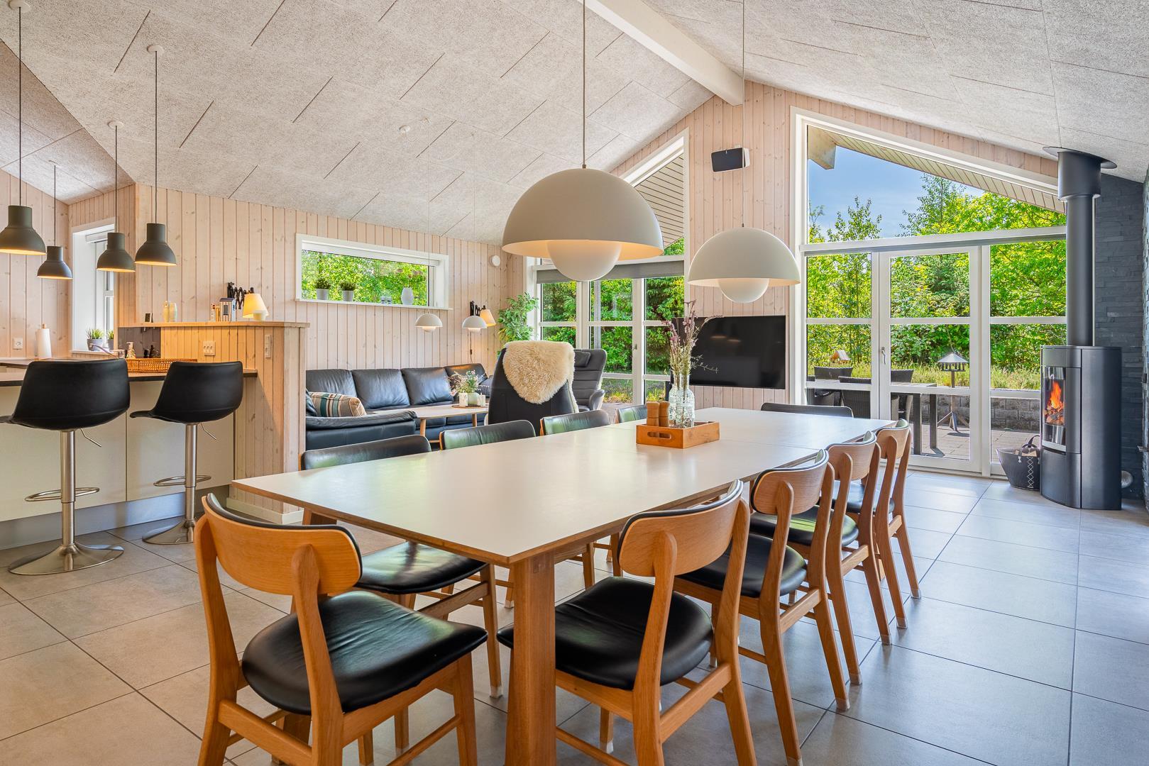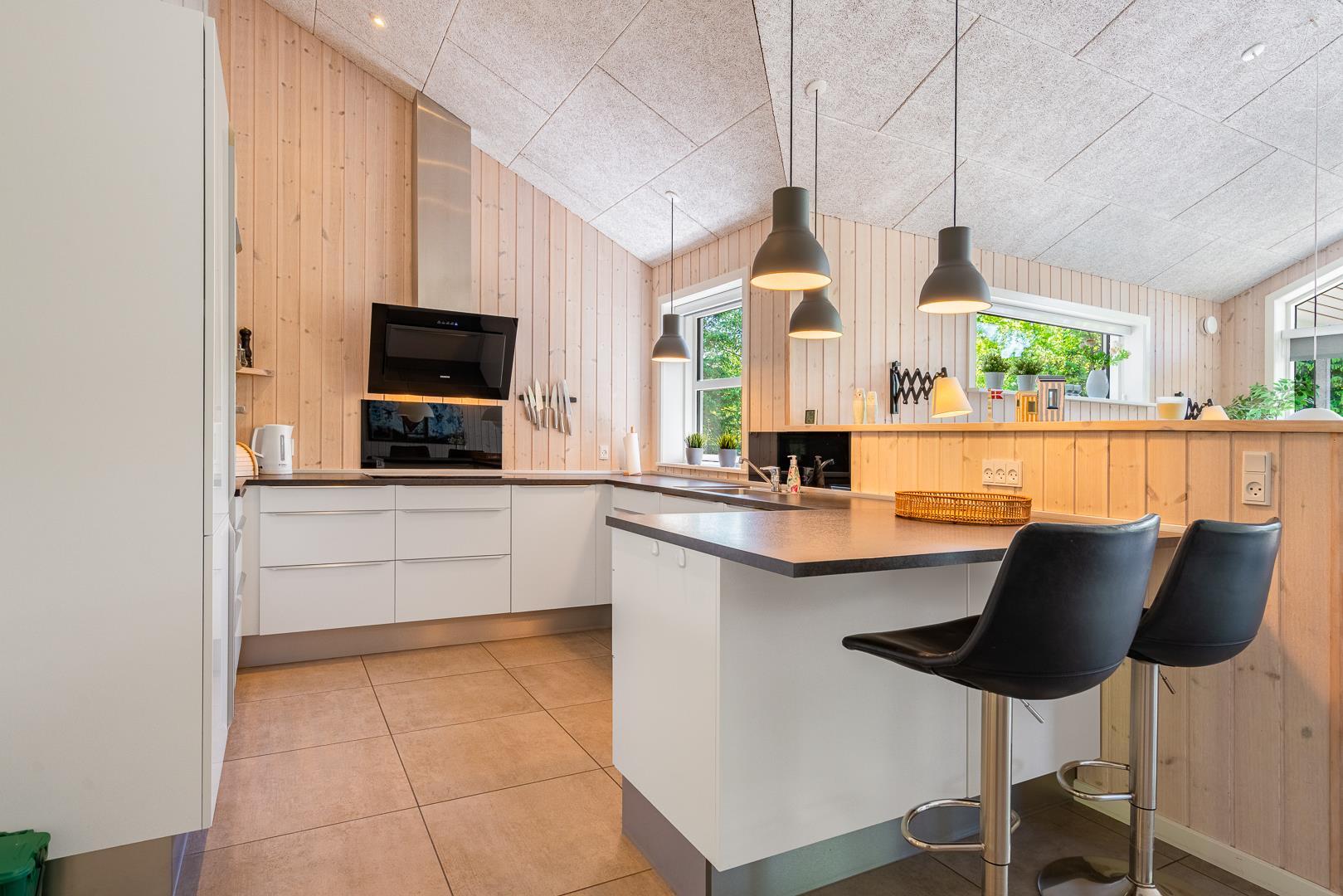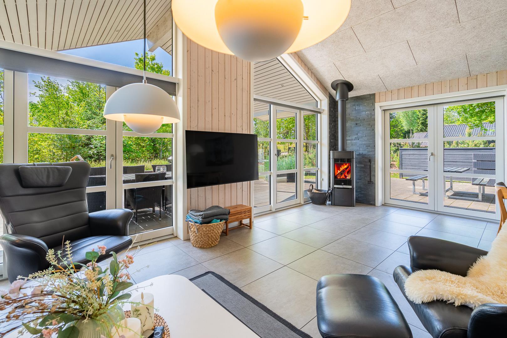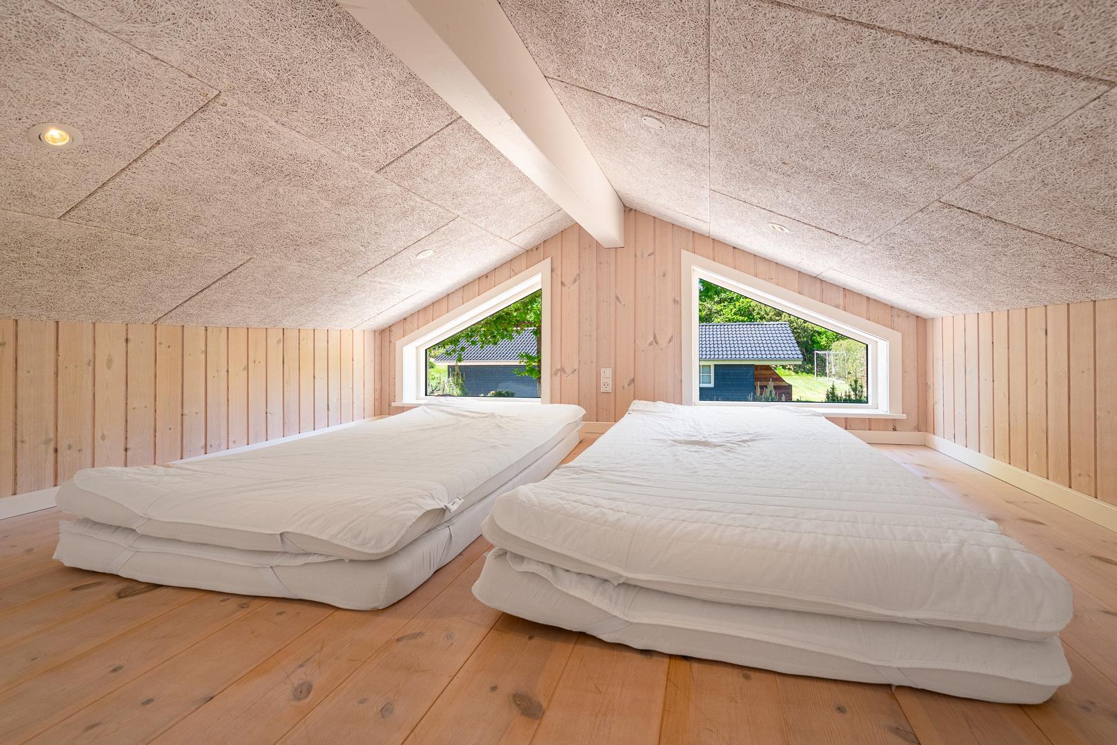 Foruden hemsen, som sagtens kan rumme et par sovende børn, byder huset på fire dobbeltværelser, som ligger velplaceret to og to. Herudover er der et stort skønt opholdsmiljø med køkken i den ene ende, mens der i den anden er hyggeafdeling med en stor, lækker hjørnesofa, brændeovn og en god stor spiseplads. Der er højt til lofterne, som er beklædt med akustikplader, og der er et flot lysindfald fra opholdsrummets store vinduesparti.