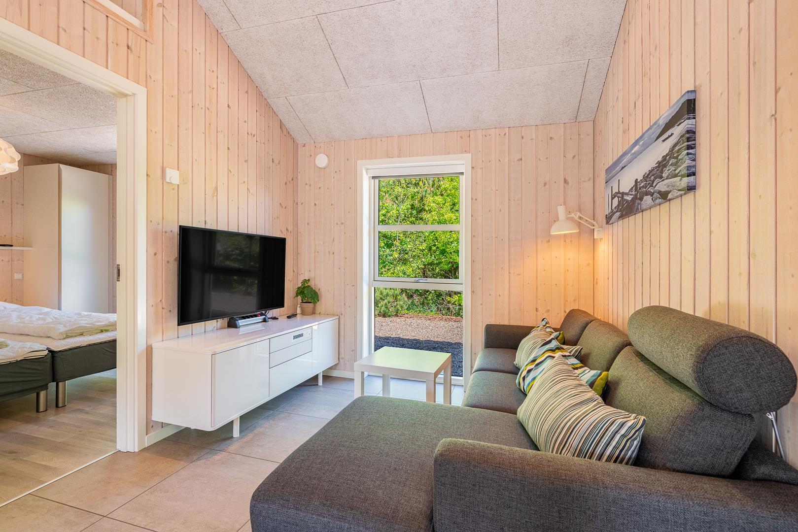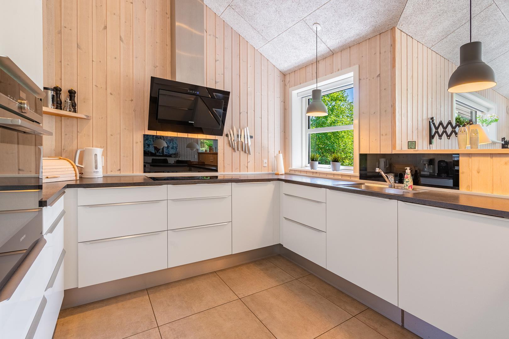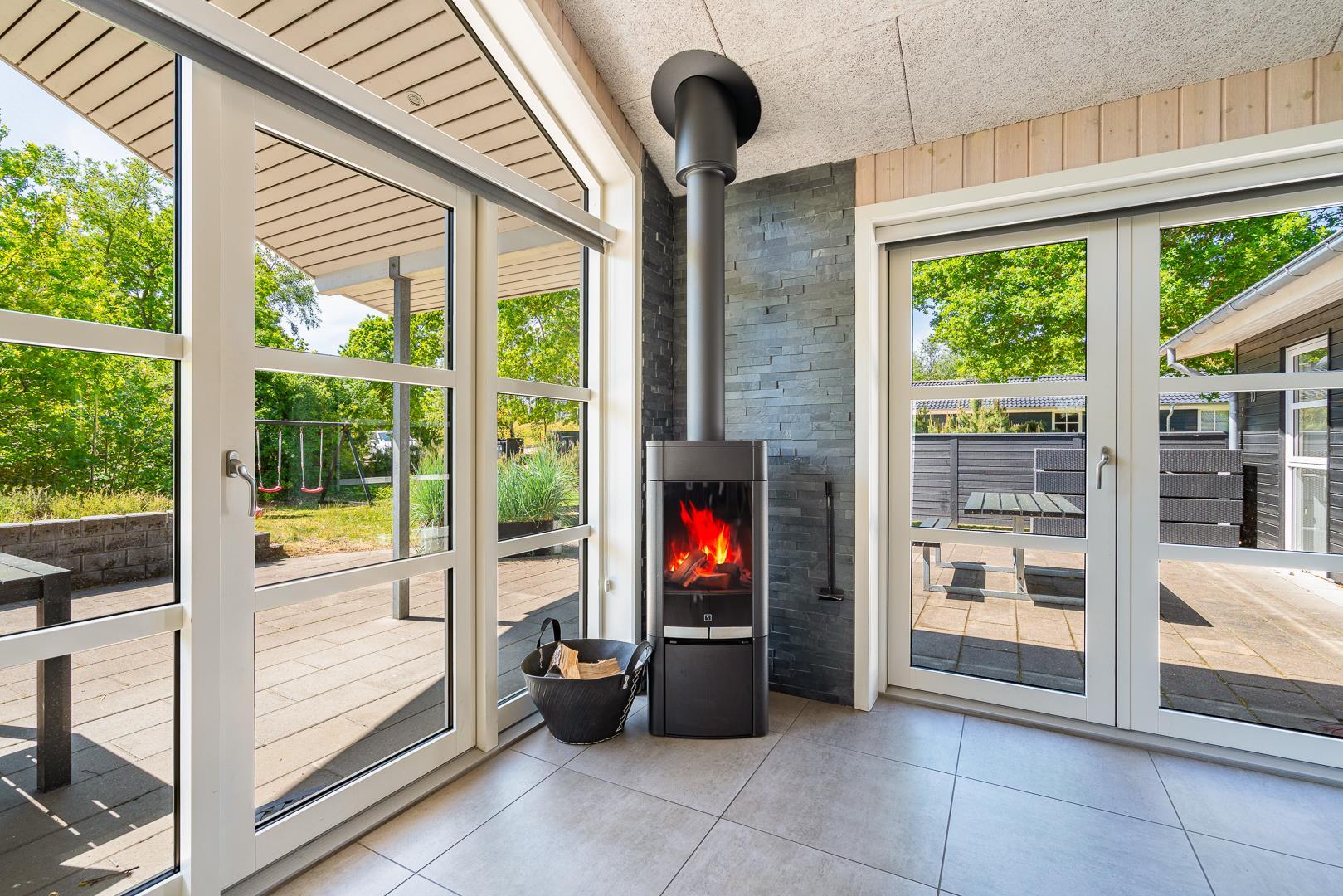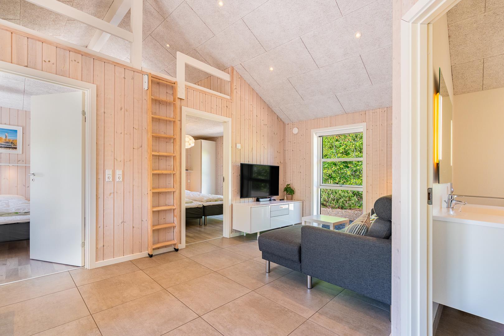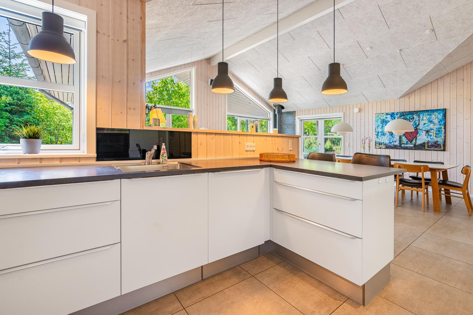Foruden hemsen, som sagtens kan rumme et par sovende børn, byder huset på fire dobbeltværelser, som ligger velplaceret to og to. Herudover er der et stort skønt opholdsmiljø med køkken i den ene ende, mens der i den anden er hyggeafdeling med en stor, lækker hjørnesofa, brændeovn og en god stor spiseplads. Der er højt til lofterne, som er beklædt med akustikplader, og der er et flot lysindfald fra opholdsrummets store vinduesparti.