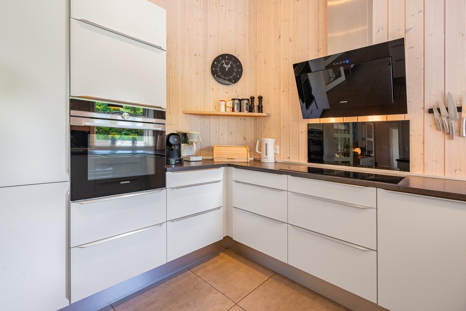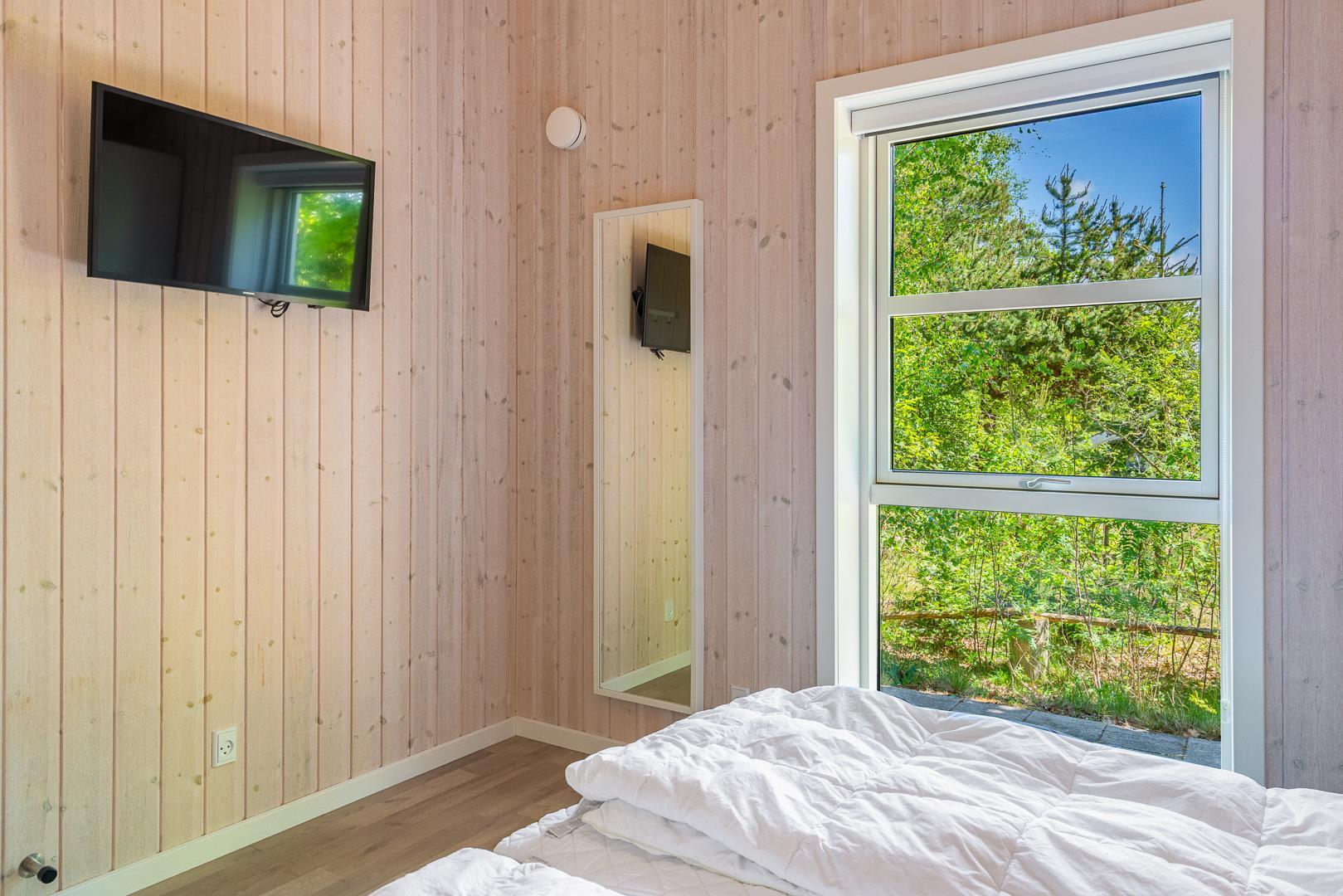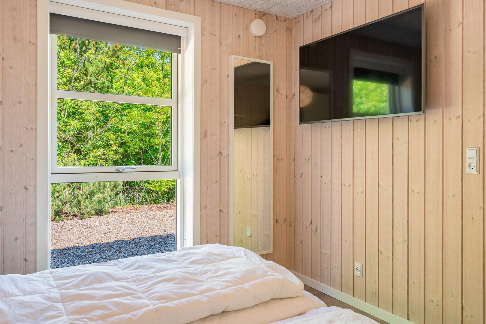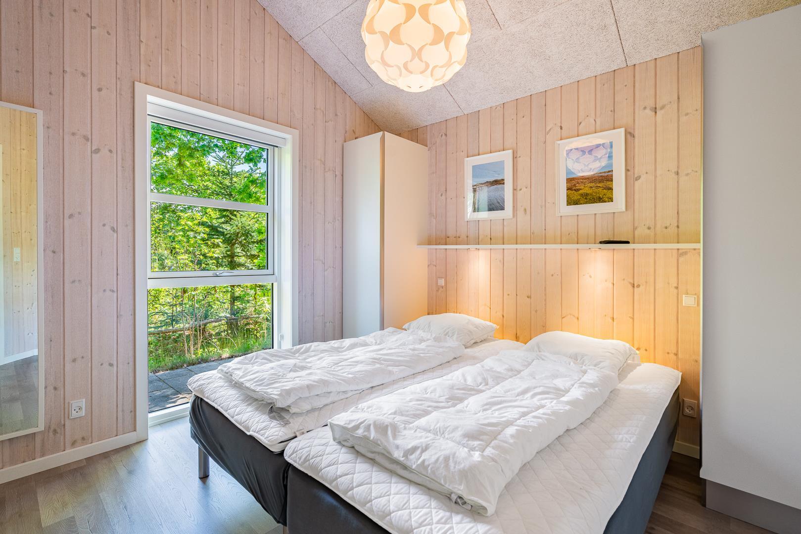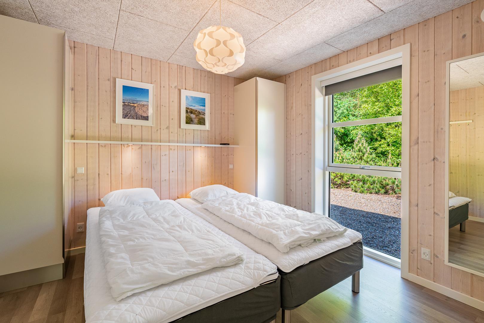 Foruden hemsen, som sagtens kan rumme et par sovende børn, byder huset på fire dobbeltværelser, som ligger velplaceret to og to. Herudover er der et stort skønt opholdsmiljø med køkken i den ene ende, mens der i den anden er hyggeafdeling med en stor, lækker hjørnesofa, brændeovn og en god stor spiseplads. Der er højt til lofterne, som er beklædt med akustikplader, og der er et flot lysindfald fra opholdsrummets store vinduesparti.