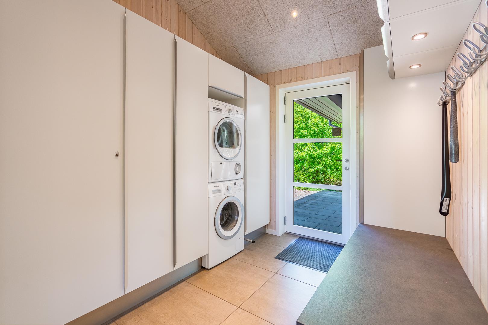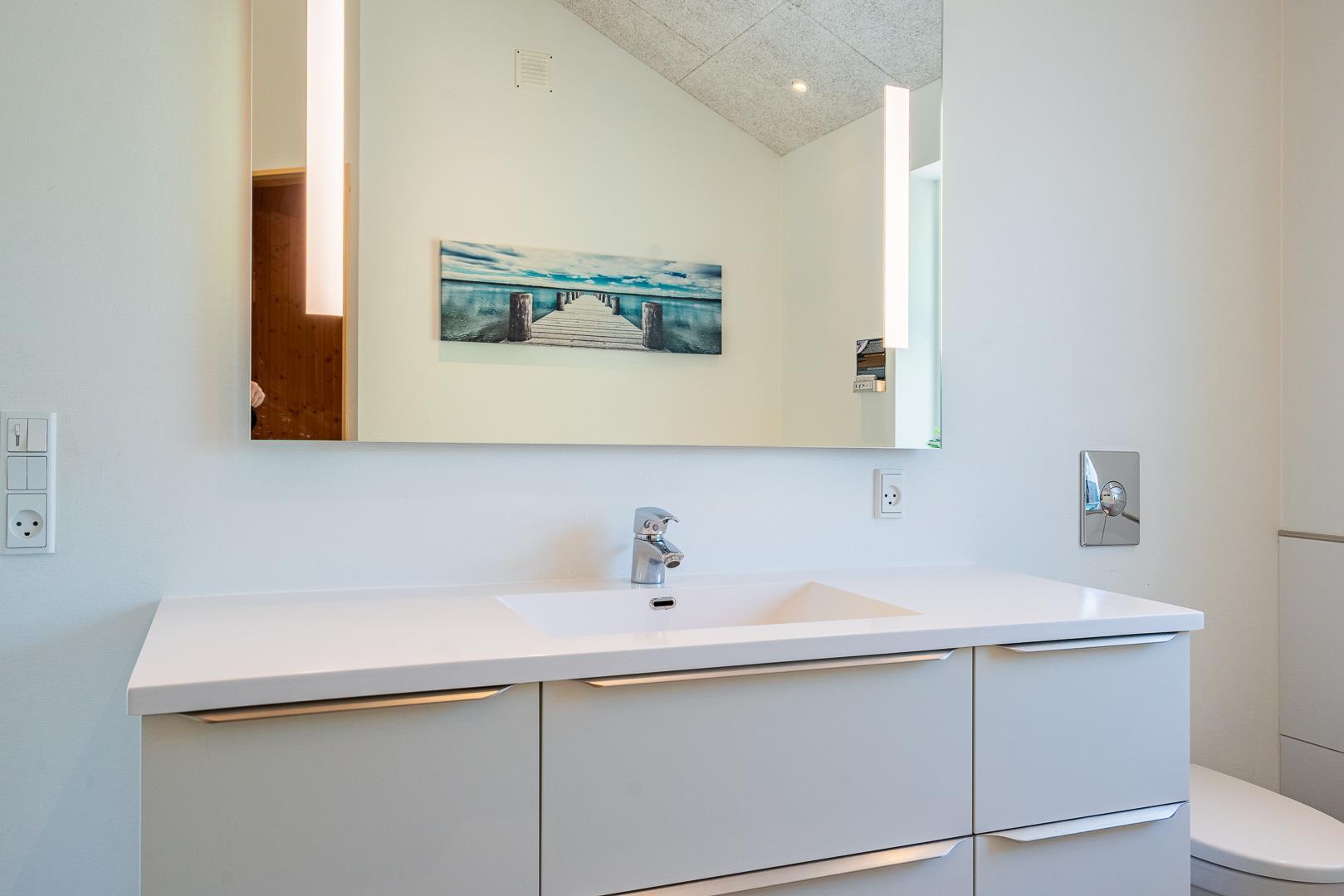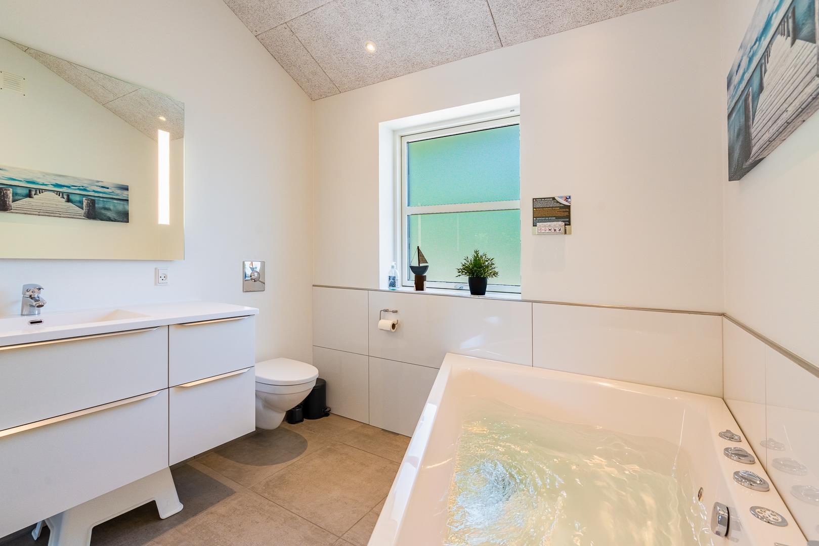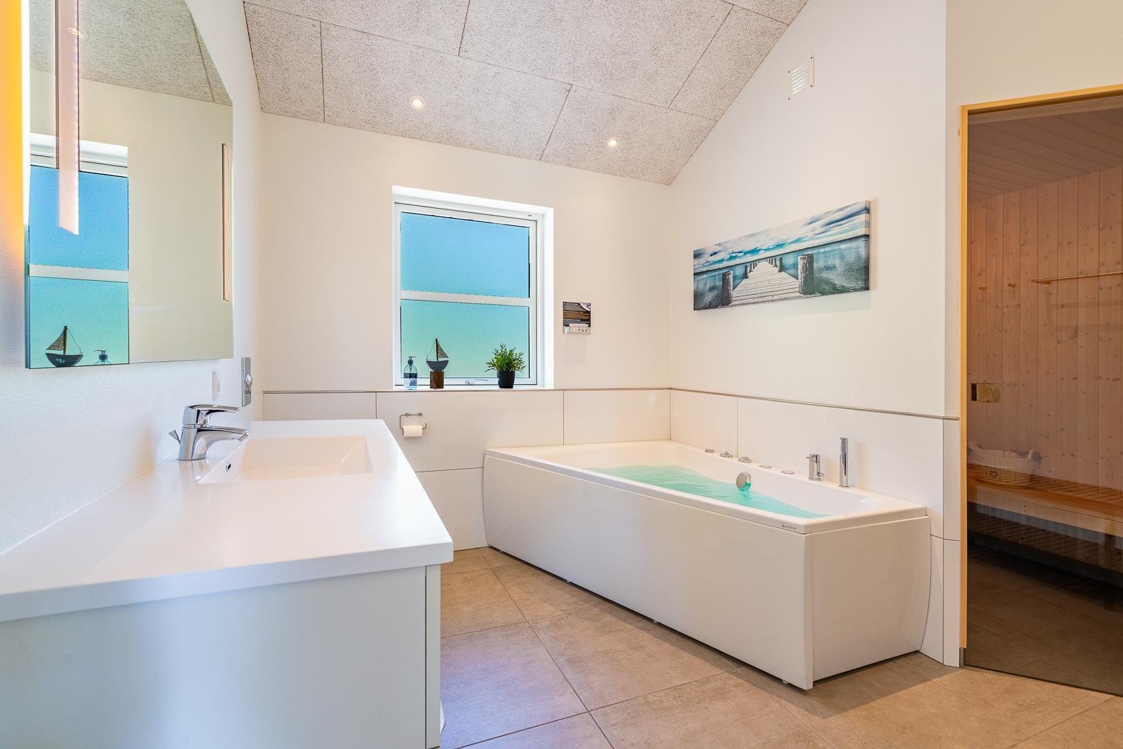 Herudover er der to badeværelser i huset, hvoraf det ene er et lækkert wellness-rum med spabad og sauna. Der er energivenlig gulvvarme i hele huset, og desuden praktiske børnefaciliteter som højstol, babybadekar og puslepude samt gynge og sandkasse i haven. Huset lejes ikke ud til ungdomsgrupper.