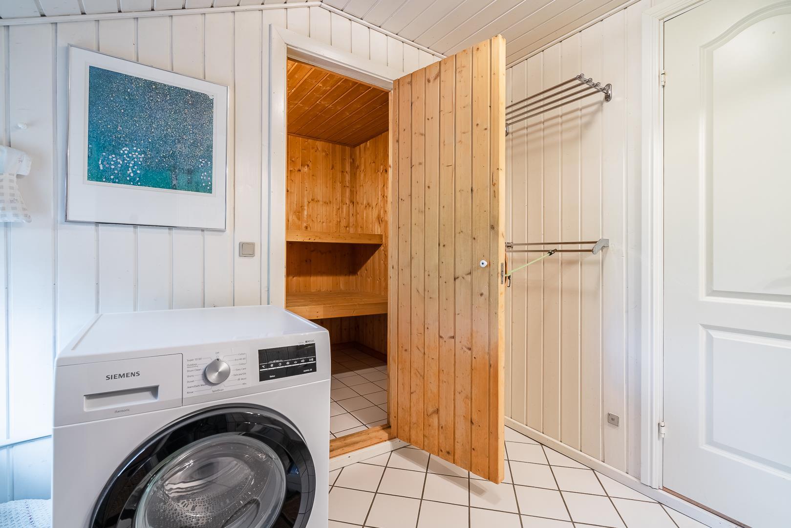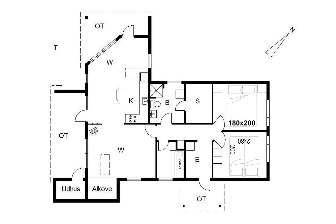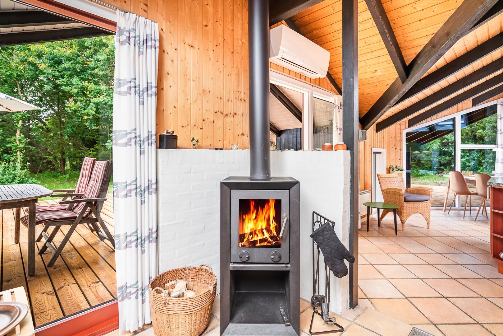 Det store køkken/alrum med gulvvarme ligger i åben forbindelse med den hyggelige stue, hvor en brændeovn med glaslåge fuldender den autentiske feriestemning. Fra stuen er der direkte udgang til en stor, delvist overdækket og ugeneret terrasse, hvor solen og naturens ro kan nydes hele dagen.