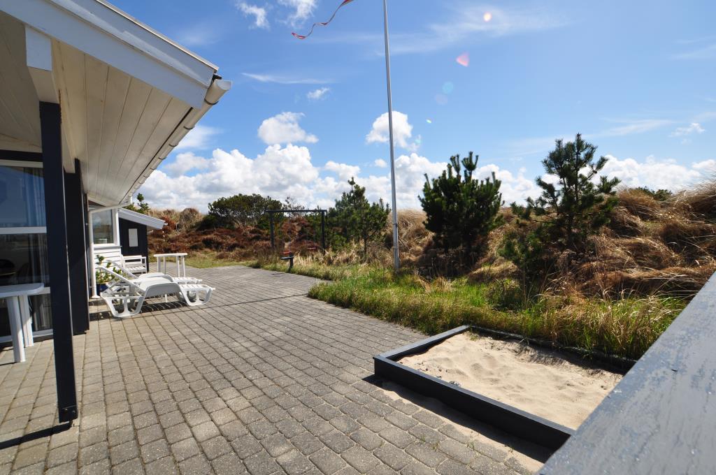 Fra køkken/alrummet er der direkte udgang til en dejlig stor og delvist overdækket terrasse med udsigt til naturen. Her er der også tænkt på børnefamilien med en sandkasse og gynger til de mindste i familien.