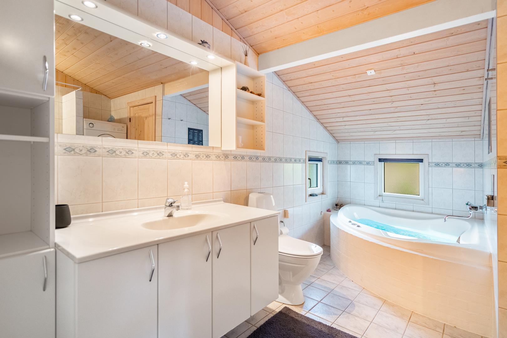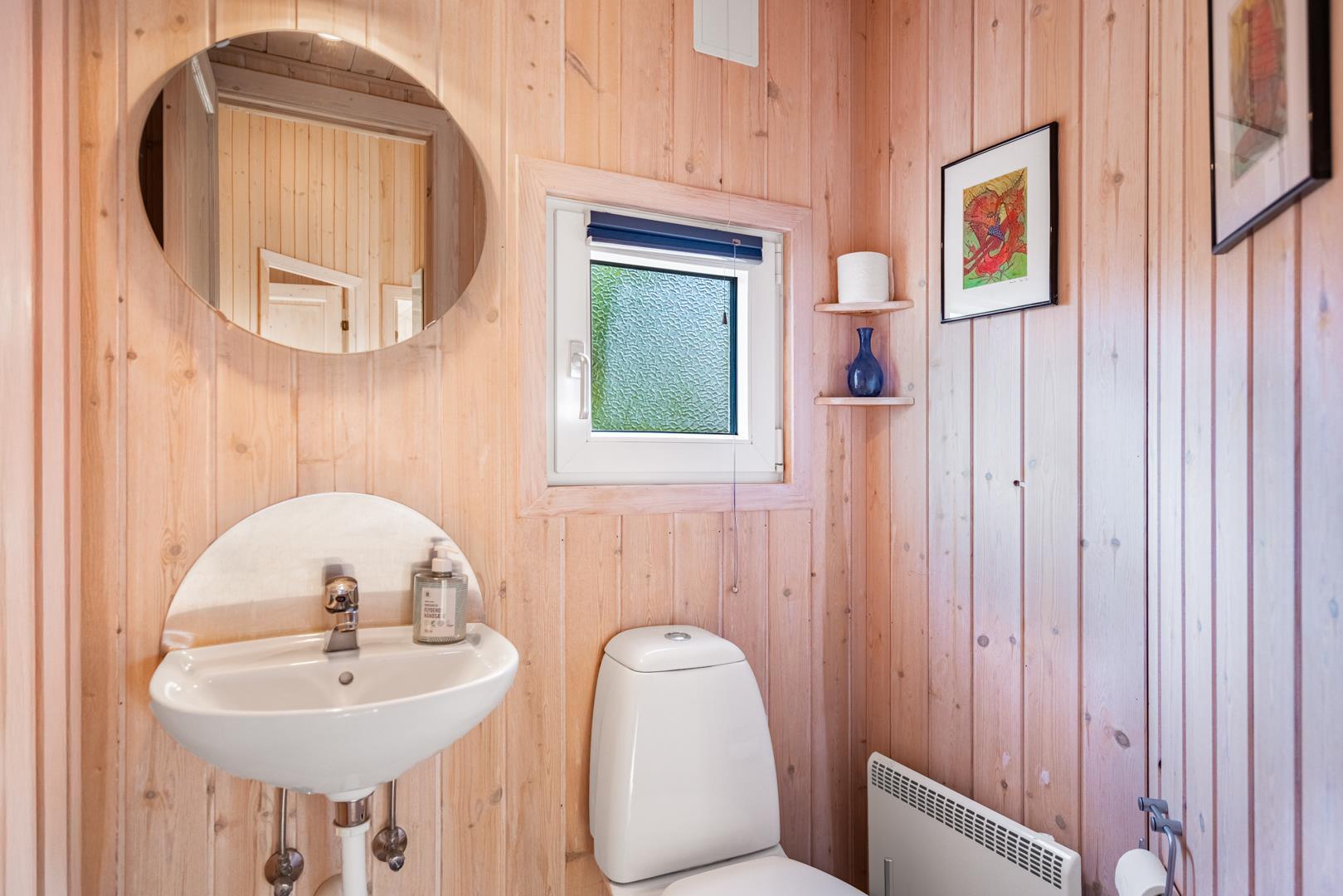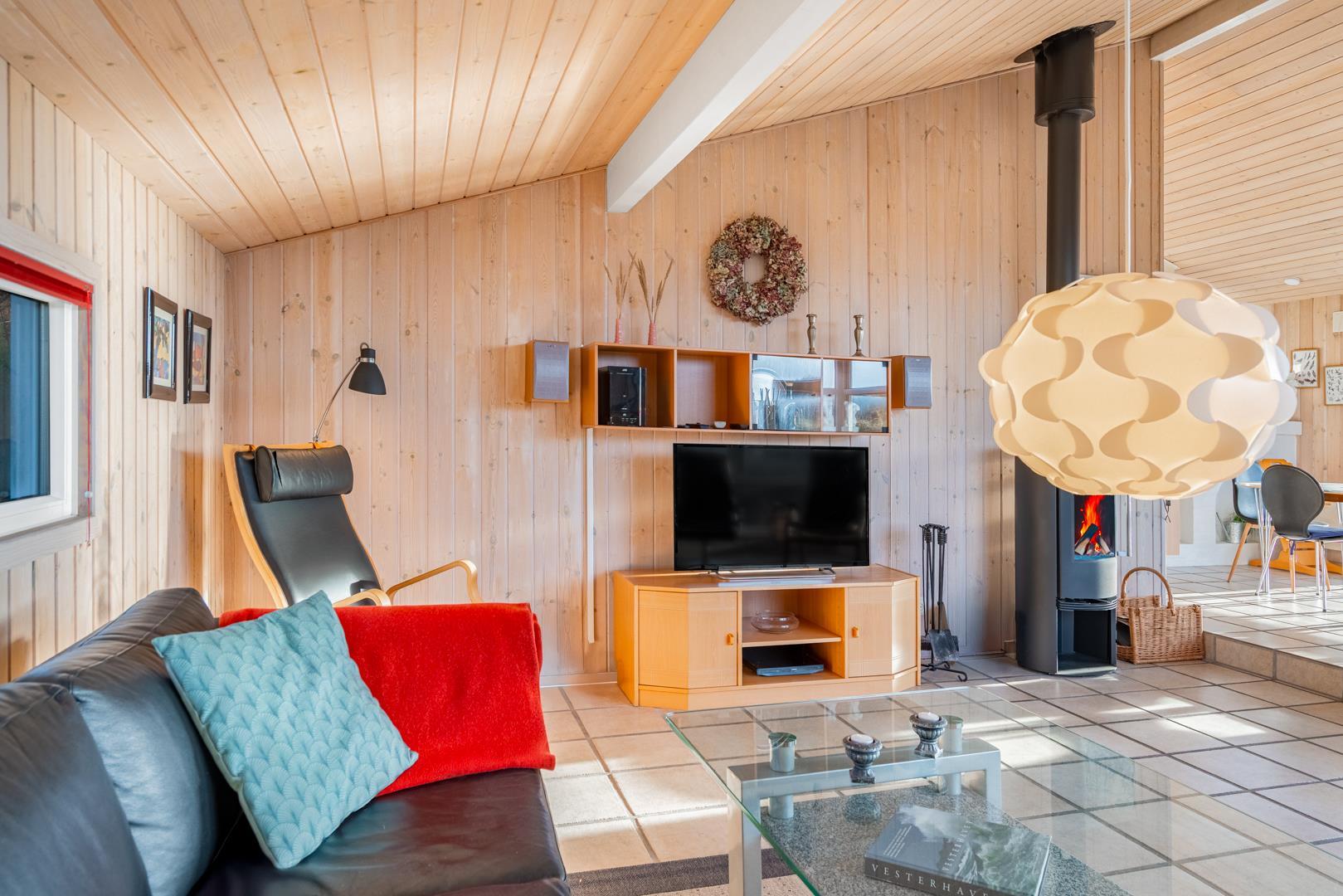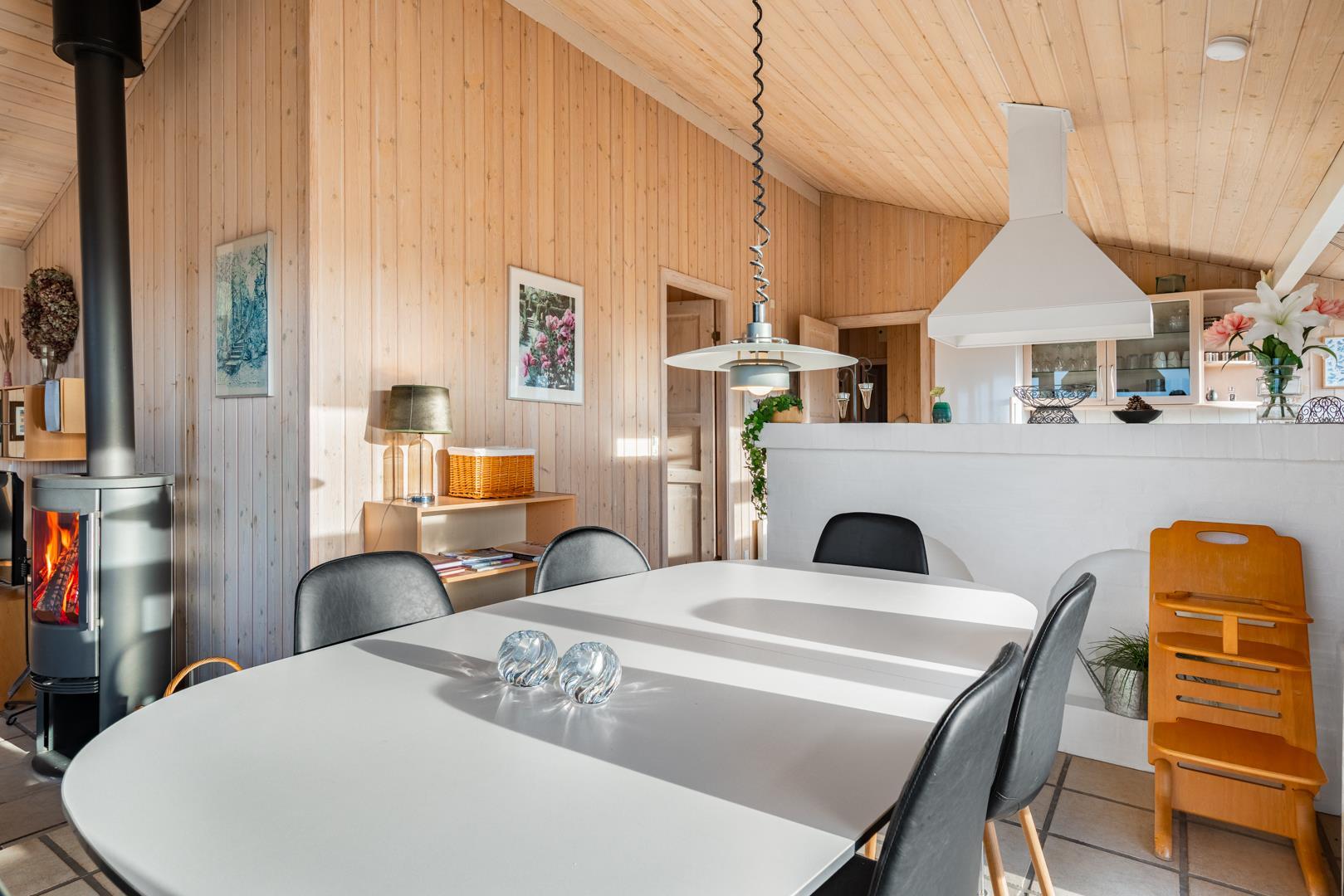 Huset rummer desuden et dejligt stort badeværelse med spabad og sauna samt vaskemaskine og tørretumbler. Udover et ekstra toilet har feriehuset en veludstyret køkken/alrum med opvaskemaskine og mikroovn. Stuen, der grænser op til køkken/alrummet, er pænt indrettet og har en hyggelig brændeovn der er med til at give den perfekte feriestemning.