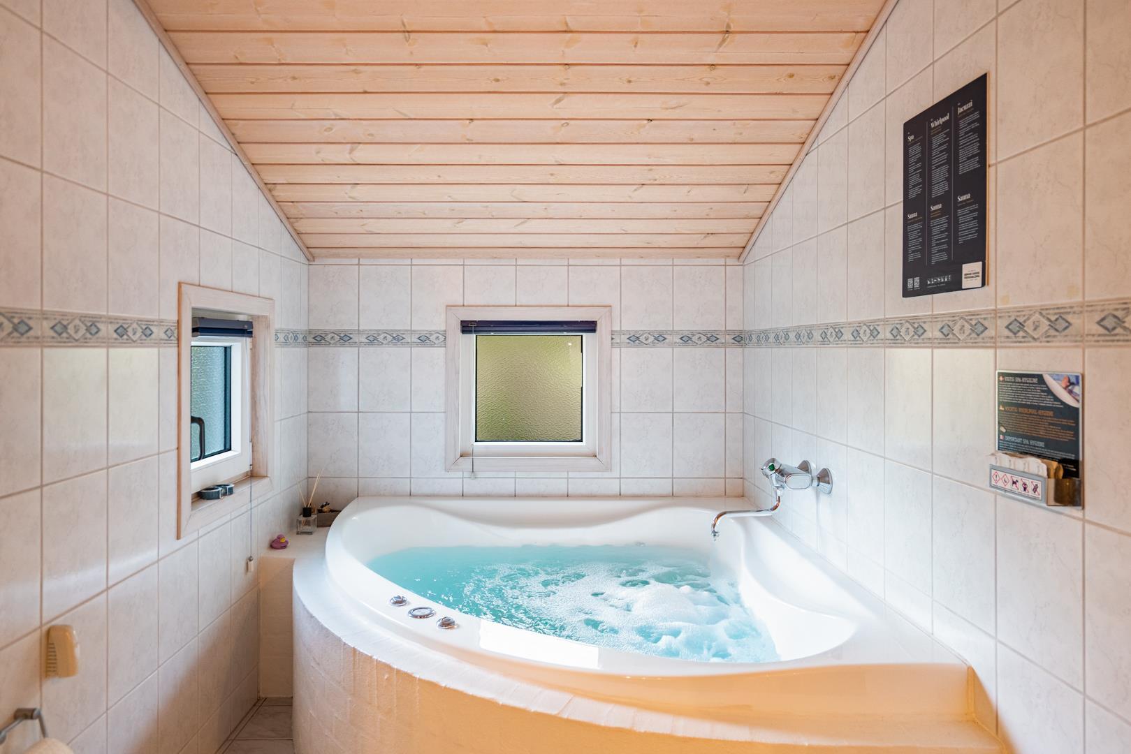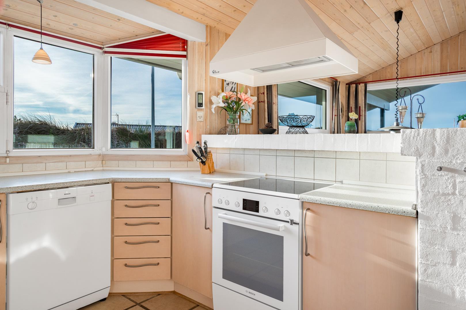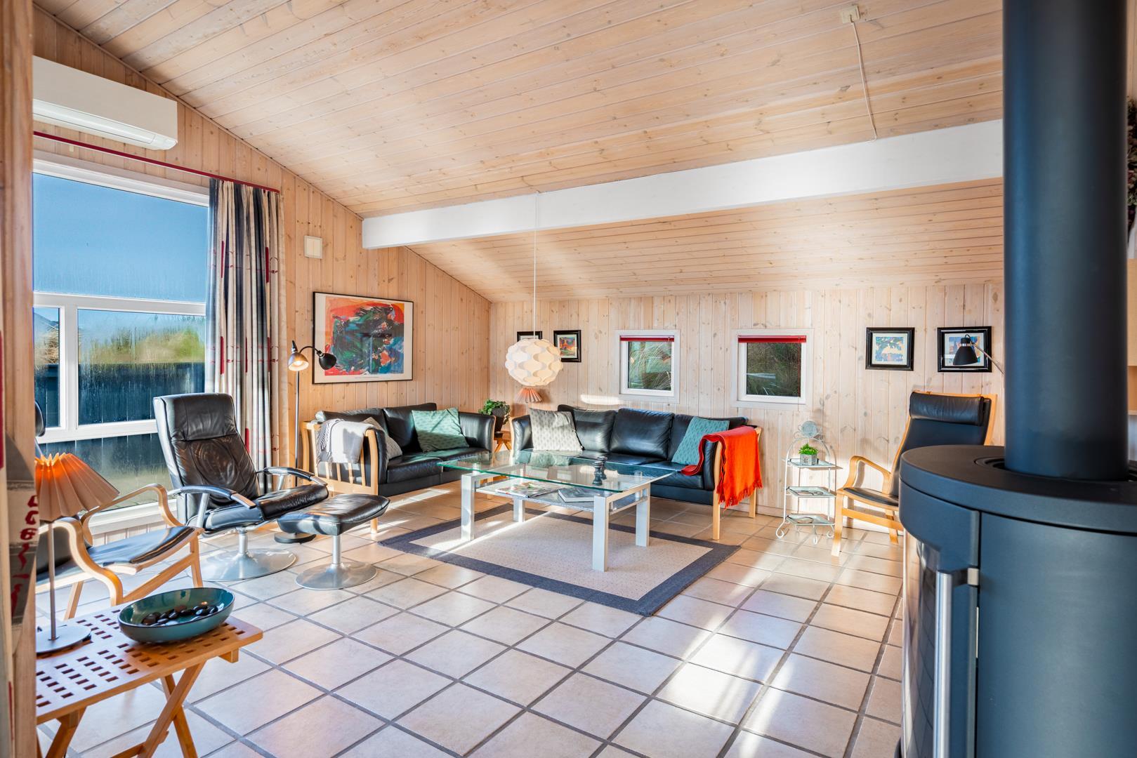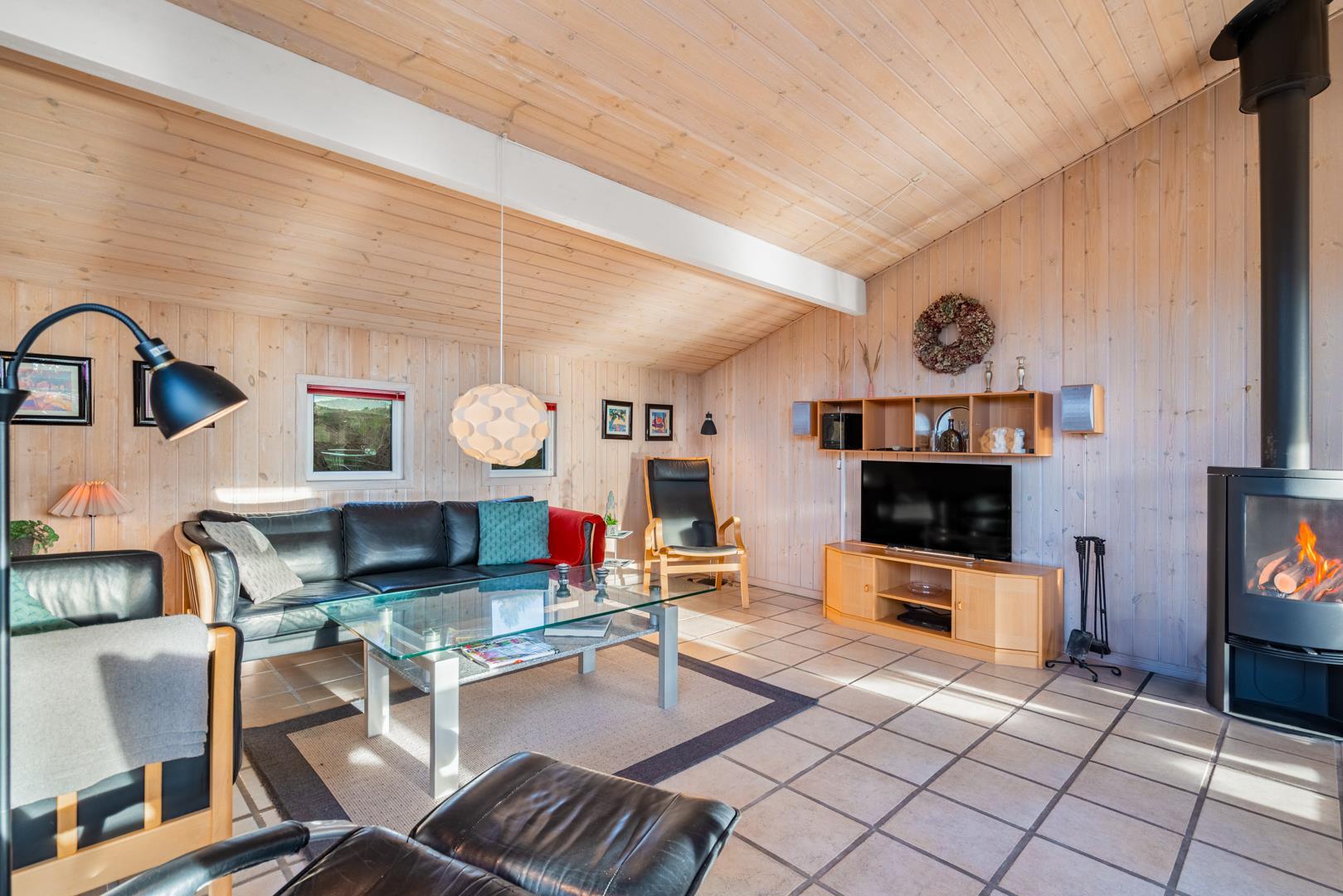 Huset rummer desuden et dejligt stort badeværelse med spabad og sauna samt vaskemaskine og tørretumbler. Udover et ekstra toilet har feriehuset en veludstyret køkken/alrum med opvaskemaskine og mikroovn. Stuen, der grænser op til køkken/alrummet, er pænt indrettet og har en hyggelig brændeovn der er med til at give den perfekte feriestemning.