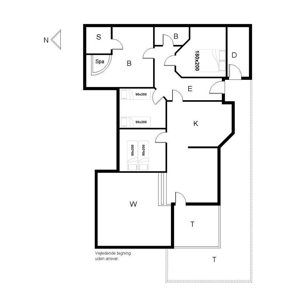 Sengestørrelse: 1 dobbeltseng med 2 madrasser 90 x 200 cm + 1 dobbeltseng 180 x 200 cm + 2 enkeltsenge 90 x 200 cm.